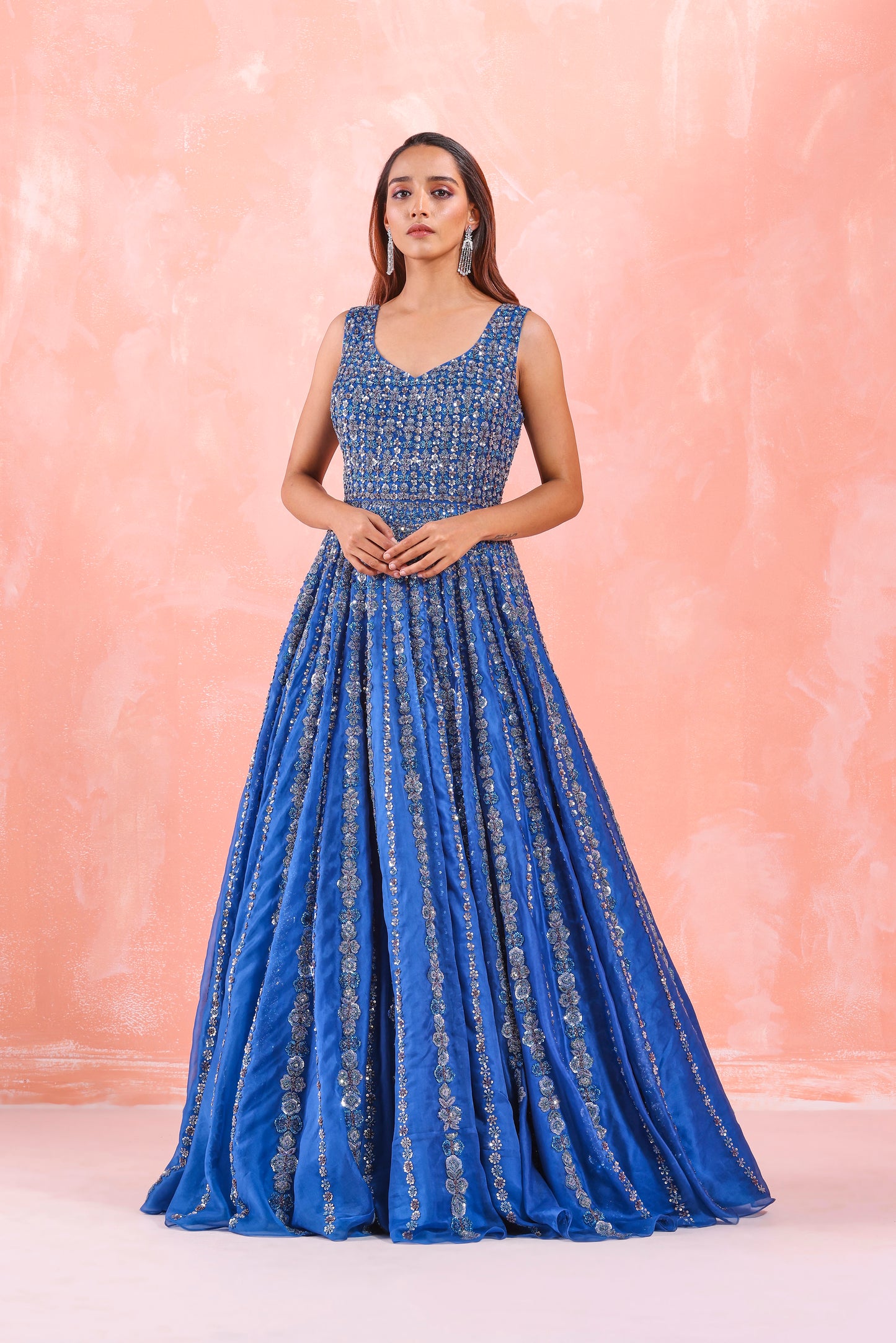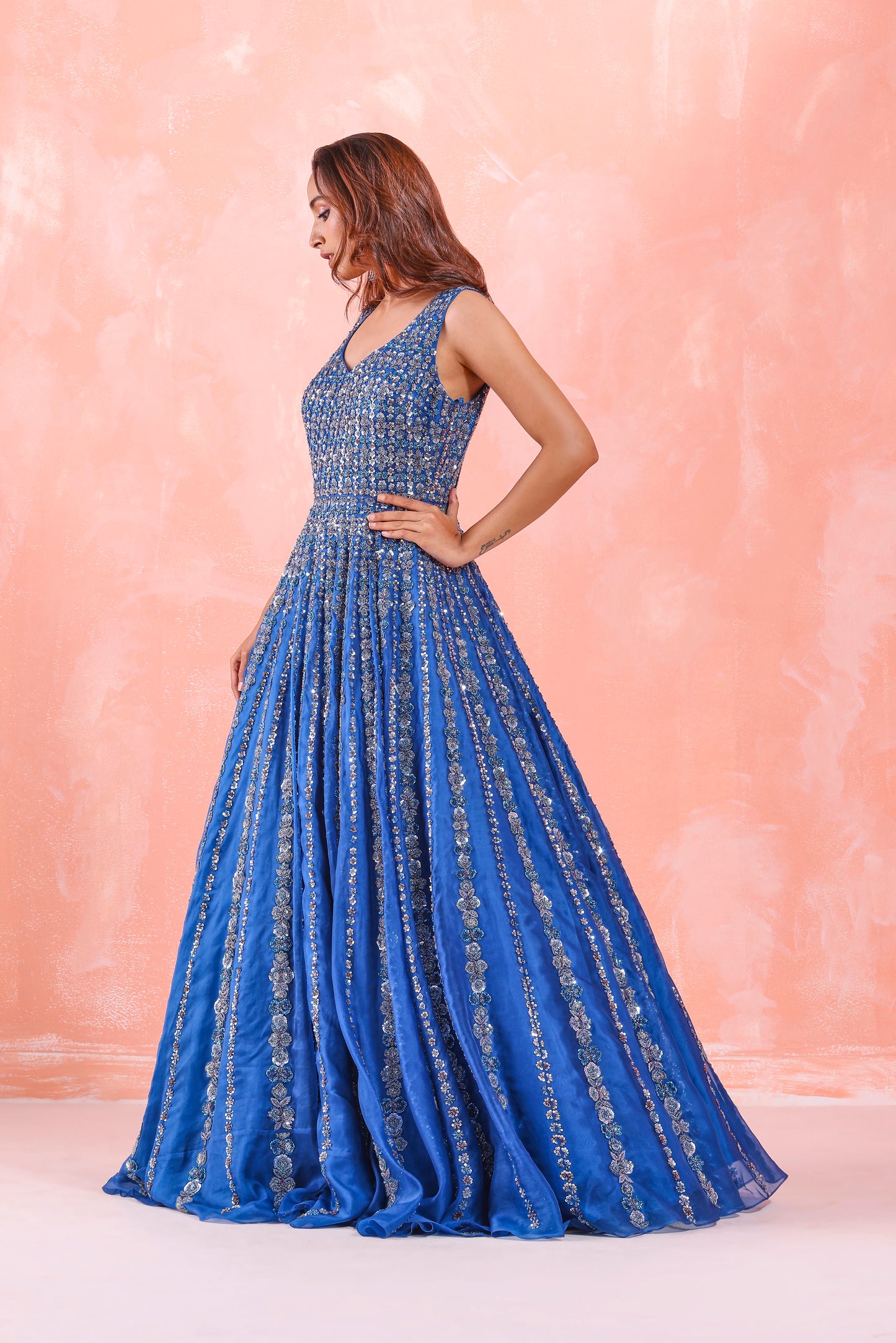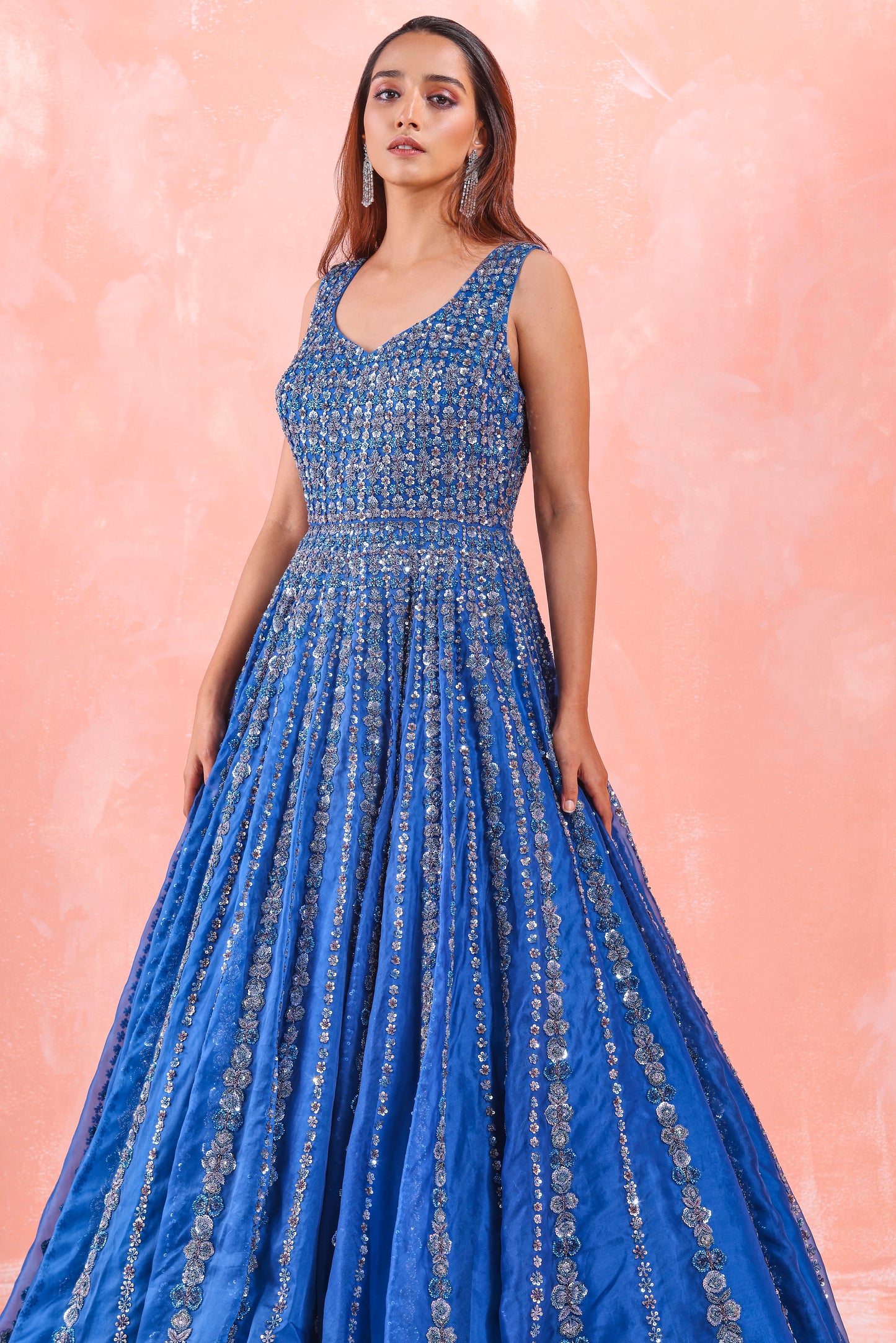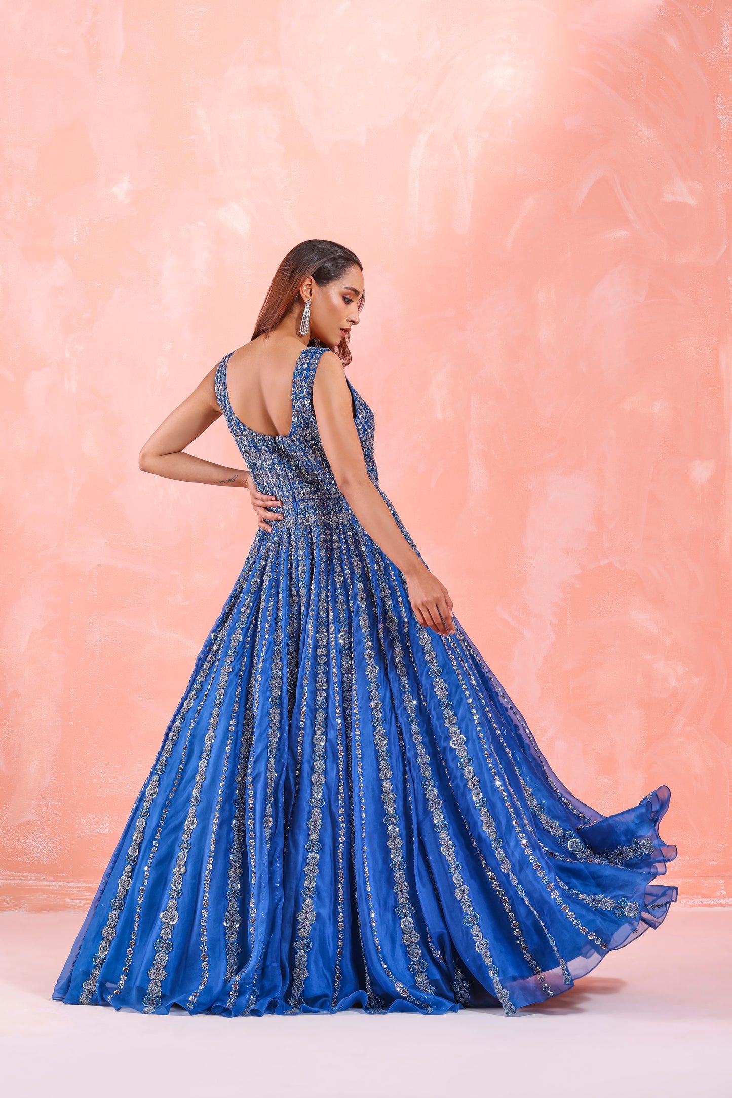 A Cobalt Blue Gown Set On Organza Features Contrasting Silver Sequins And Detailed Bead Embroidery.