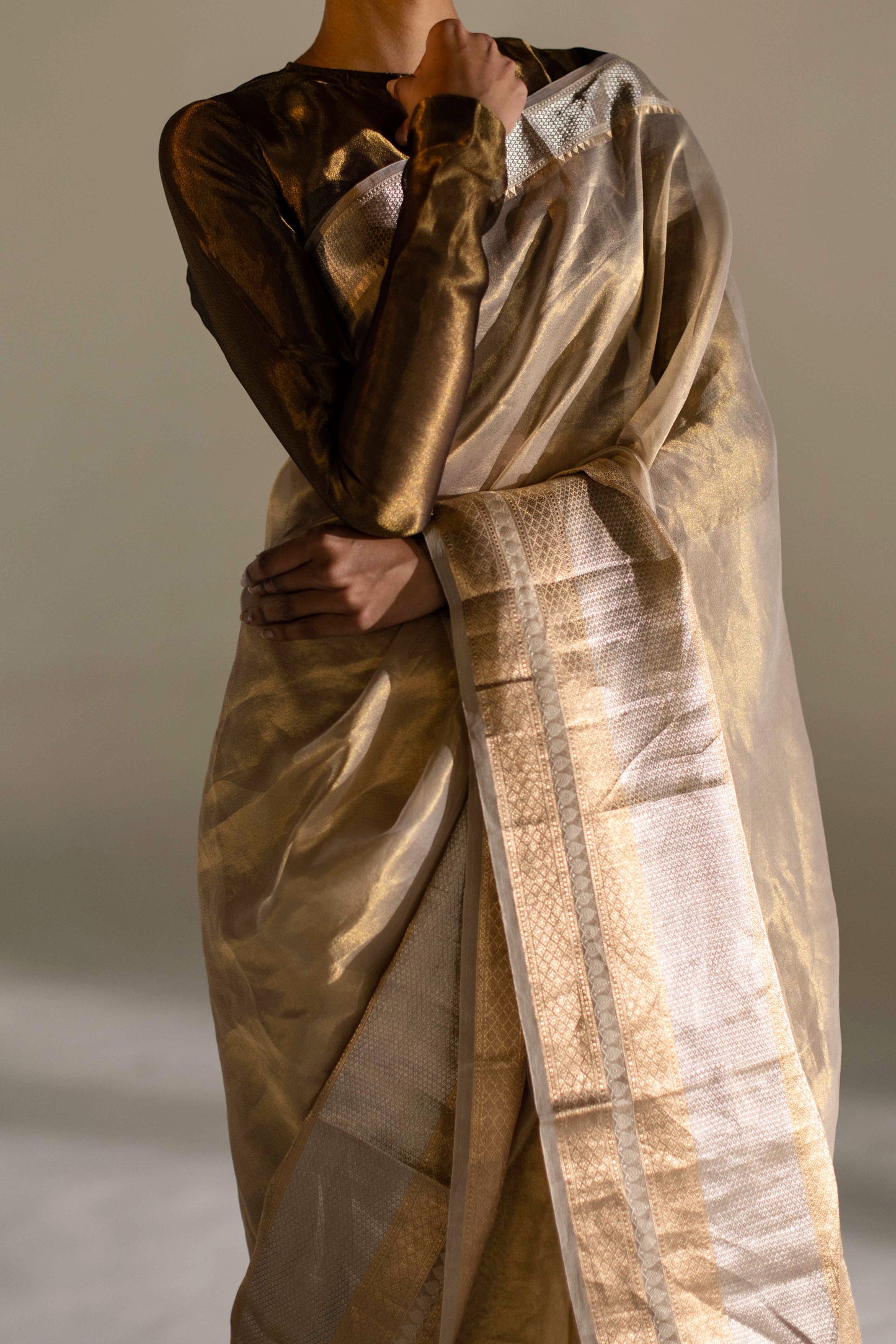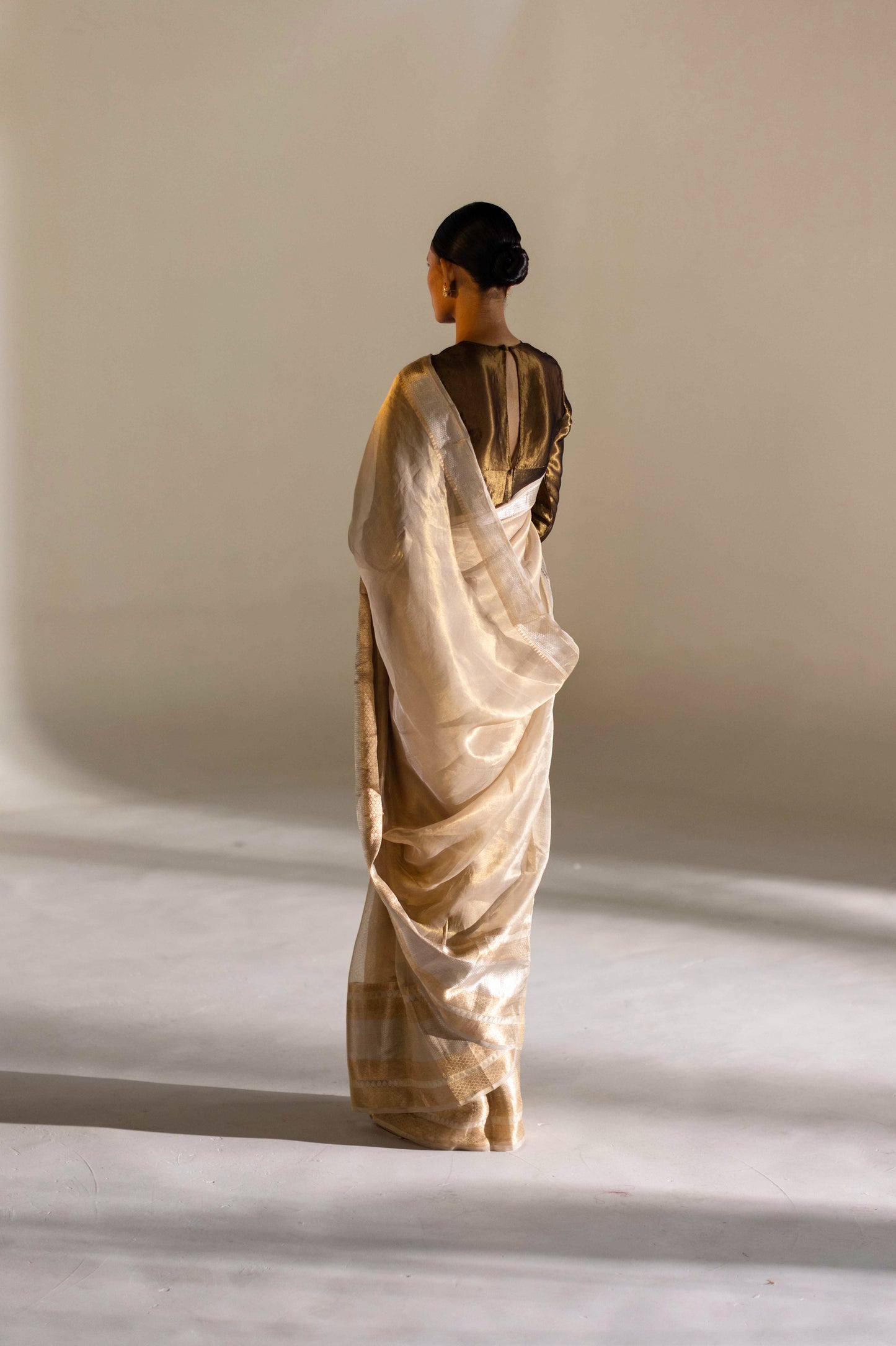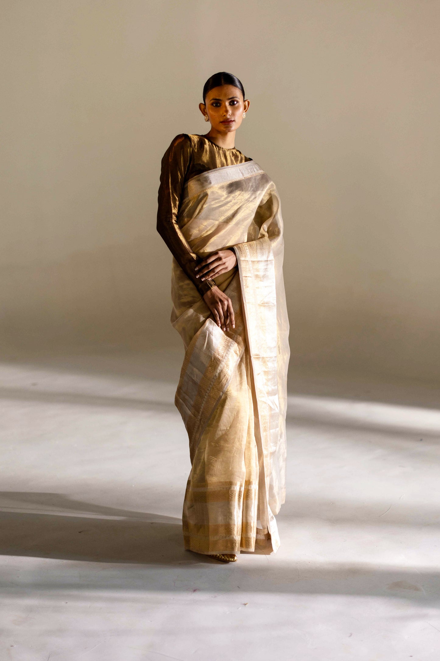 Woven In Tissue Silk, An Ivory Saree Paired With A Contrasting Charcoal Unstitched Blouse Epitomizes A Broad Border.