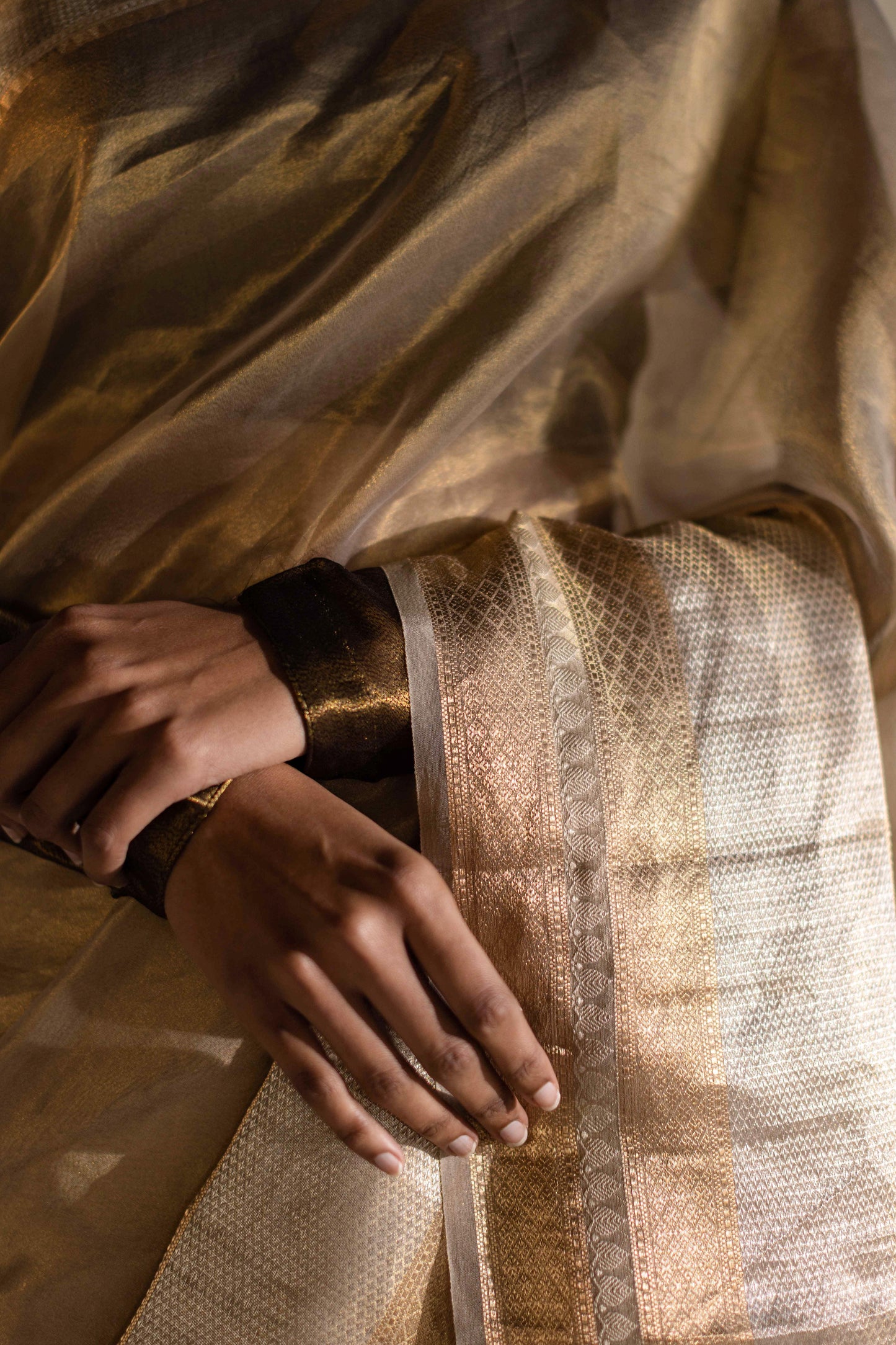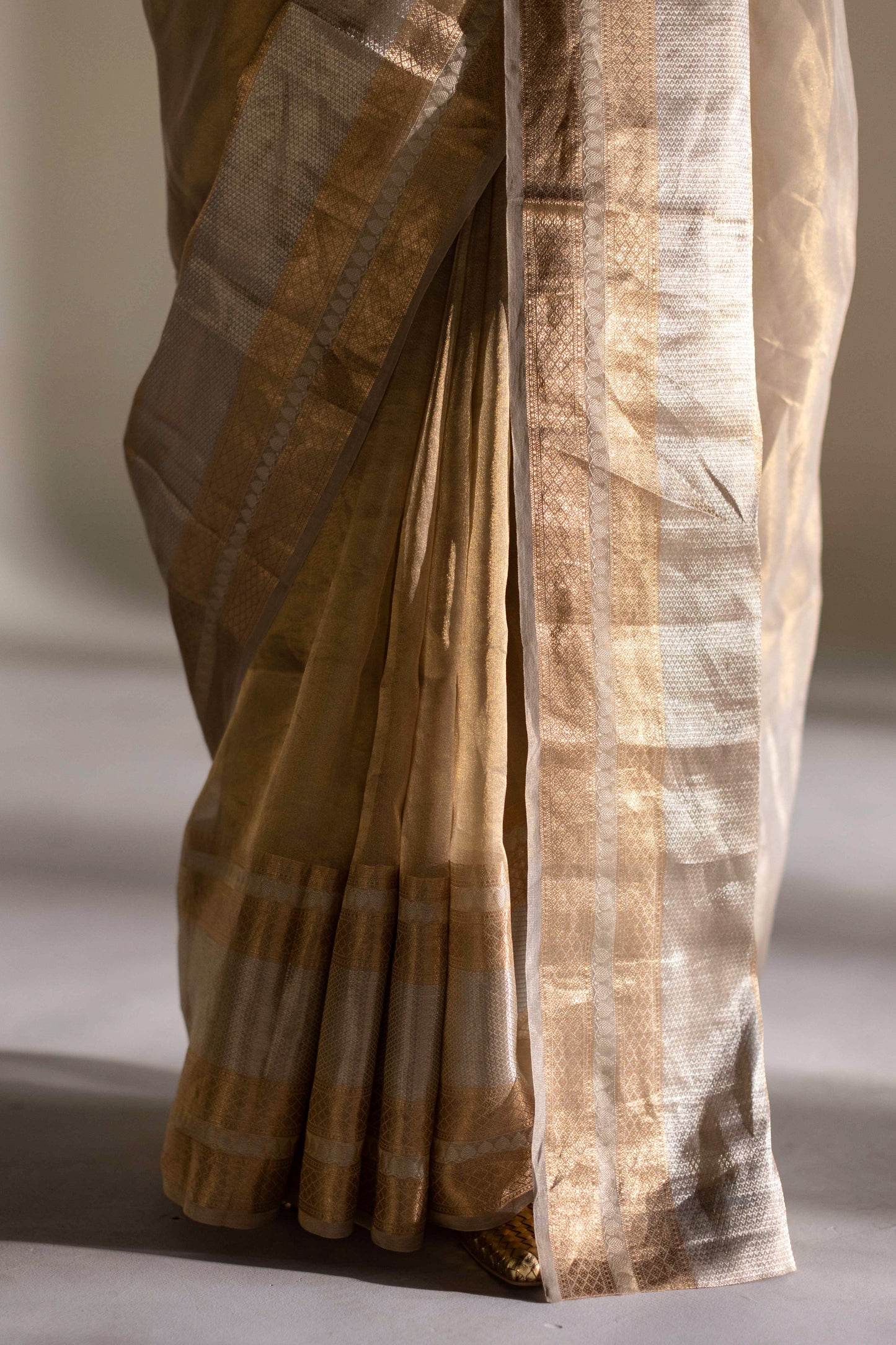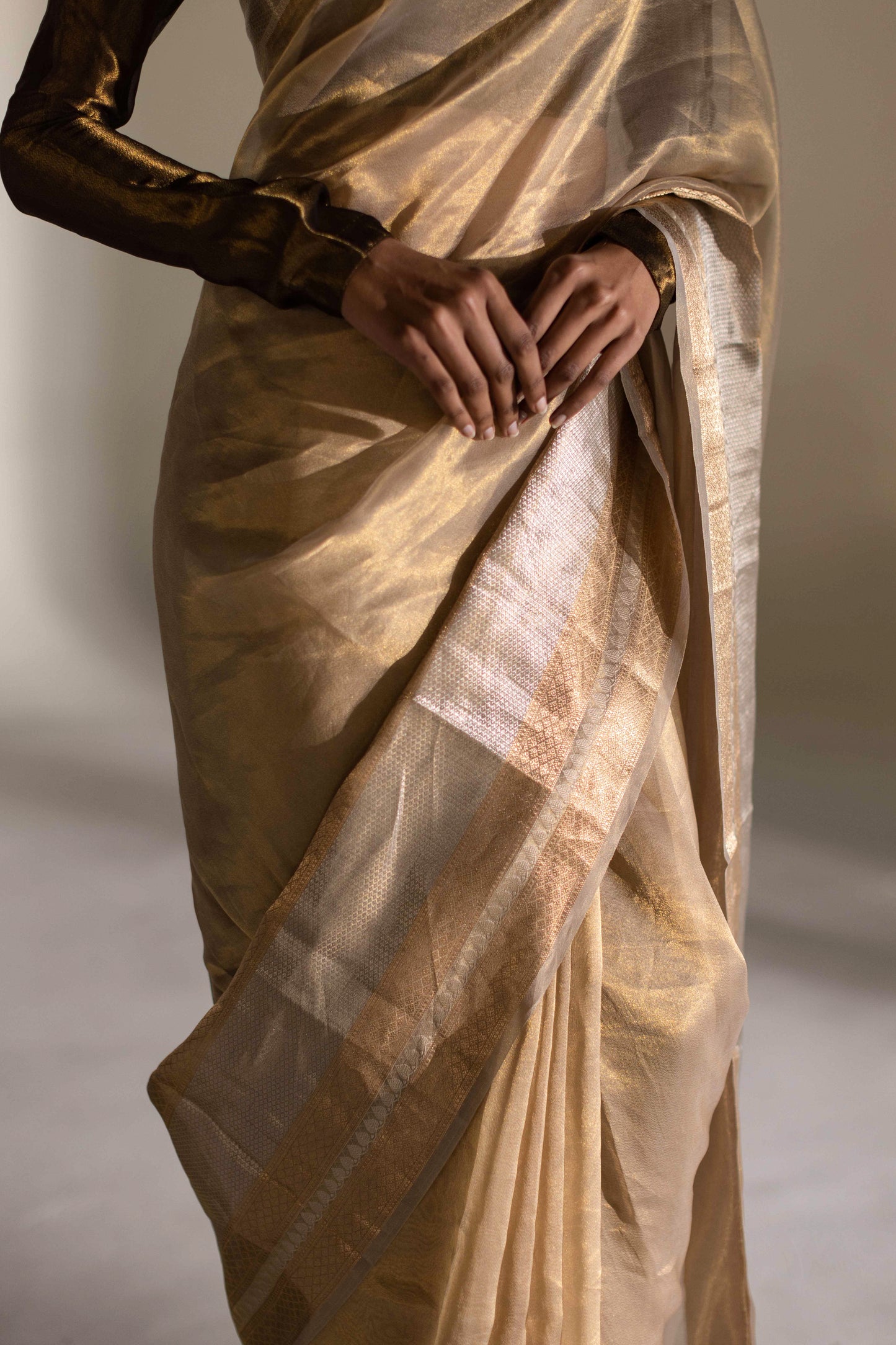 Woven In Tissue Silk, An Ivory Saree Paired With A Contrasting Charcoal Unstitched Blouse Epitomizes A Broad Border.