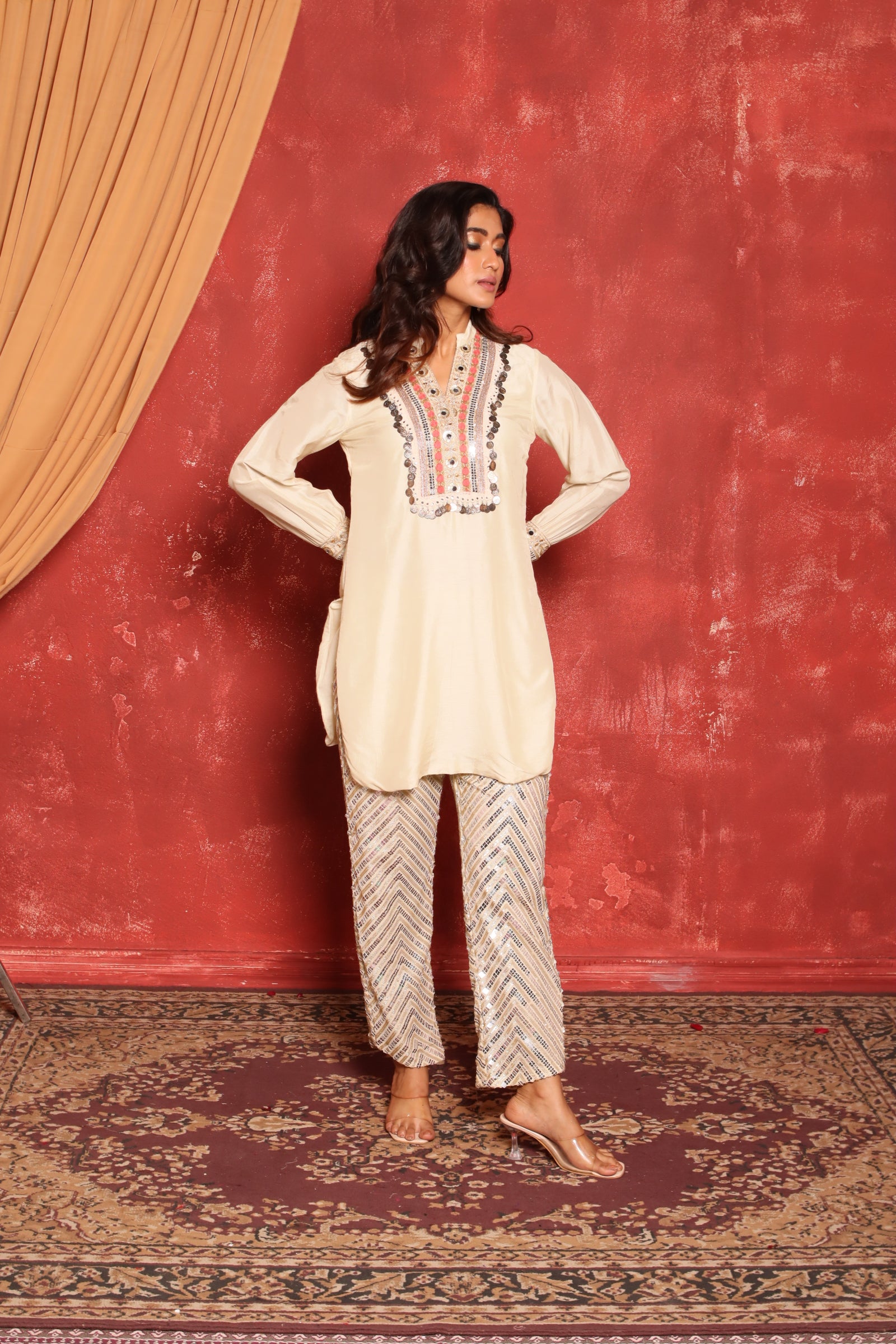 Glitter & Gold! Upgrade Your Wardrobe With This Stunning Pret Wear Set Featuring An Adorned Neckline & Dazzling Glitter Pants. It Is The Perfect Blend Of Comfort & Glam.