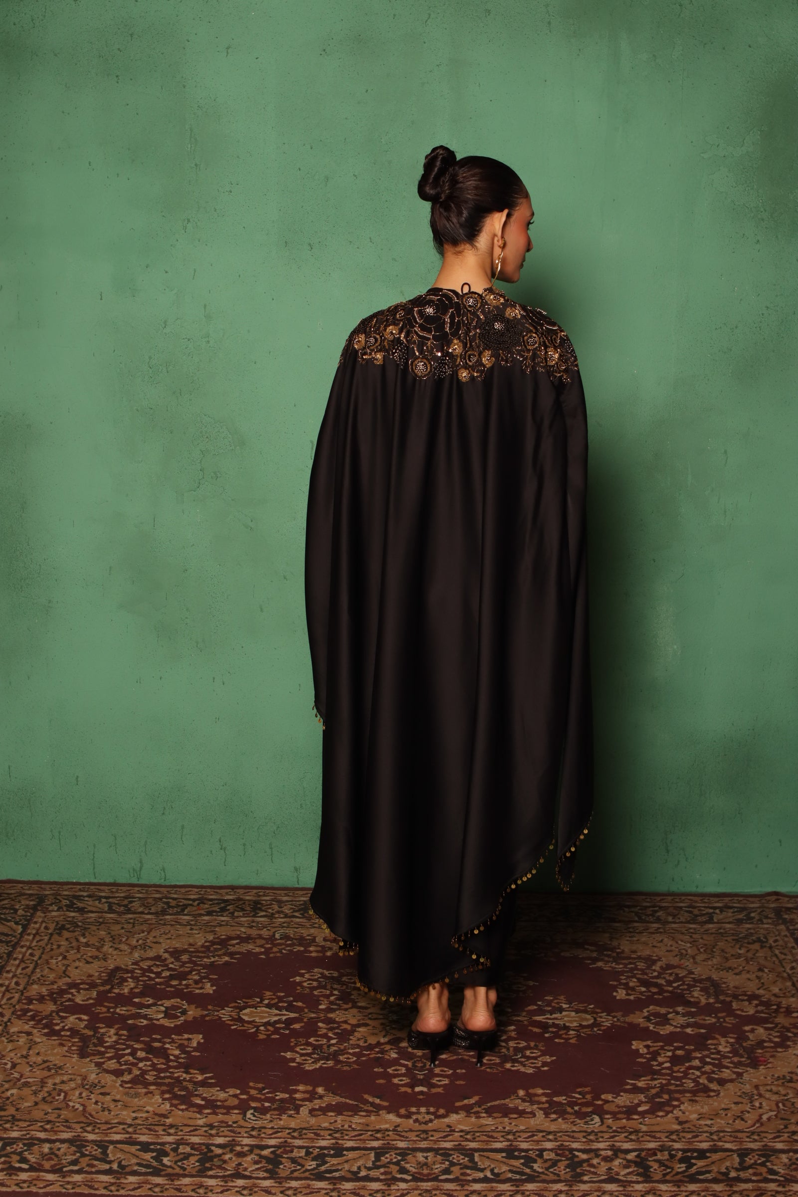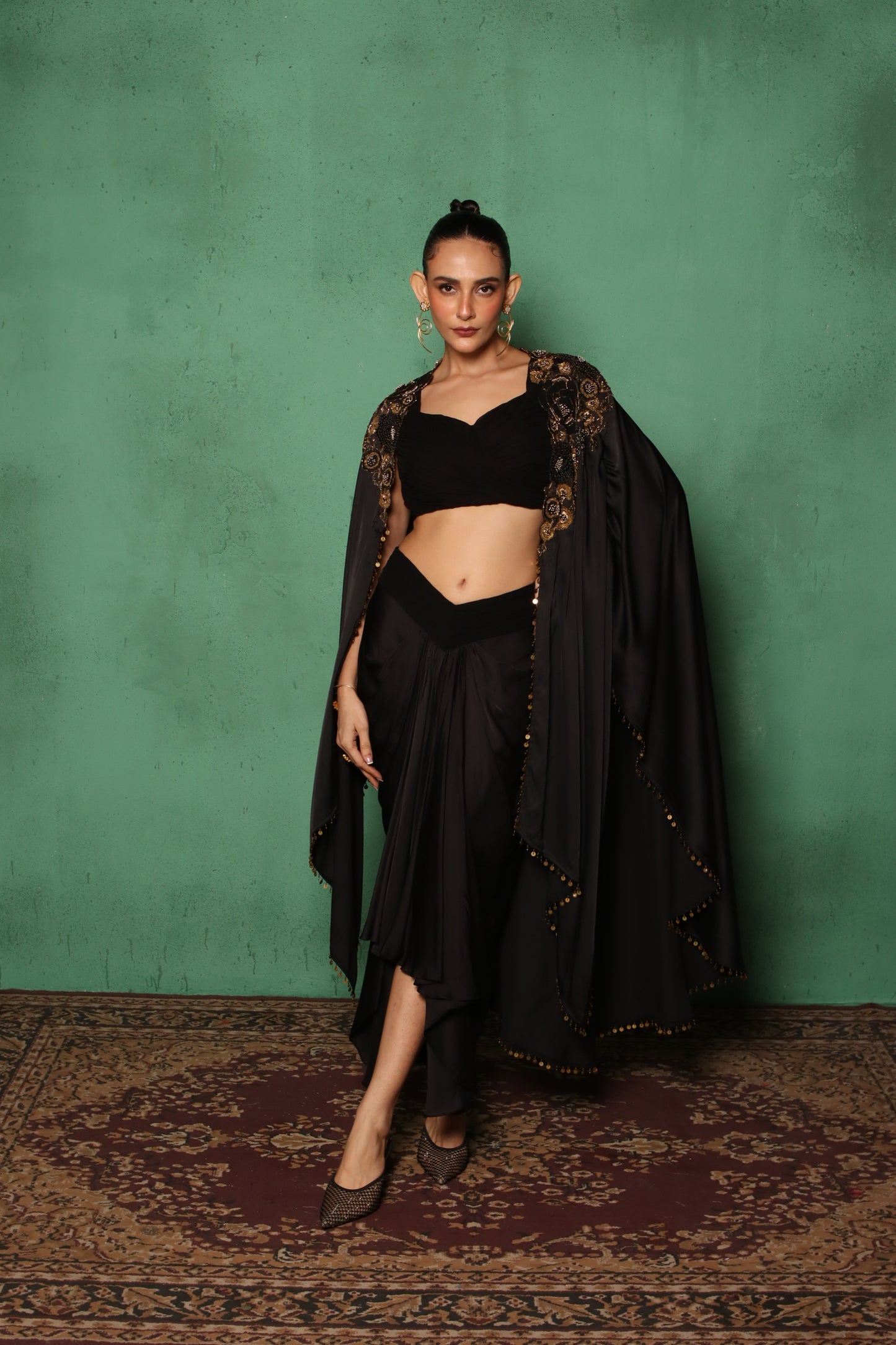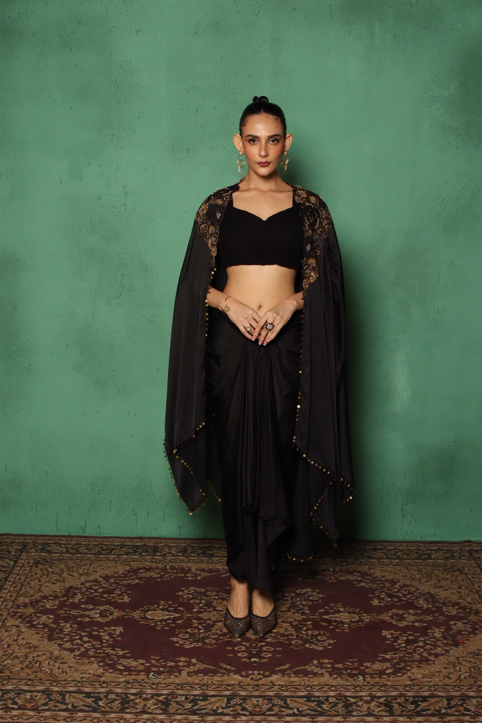 Artful Details Meet Contemporary Design! This Hot Black Kaftan Features Fine Embroidery On The Neck & Shoulders, A Flattering Ruched Blouse & A Dramatic Draped Skirt. Effortless Chic Redefined.