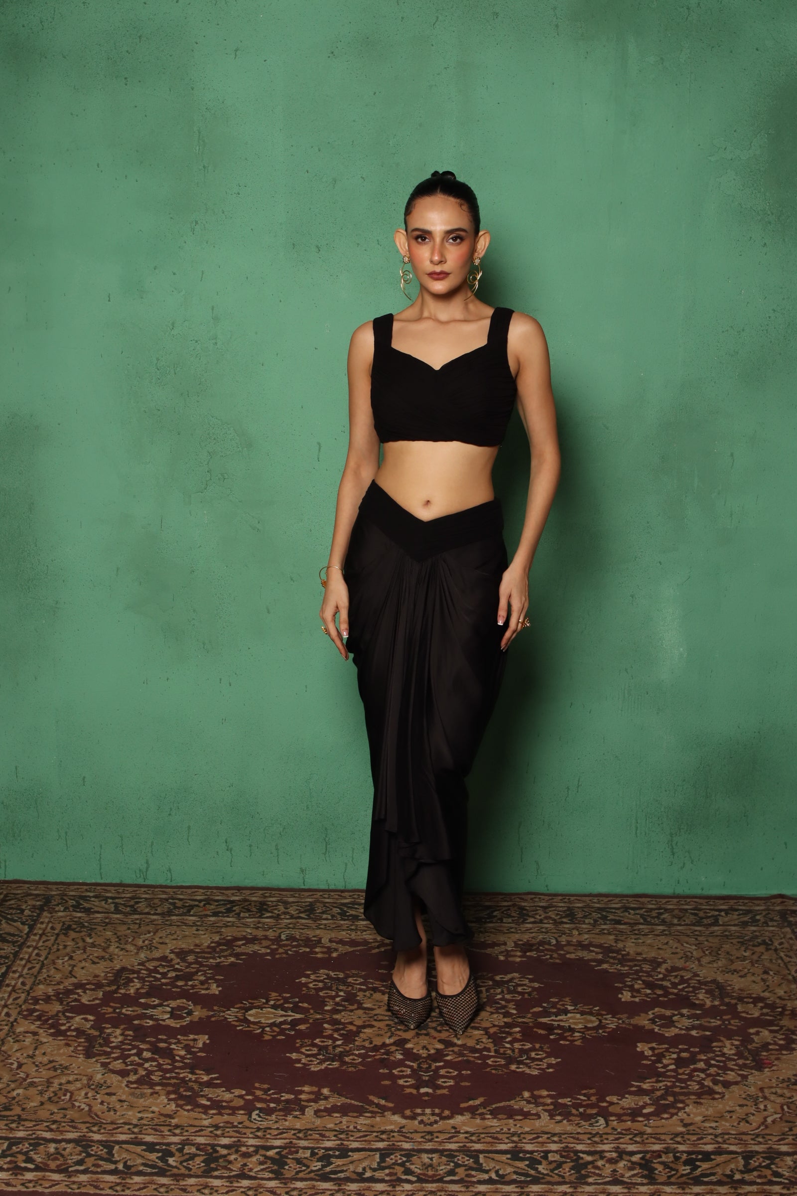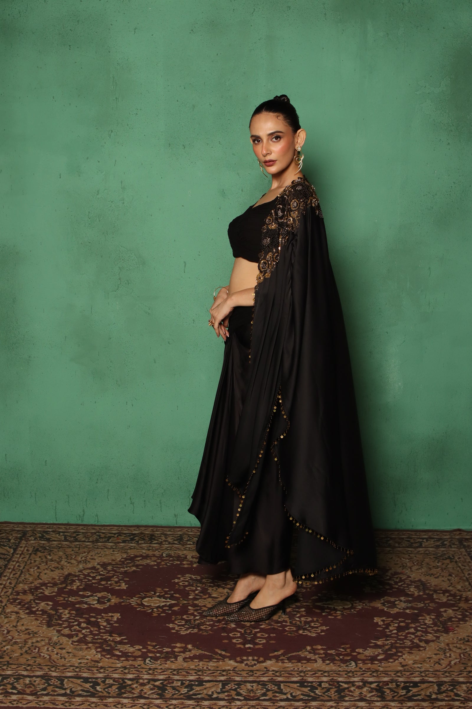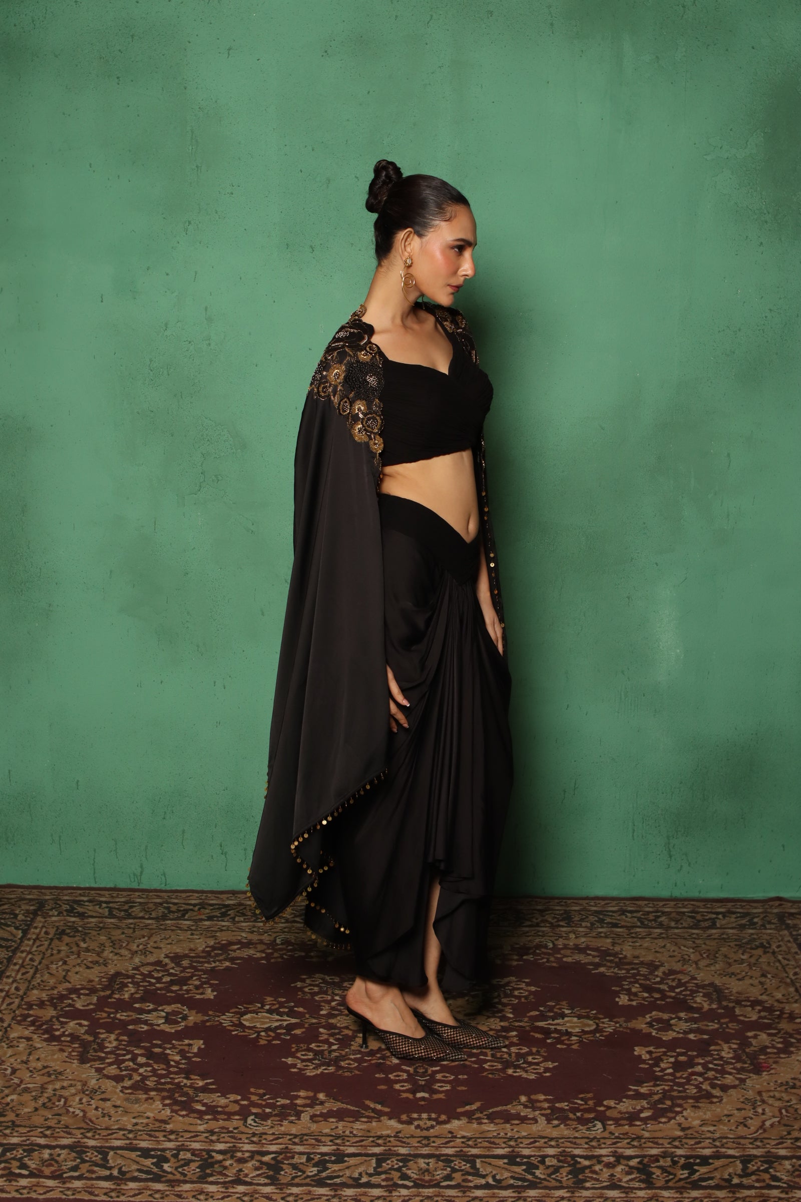 Artful Details Meet Contemporary Design! This Hot Black Kaftan Features Fine Embroidery On The Neck & Shoulders, A Flattering Ruched Blouse & A Dramatic Draped Skirt. Effortless Chic Redefined.