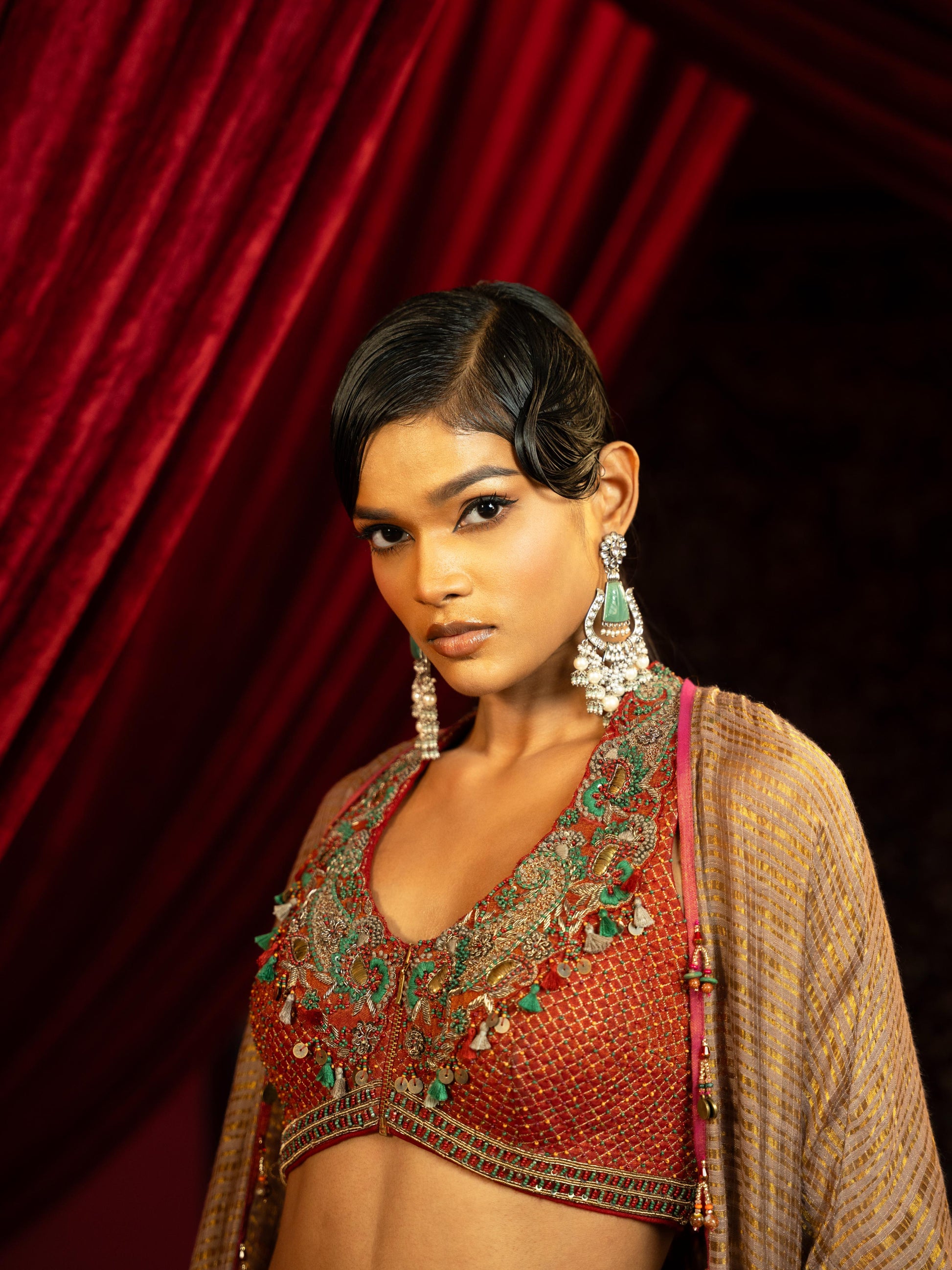 CRIMSON RED QUILTED BLOUSE WITH BOX PLEATED PANTS & SEPIA BROWN CAPE