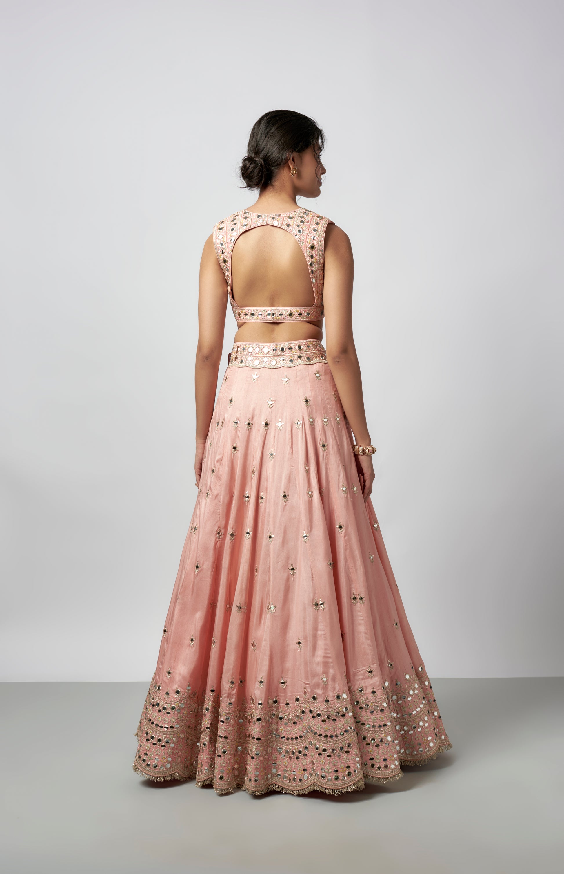 This Enchanting Lehenga Set Features An Intricate Mirror And Sequin Embellishment. The Blouse Showcases A Deep V-Neck With Delicate Embroidery, Paired With A Flowing Lehenga Skirt Adorned With An Elegant Border. The Organza Dupatta With Shimmering Details, Completes The Look.