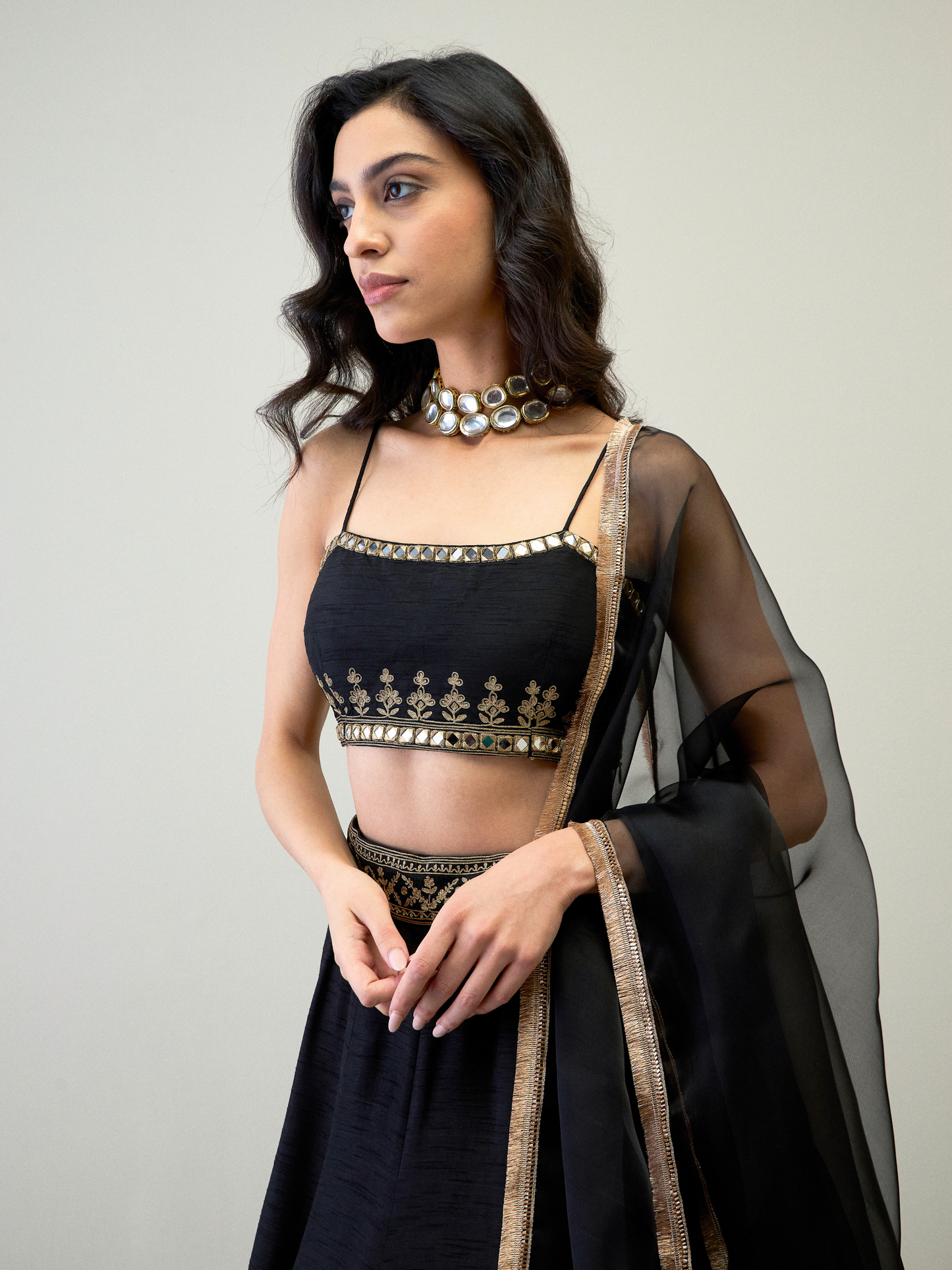 At The Core Lies The Exquisite Noodle-Strap Bustier, A Modern Marvel Adorned With Intricate Embroidery. Golden Threads Intertwine With Shimmering Mirrors And Hand-Sewn Golden Coins. Complementing The Bustier Is The Embroidered Dupatta. And Then There's The Lehenga Skirt, Flowy And Feminine, It Drapes Elegantly With Hand-Sewn Sequins At The Bottom.