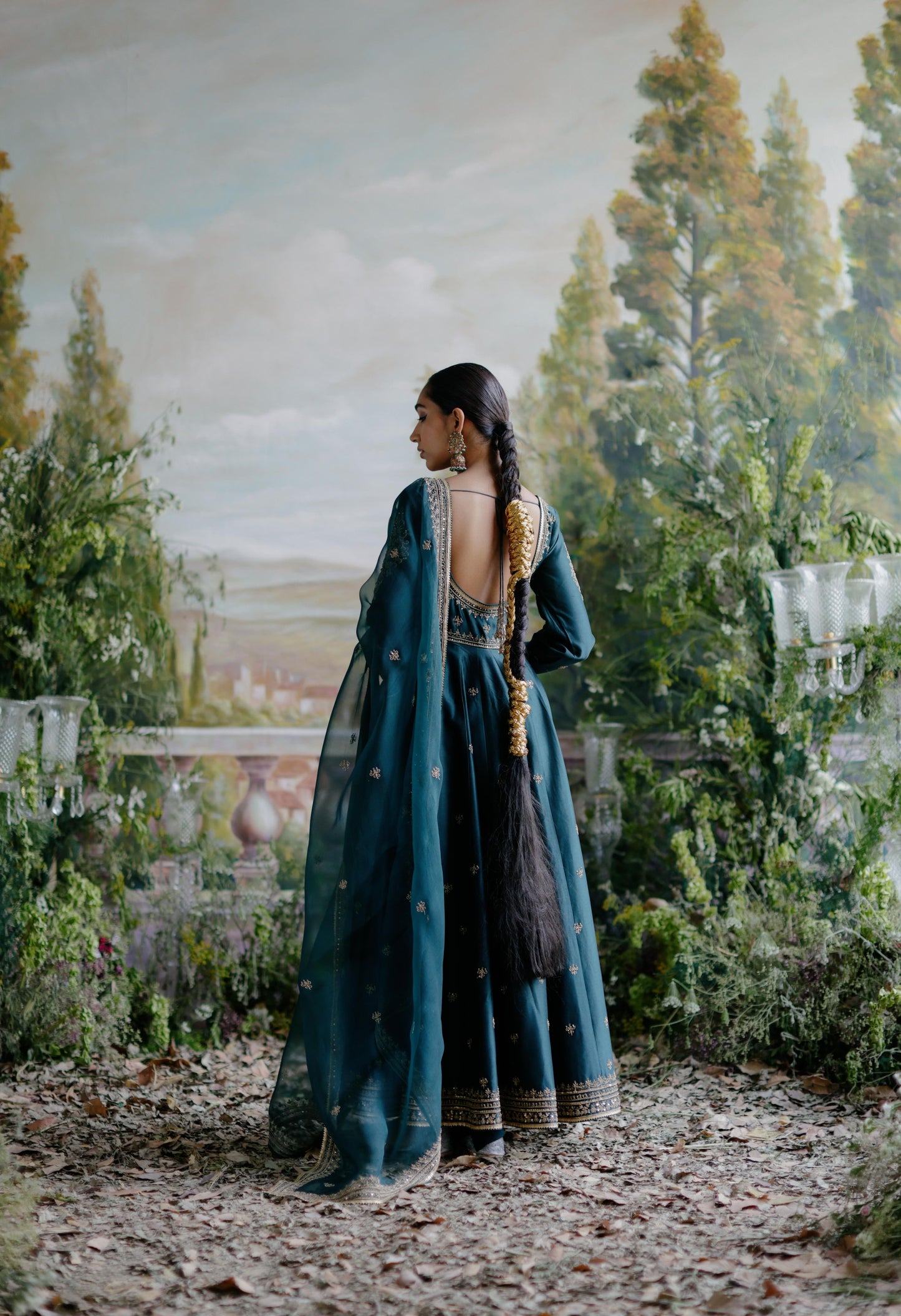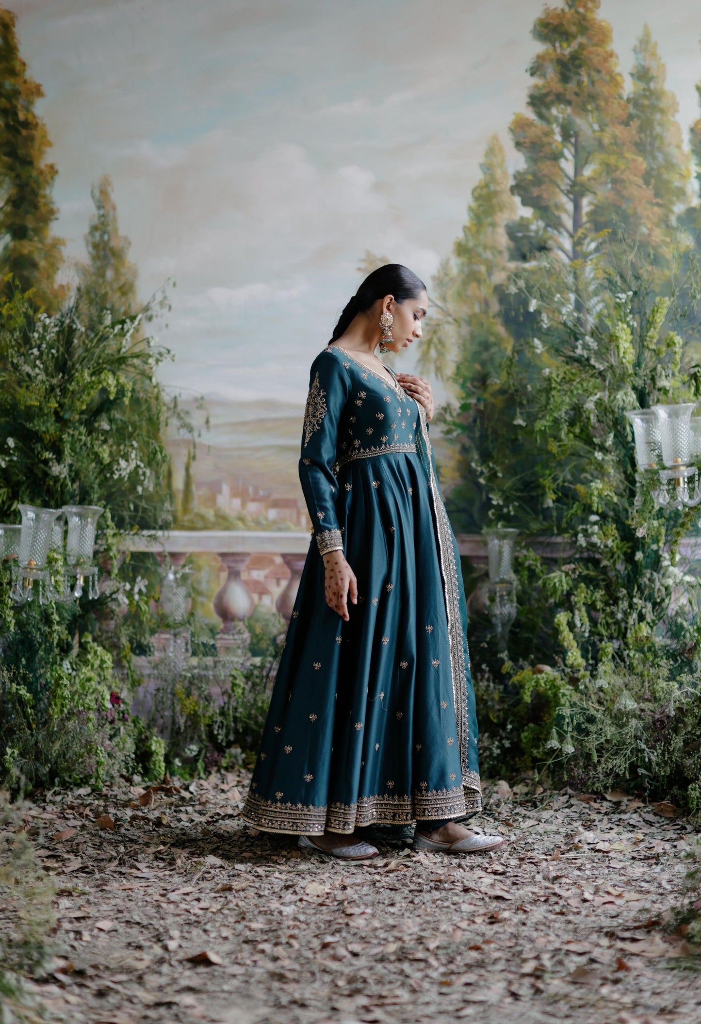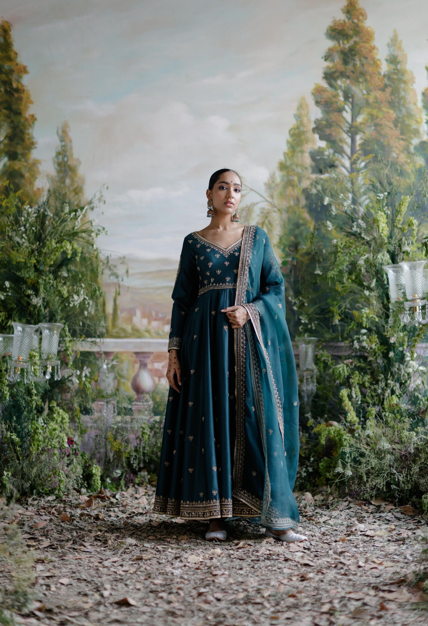 This Ensemble Is A Celebration Of Rich Colours And Traditional Charm, Designed To Make A Striking Statement On Special Occasions. Adorned With Delicate Aari Embroidery And Antique Gold Dori, The Chanderi Silk Anarkali And Organza Dupatta Pays Homage To The Rich Heritage Of Indian Craftsmanship. The Deep Green Hue Exudes An Air Of Regal Elegance And Charm, Making It An Ideal Choice For A Range Of Celebrations. Whether You'Re Attending A Wedding, A Cultural Event, Or A Special Celebration, The Dark Green Anarkali Set Will Ensure You Shine With Timeless Elegance And Enduring Allure.