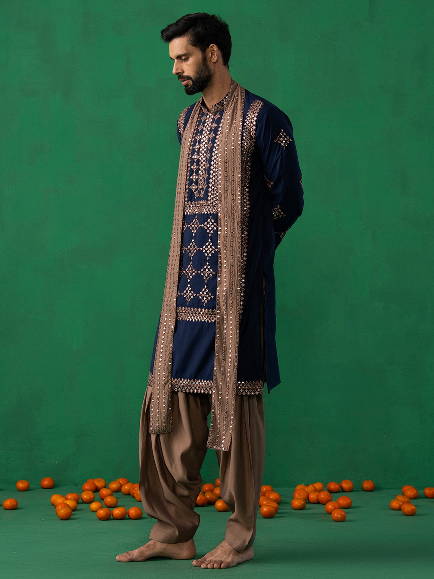 This Striking Ensemble Is Perfect For Festive And Wedding Wear. It Features A Long-Sleeved Kurta With A Prominent, Geometric-Style Embroidery And Intricate Mirror Work Detailing On The Front And Sleeves. Paired With The Traditional Drape Of Patiyala Trousers, The Outfit Is Completed With A Slim Stole. The Stole Itself Is A Statement Piece, Densely Adorned With A Parallel Arrangement Of Mirror Work, Creating A Linear, Modern Accent That Stands Out Against The Rich Texture Of The Kurta.