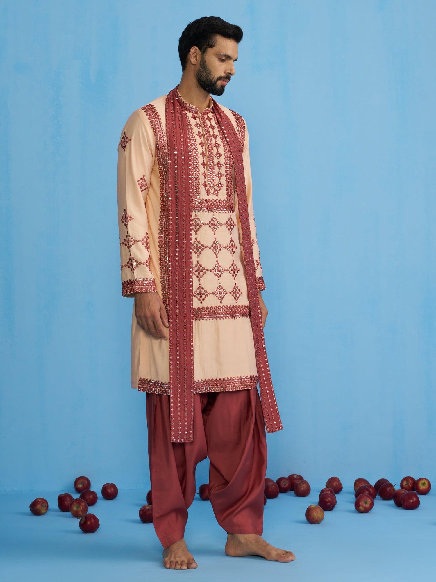 This Striking Ensemble Is Perfect For Festive And Wedding Wear. It Features A Long-Sleeved Kurta With A Prominent, Geometric-Style Embroidery And Intricate Mirror Work Detailing On The Front And Sleeves. Paired With The Traditional Drape Of Patiyala Trousers, The Outfit Is Completed With A Slim Stole. The Stole Itself Is A Statement Piece, Densely Adorned With A Parallel Arrangement Of Mirror Work, Creating A Linear, Modern Accent That Stands Out Against The Rich Texture Of The Kurta.