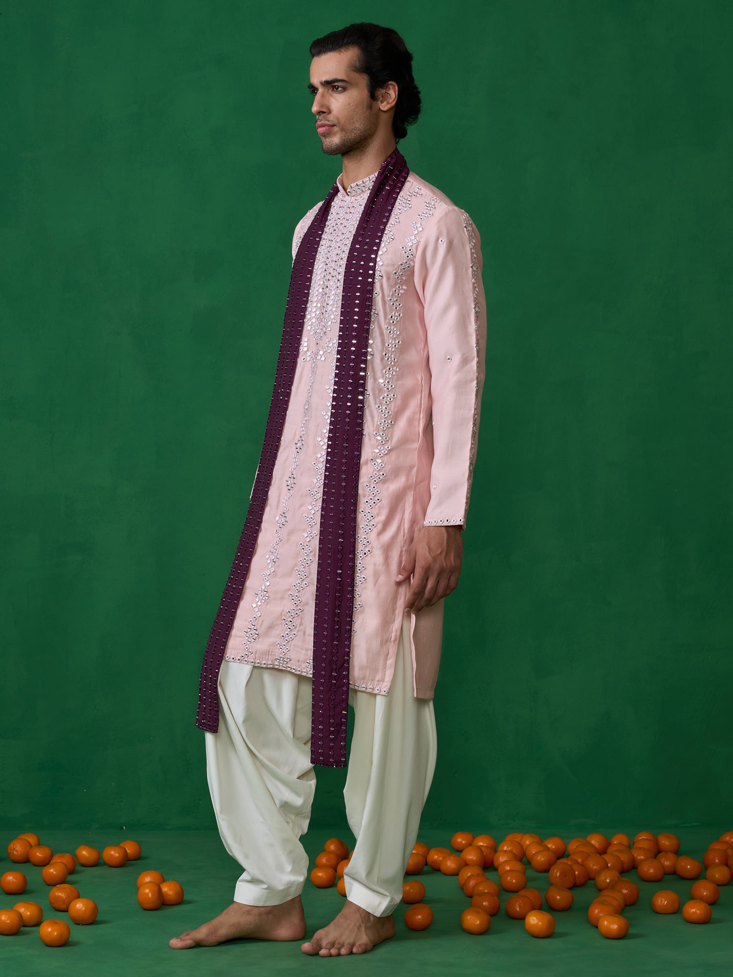This Striking Ensemble Is Perfect For Festive And Wedding Wear. It Features A Long-Sleeved Kurta With A Prominent, Geometric-Style Embroidery And Intricate Mirror Work Detailing On The Front And Sleeves. Paired With The Traditional Drape Of Patiyala Trousers, The Outfit Is Completed With A Slim Stole. The Stole Itself Is A Statement Piece, Densely Adorned With A Parallel Arrangement Of Mirror Work, Creating A Linear, Modern Accent That Stands Out Against The Rich Texture Of The Kurta.