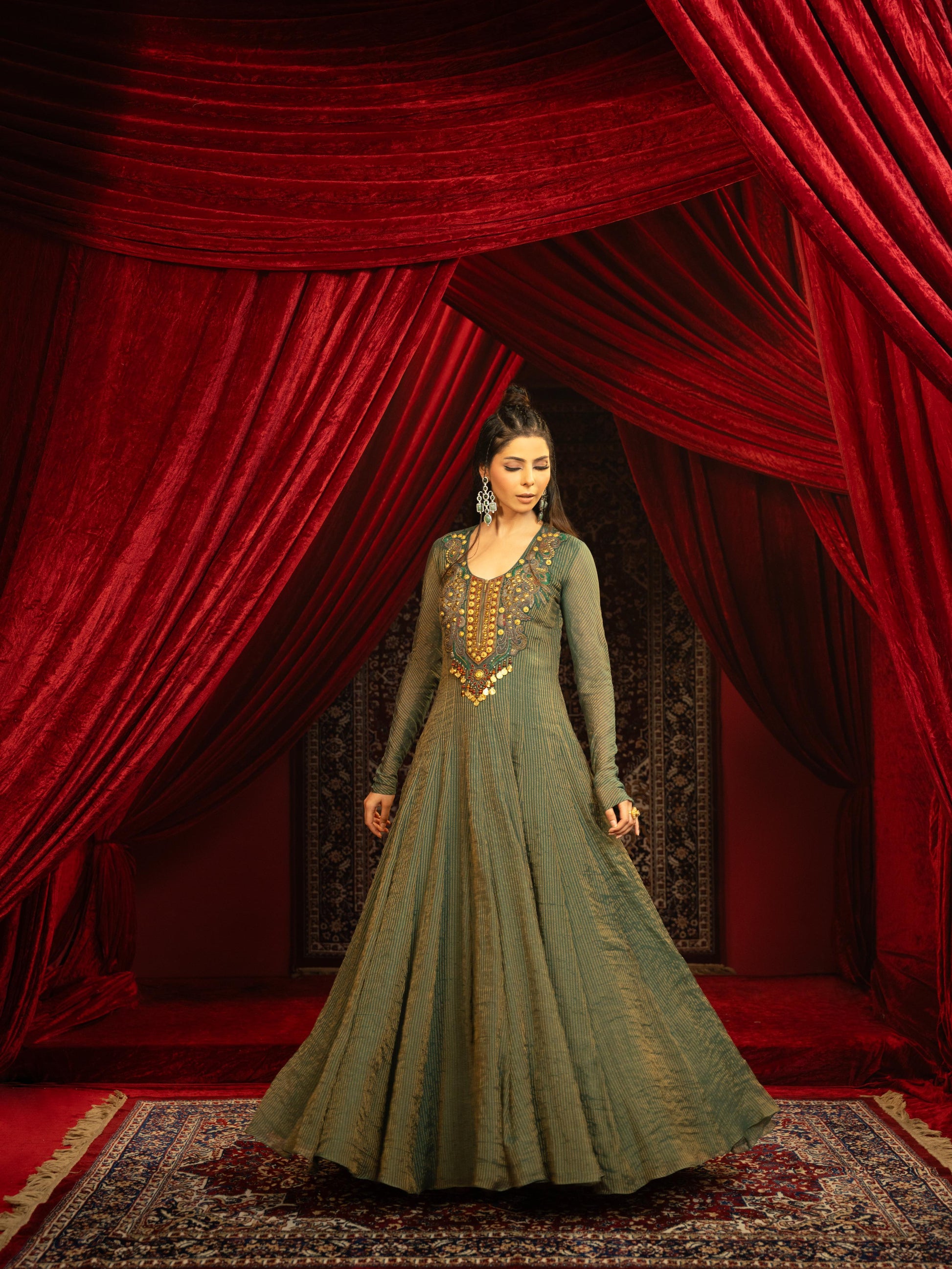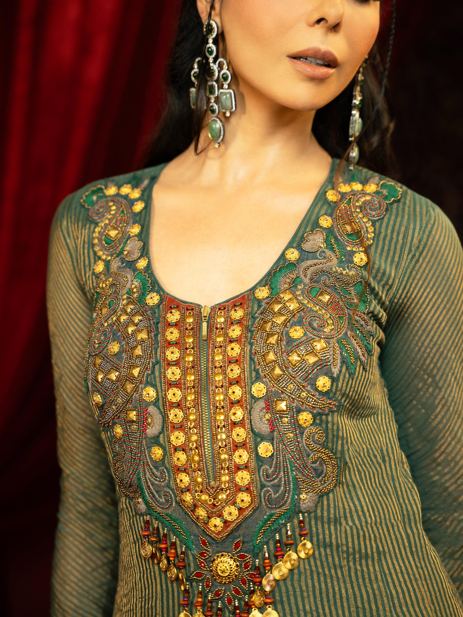 Celebrate Festive Grace With This Long, Flowy Deep Forest Green Anarkali, Featuring A Heavy Vintage Metal Embroidery On The Yoke And A Front Metal Zipper For A Contemporary Touch. It’s Paired With A Matching Dupatta Adorned With Metal Embroidery Motifs And Playful Tassels Along The Edges. Made From Luxurious Chanderi Stripe And Full Gold Chanderi Tissue, And Lined With Soft Shantoon Fabric, This Ensemble Brings Together Rich Textures And Intricate Detailing For Weddings, Festivals, And Special Celebrations.