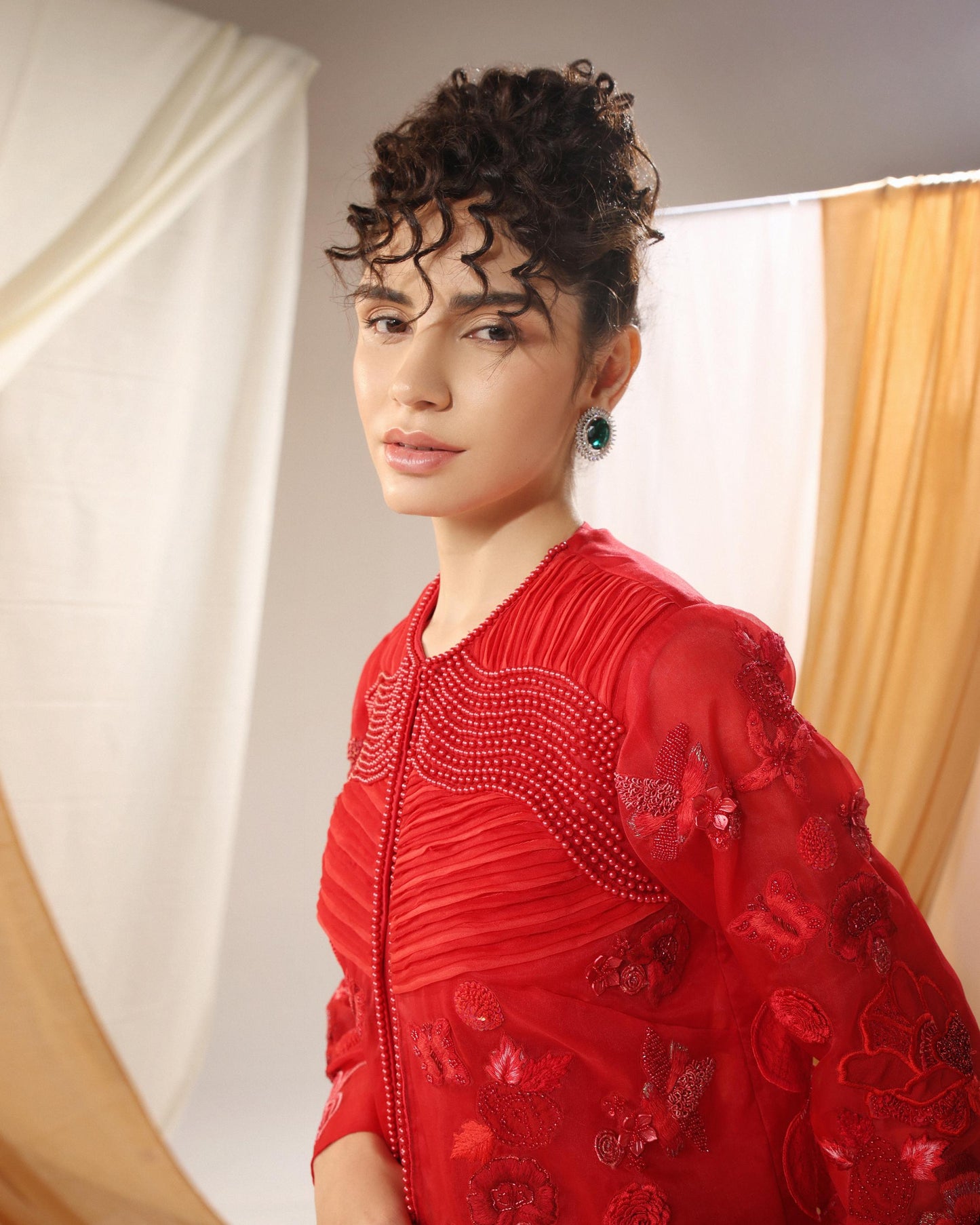 Scarlet Red Draped Dress With Embroidered Cape. Cape Is Accentuated By Using The World Of Techniques 3D Flowers, Appliqued Fabrics, Moti And Tiny Glass Beads. They Are All Brought Together By Using Artisan Techniques Such As Badla, Zardozi, And Pita Work.