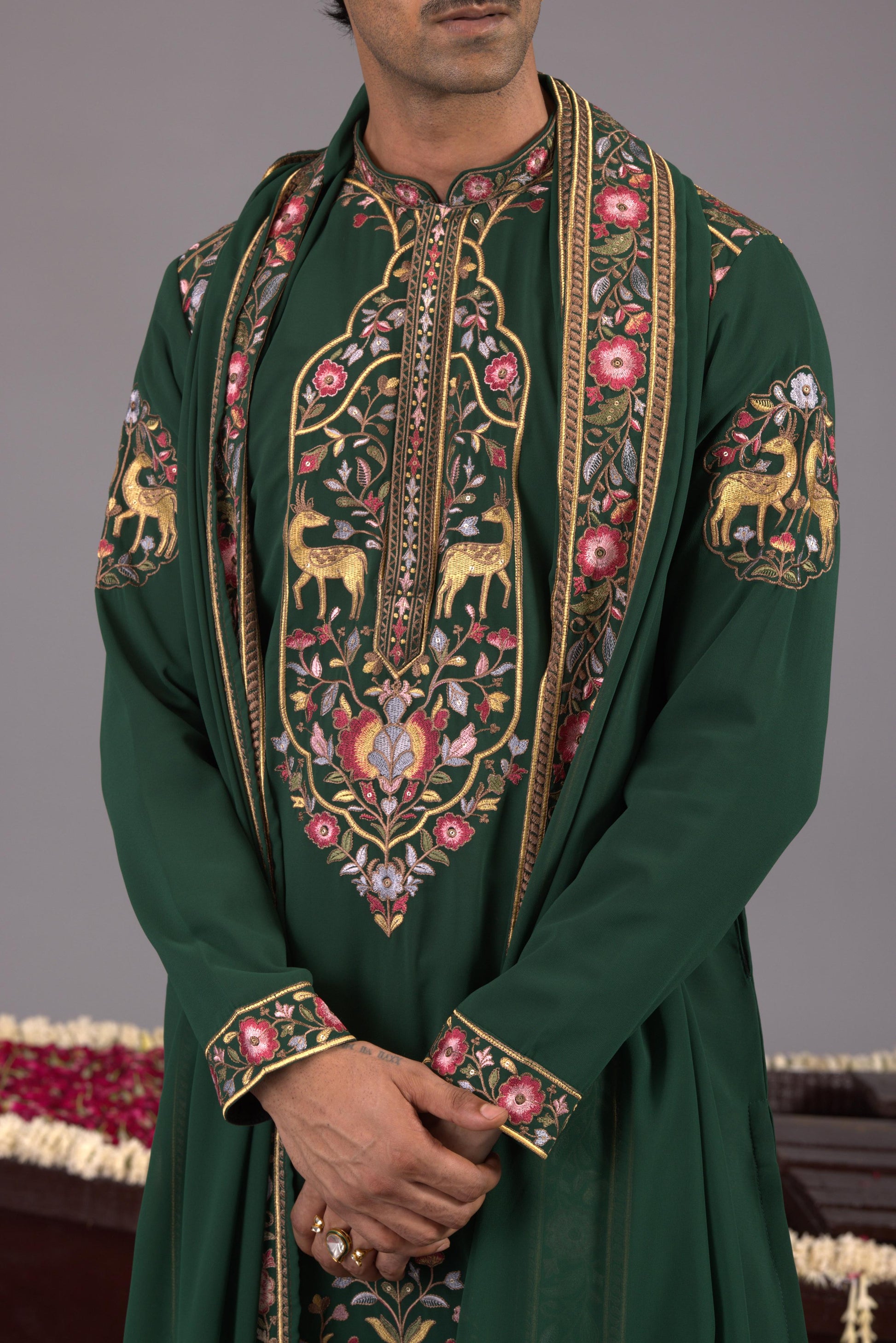 This Kurta Set Unfolds Like A Page From An Old Forest Fable — Where Regal Craft And Quiet Wilderness Meet. The Feels Like Walking Through A Dense Grove At Dawn — Calm, Timeless, And Alive With Secret Beauty. Its Surface Is Adorned With Delicate Embroidery: Fine Vines And Blooming Florals Twist And Turn Across The Fabric, And Tucked Within This Garden, Tiny Embroidered Deer Appear — Like Gentle Guardians Of An Enchanted Woodland, Adding A Whimsical Yet Noble Charm.