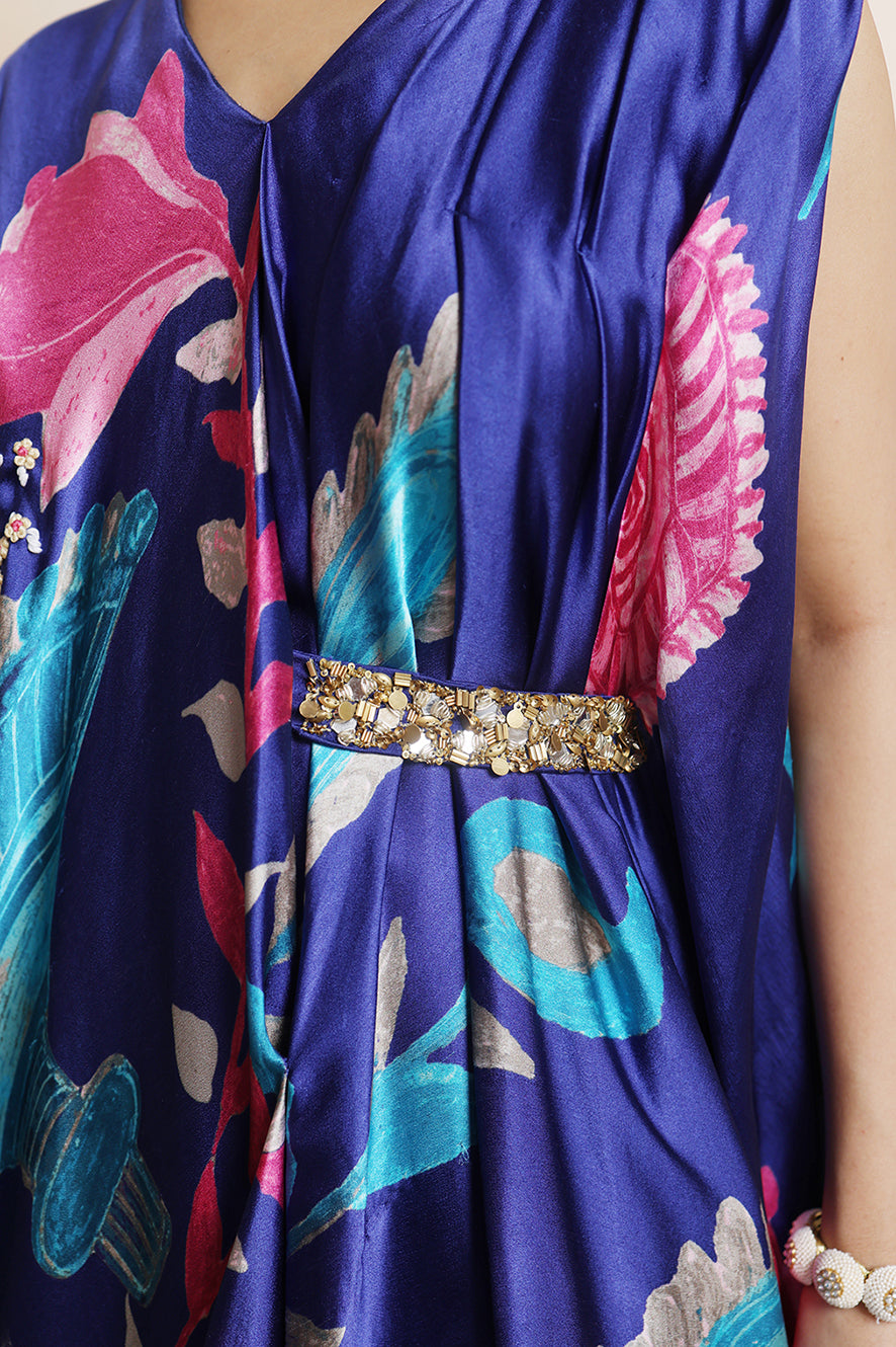 Ornamental Print Draped Asymmetric Tunic Teamed With Pants, Features A Stylish Tie-Up Belt. Inspired By 'Mata Ni Pachedi' Painting's Crown (Mukut) Ornamental Motifs. The Belt Is Hand Embroidered With Sequins.
