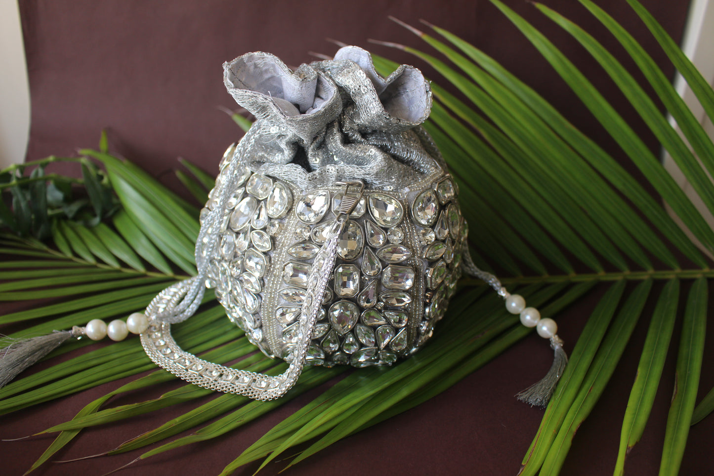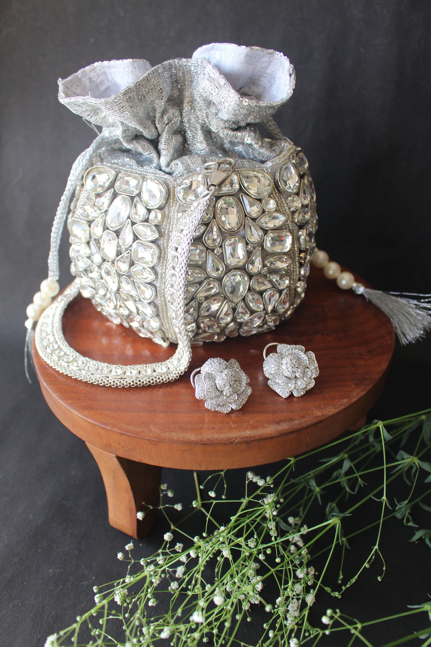 Hand Embroidered Silver Diamond Bucket-Shaped Potli Based On Silk Is Beautified With An Array Of Silver Kundan Work And Cutdana On All The Sides With Tassels Giving A Finishing Touch. It Is Paired With An Intricately Embellished Metallic Handle.