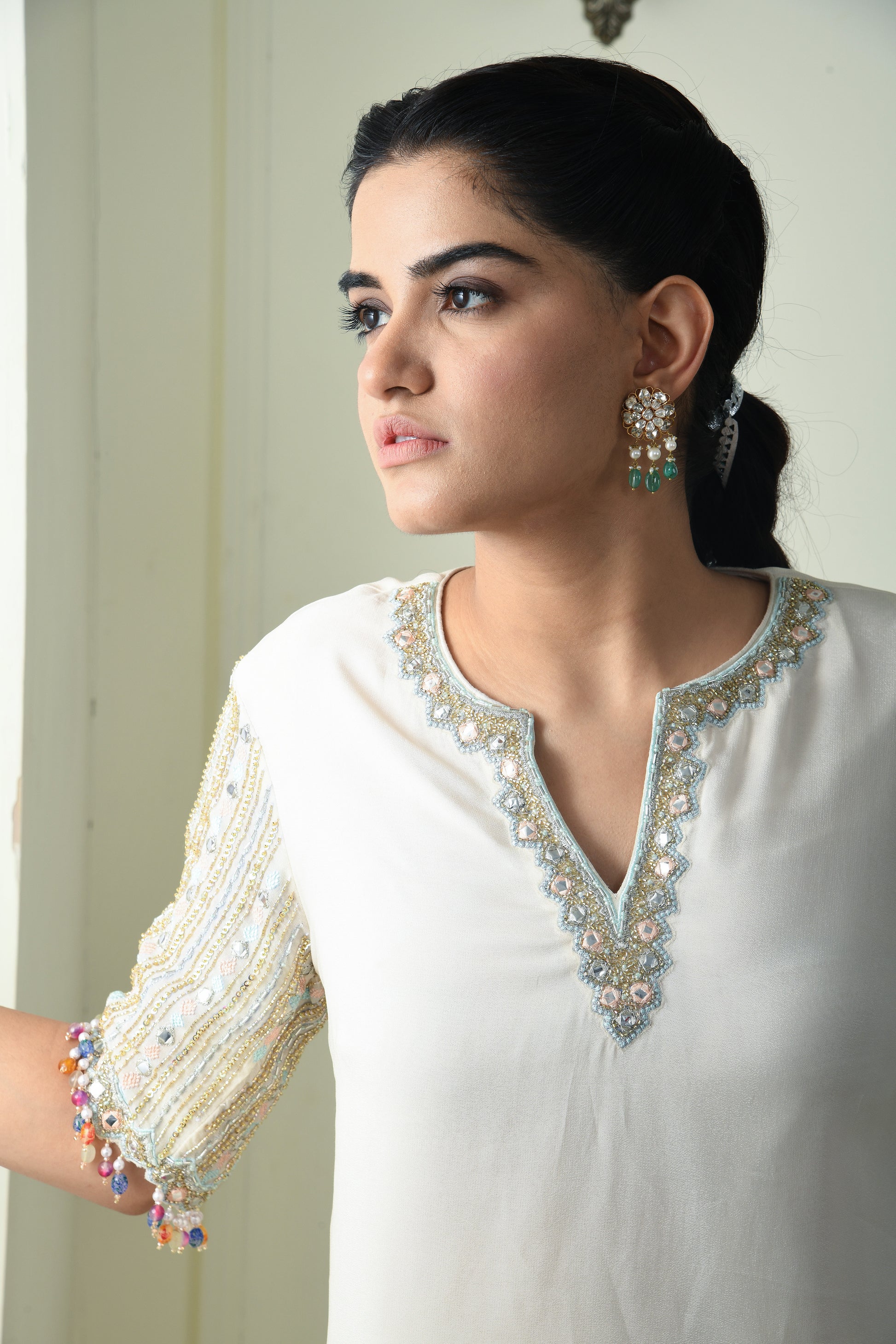 One Sleeve Drape Kurta With Fine Mirror Embellishment On The Neckline Features Exquisite Embroidery With Stonework Tassels At The Edge Of The Sleeves. It Is Paired With Flared Sharara Pants.