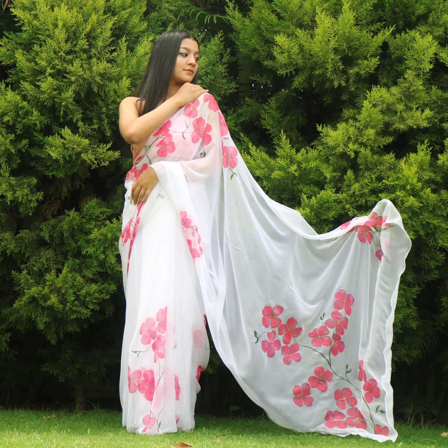 White Saree Based On Chiffon Features Hand Painted Pink Dogwood Flowers. It Is Paired With An Unstitched Silk Blouse.