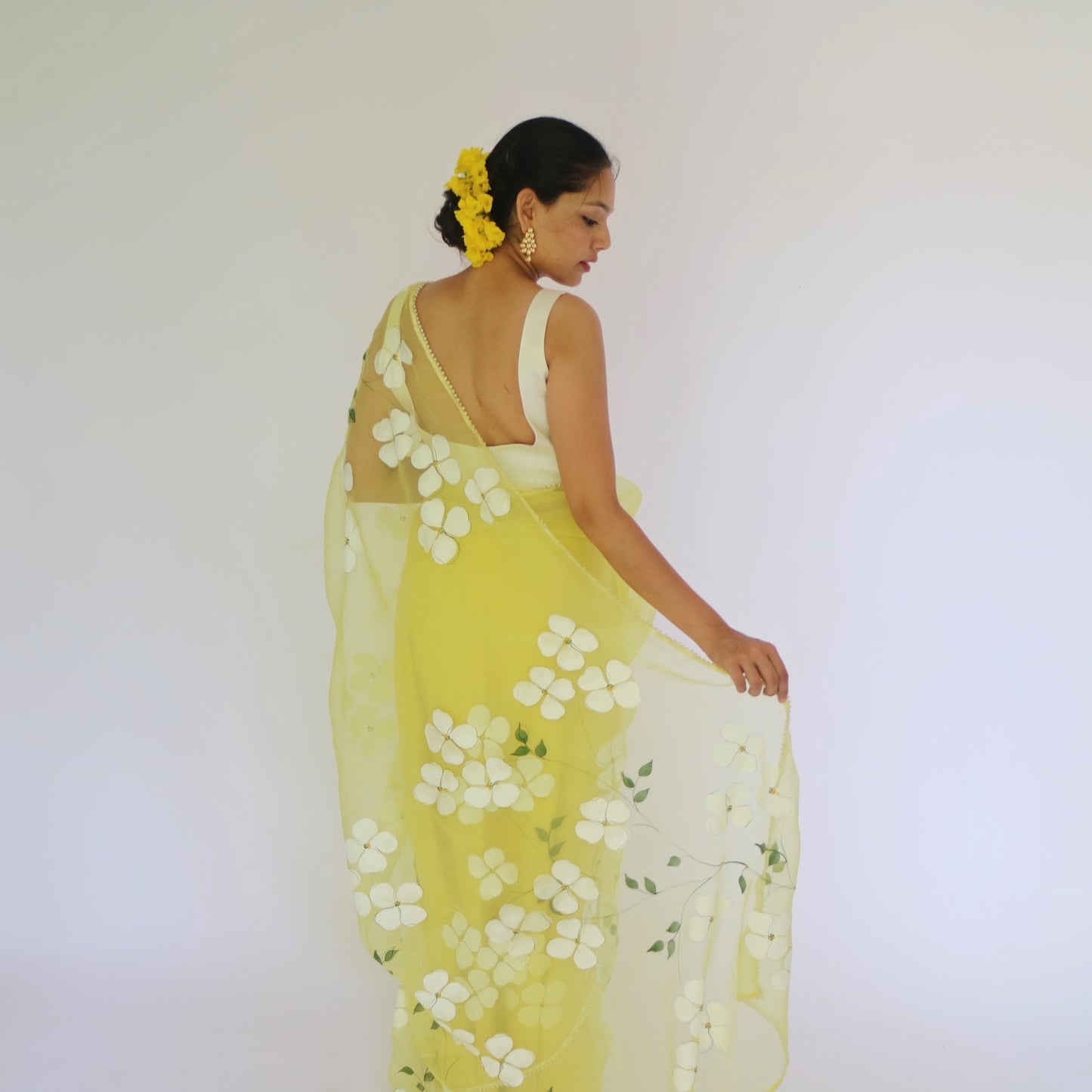Yellow Saree Based On Pure Organza Features Hand-Painted White Dogwood Flowers Enhanced With A Pearl Border. It Is Paired With An Unstitched Silk Blouse Piece.