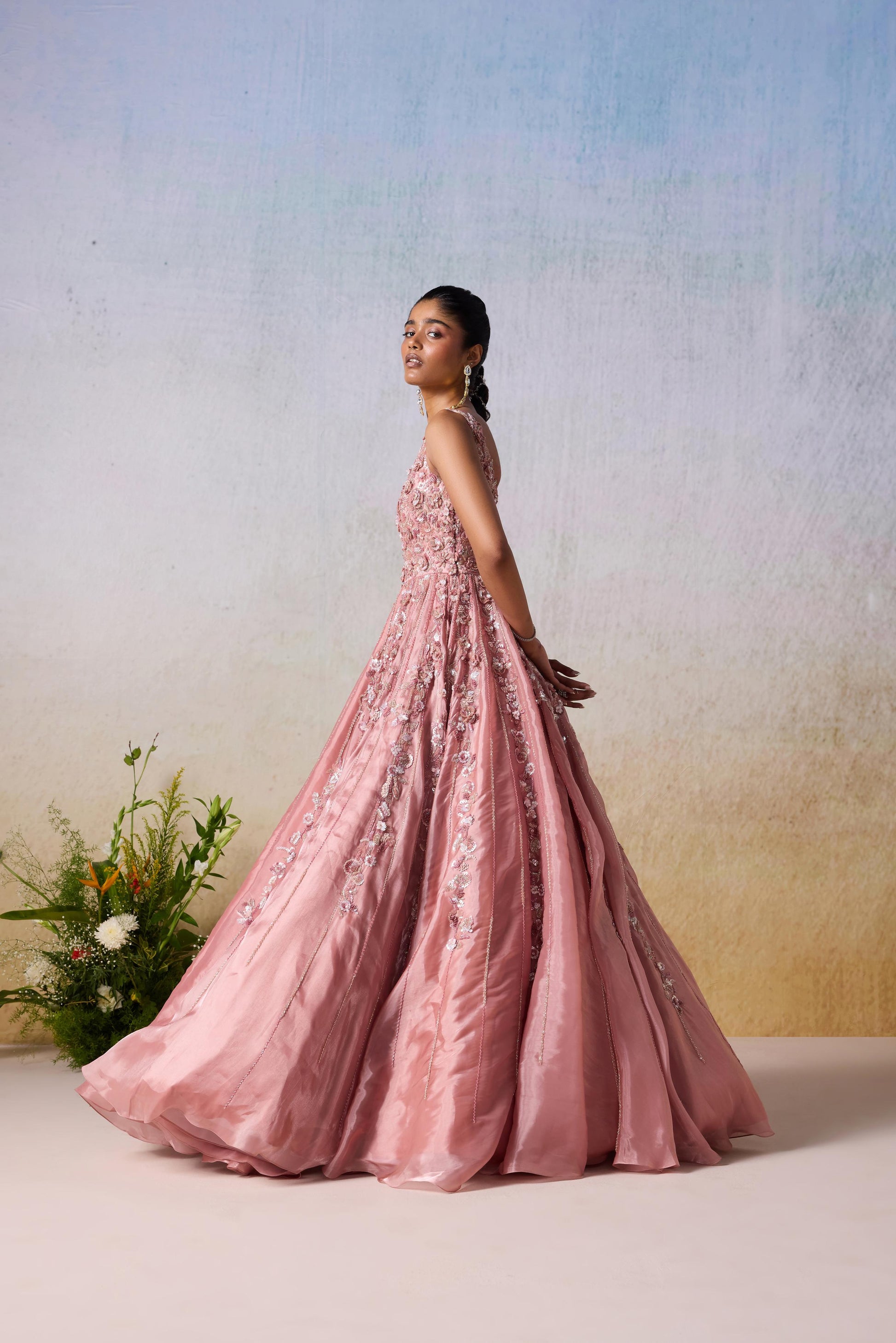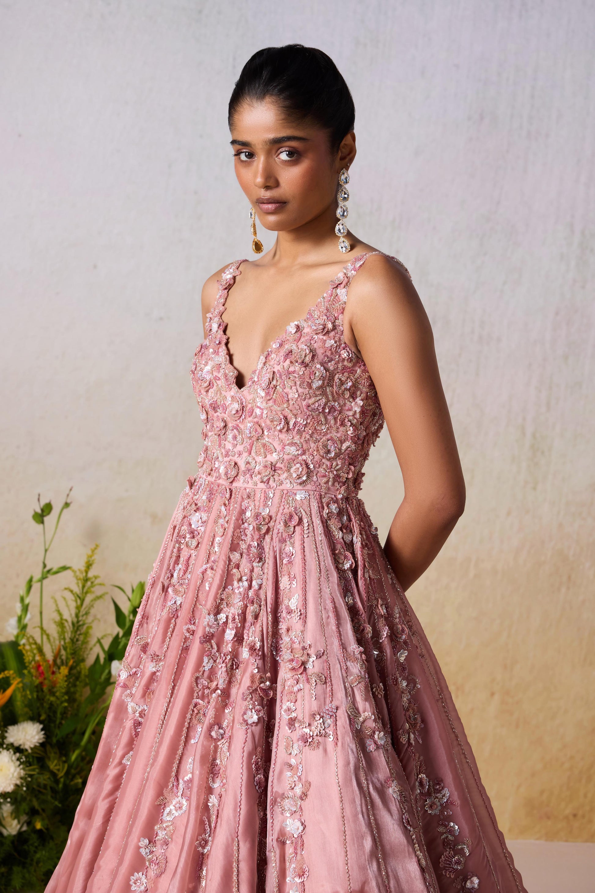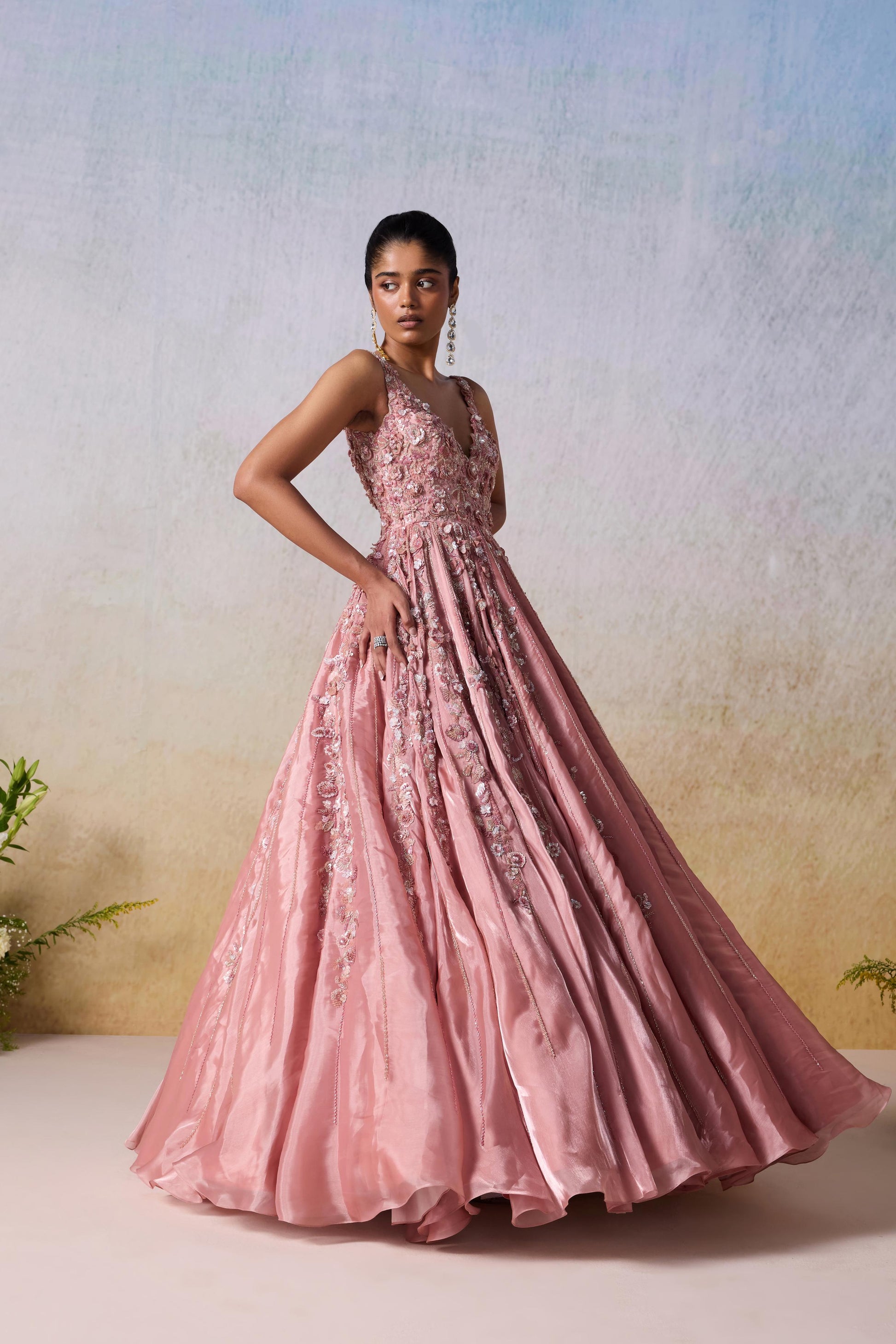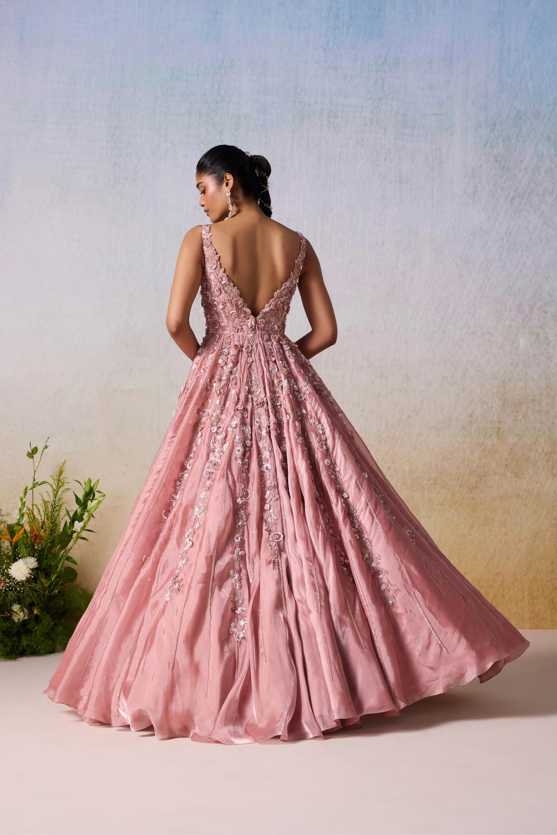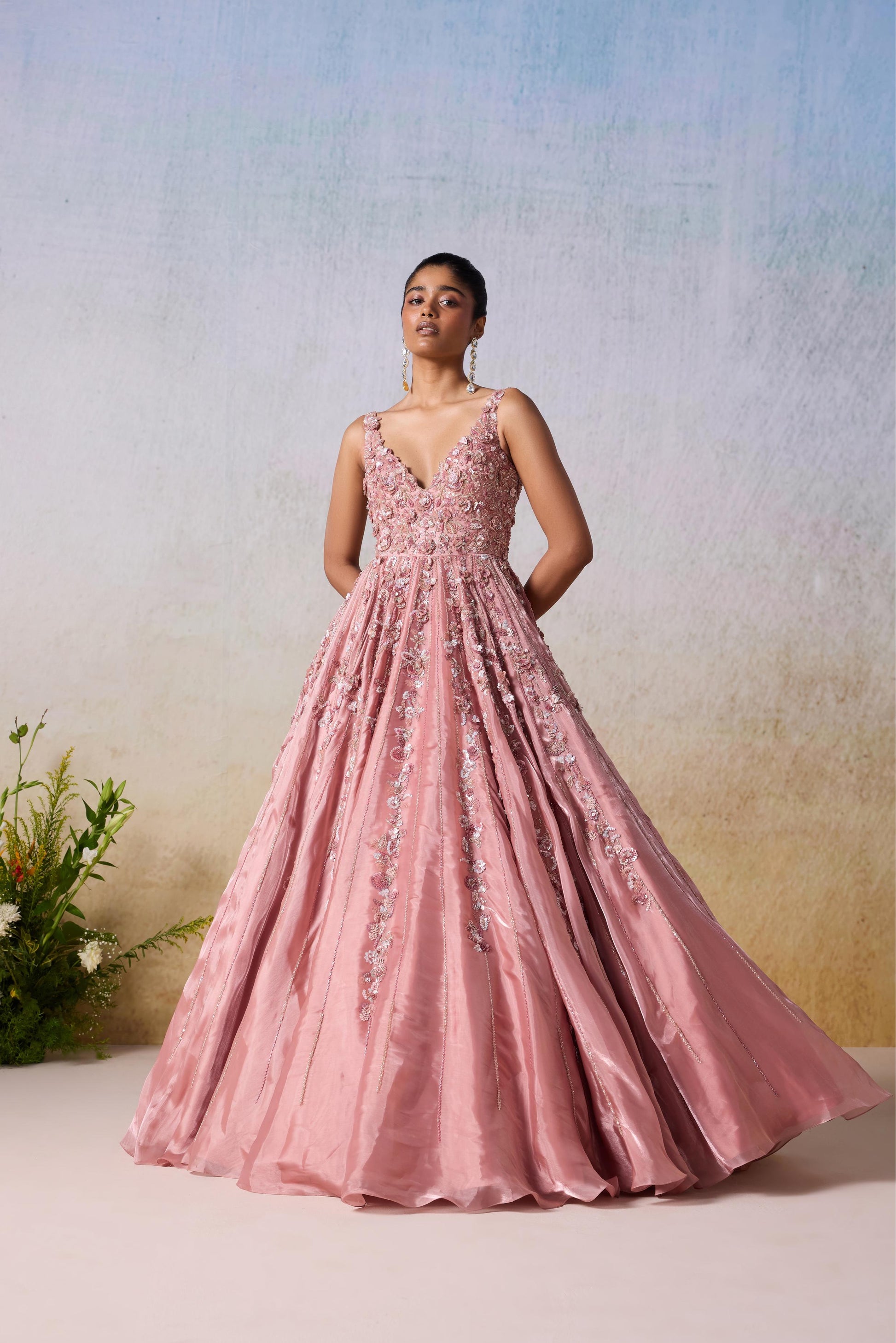 Featuring The Floral 3D Work On A Sleeveless V Neck Gown , Embellished With Tone On Tone And A Little Of The Gold Embroidery On It.