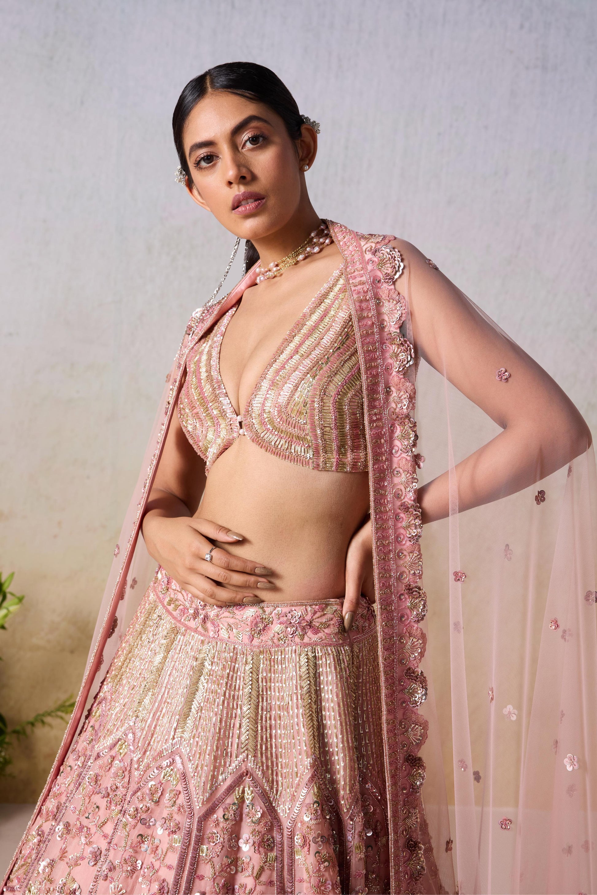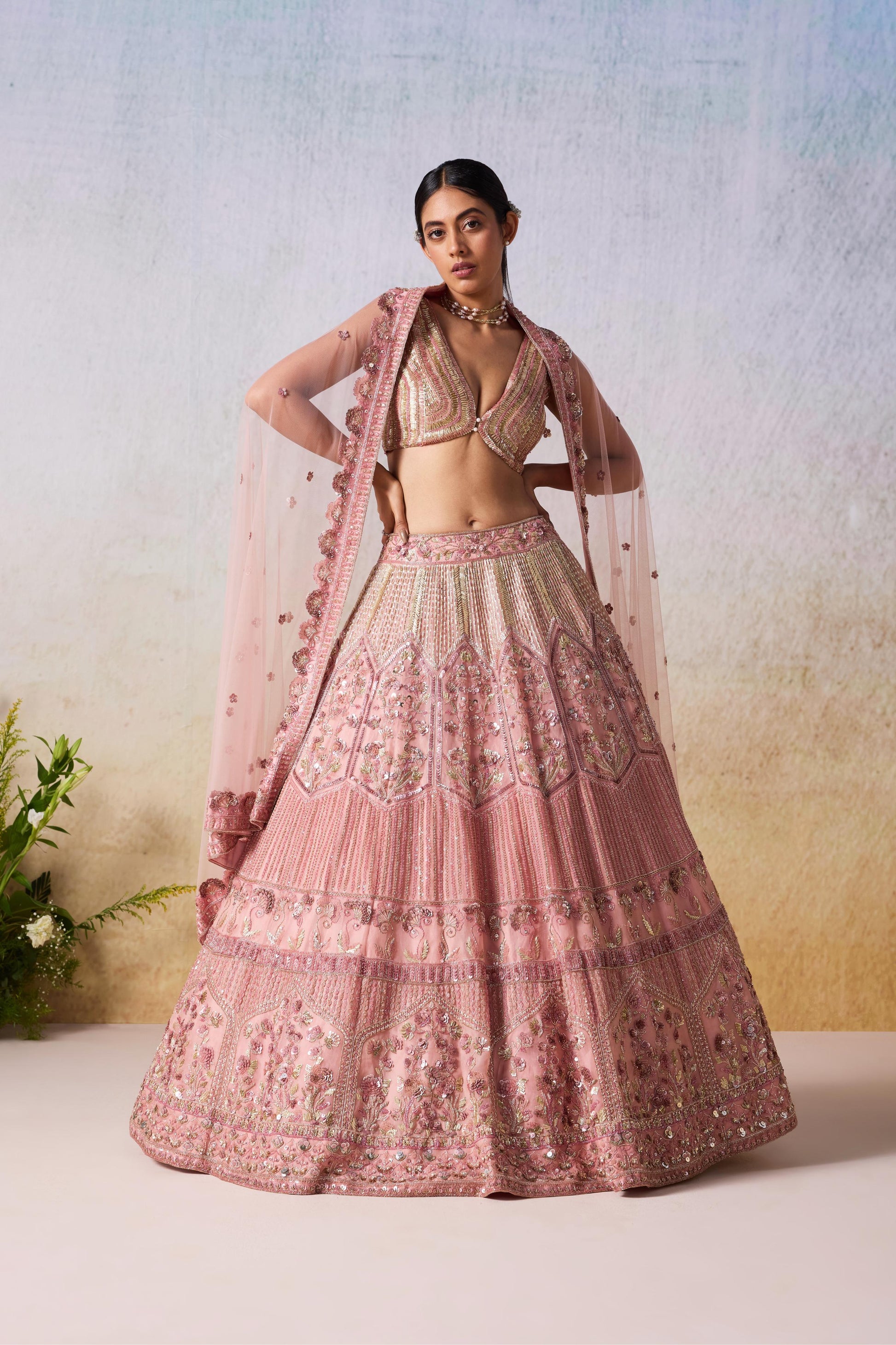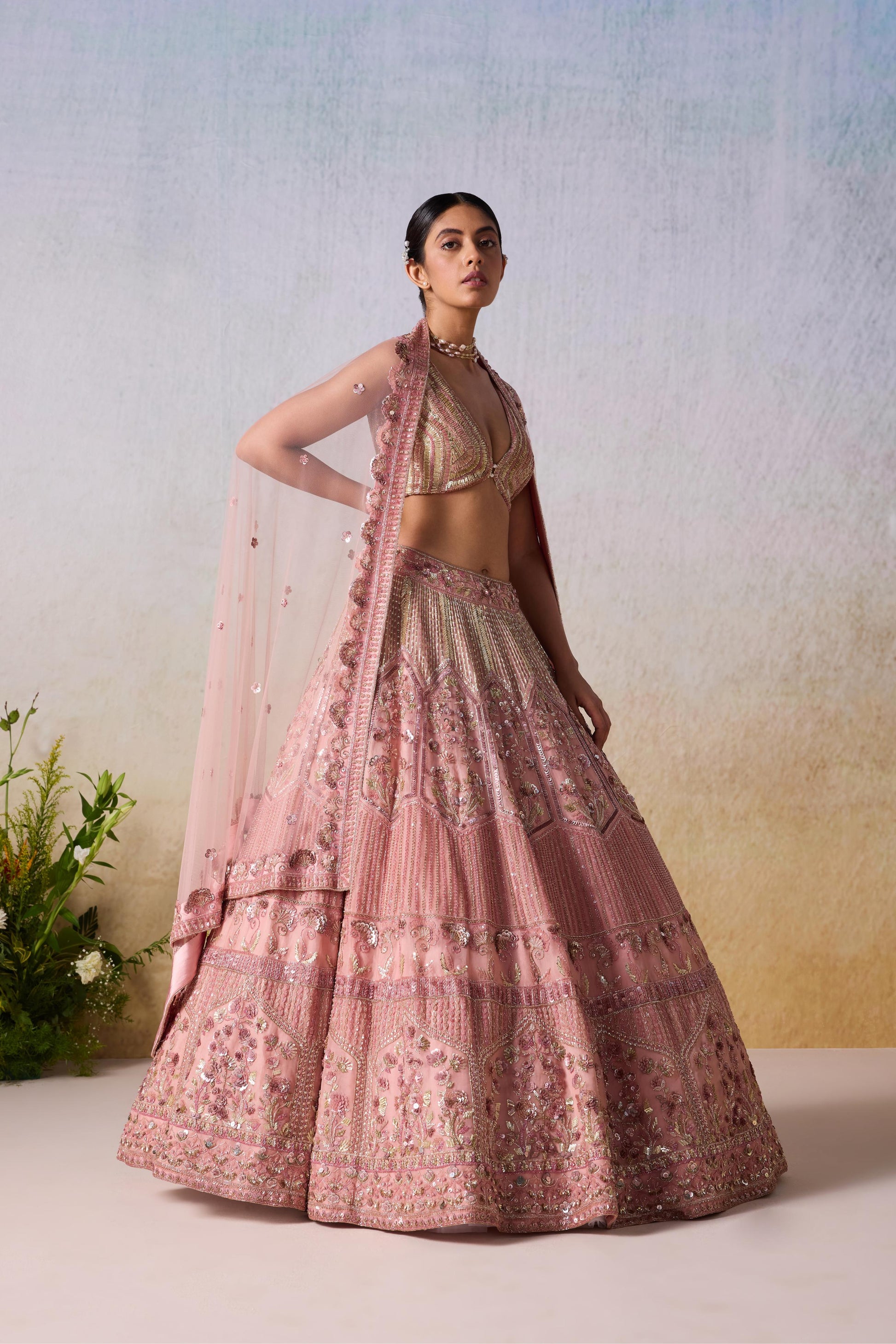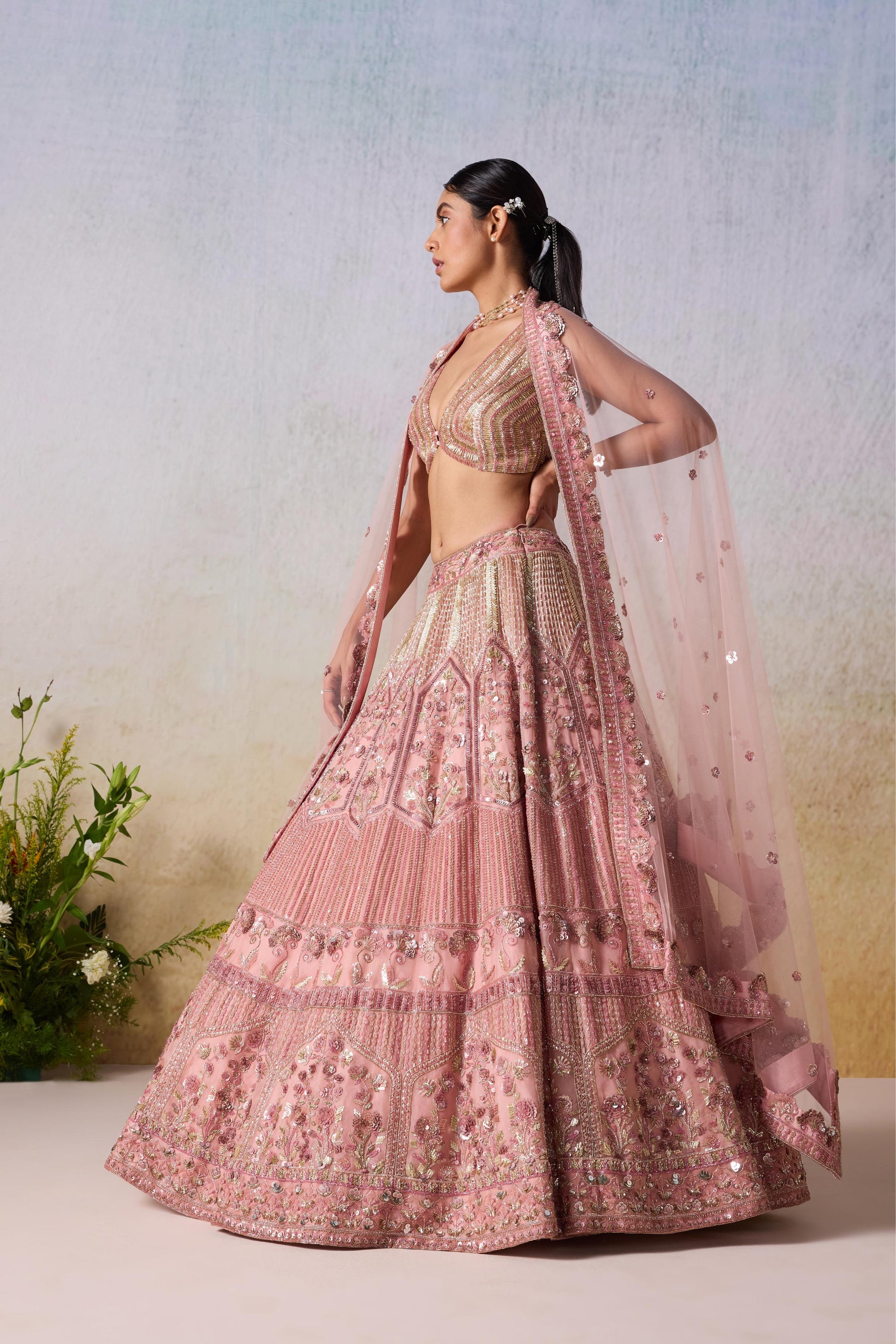 Tone On Tone With The Gold Ensembles On The Beautiful Set Of Dusty Rose Bridal Lehenga Featuring The Inspiration From The Floral World.