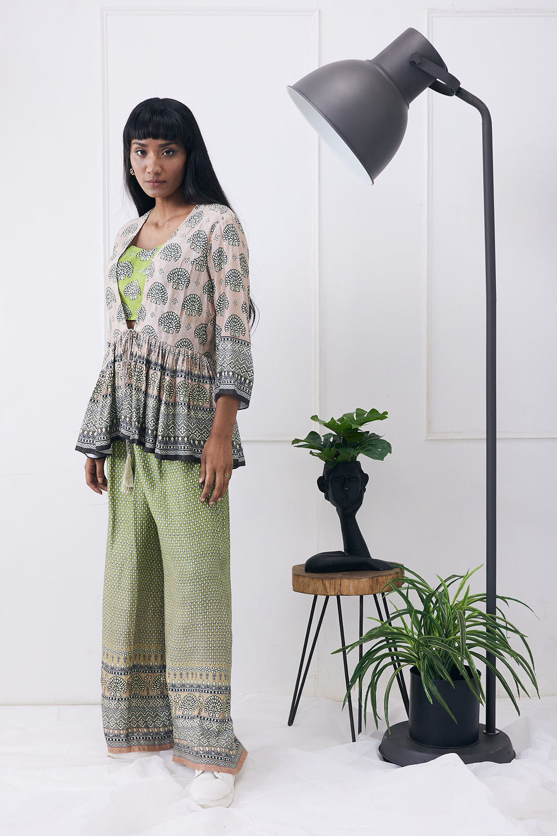 Green Printed Crop Top Based On Jacquard Is Paired With A Printed Pant And A Beige Peplum Jacket Featuring Soft Floral Motifs.