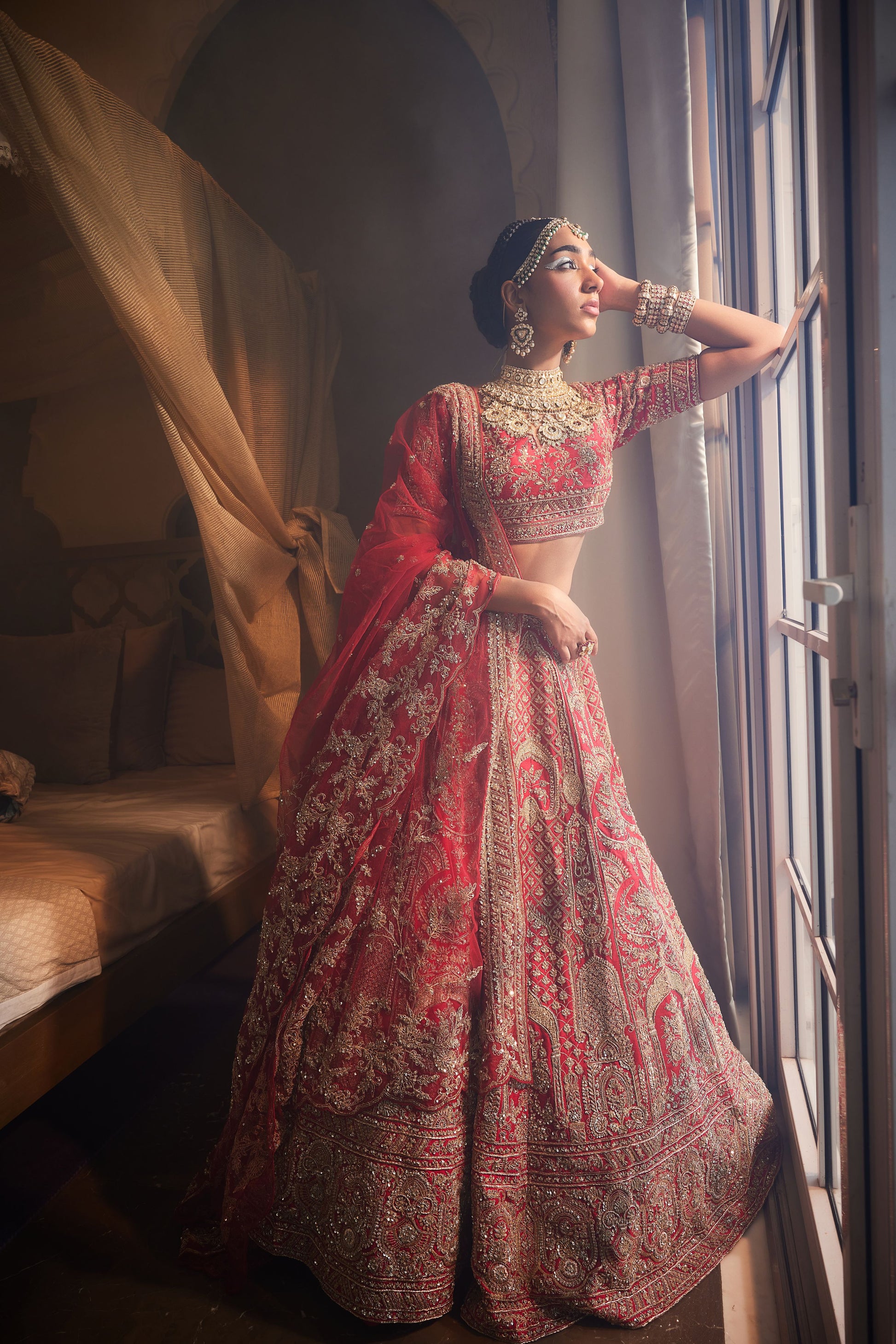 ELNAZ RED HEAVILY EMBROIDERED LEHENGA