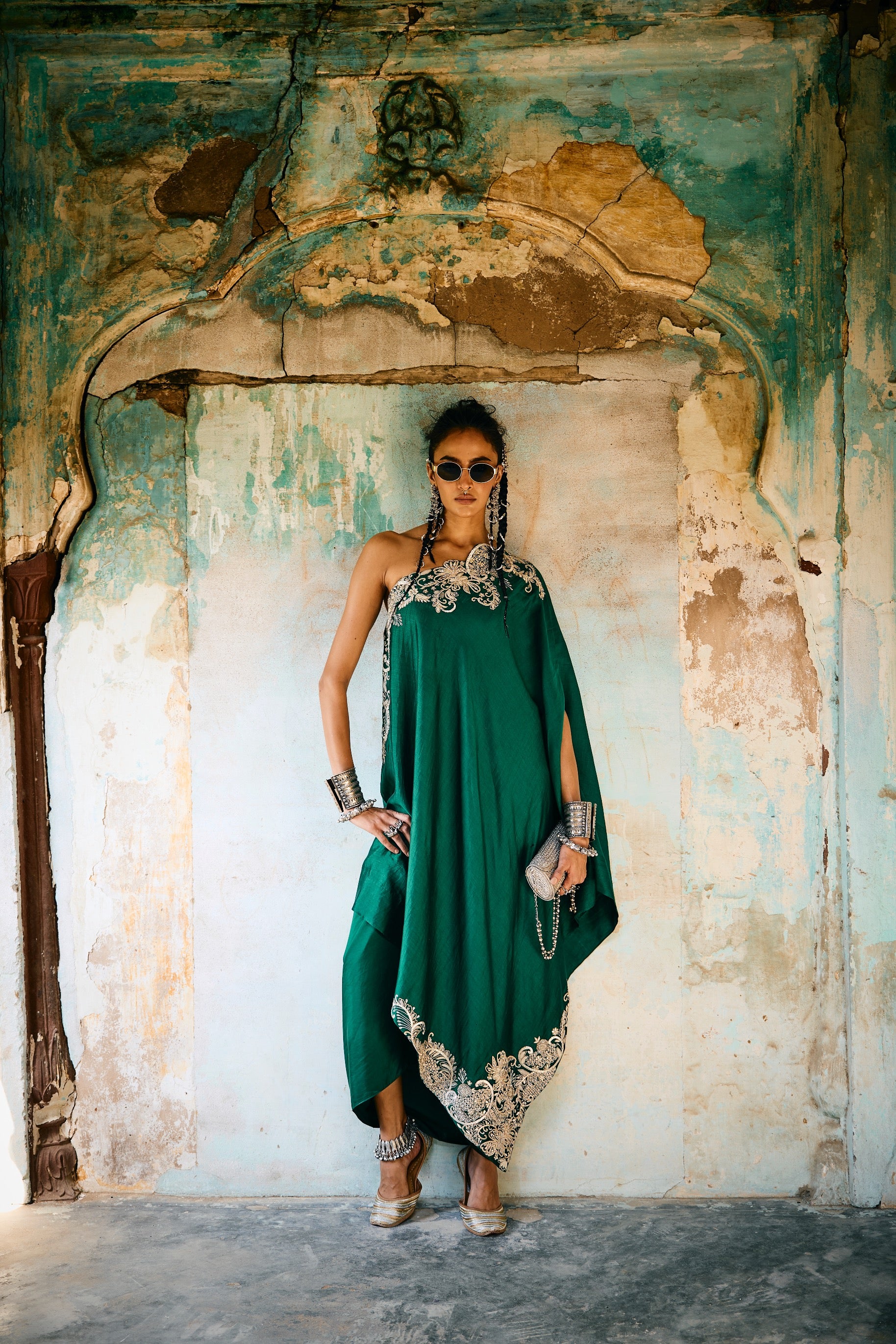 Make A Bold Entrance In This Emerald Green Embroidered Off-Shoulder Cape With Wrap Skirt, Crafted From Luxurious Silk And Embellished With Intricate Zardozi Embroidery. The Off-Shoulder Cape Adds A Contemporary, Feminine Flair, While The Wrap Skirt Offers A Flattering, Flowing Silhouette. Detailed Gold Threadwork Elevates The Ensemble With A Touch Of Regal Elegance, Perfect For Festive Events, Weddings, Or Cocktail Celebrations. This Two-Piece Set Seamlessly Merges Traditional Artistry With Modern Design, Making It A Striking Choice For The Style-Conscious Woman Who Loves To Stand Out With Grace And Sophistication.