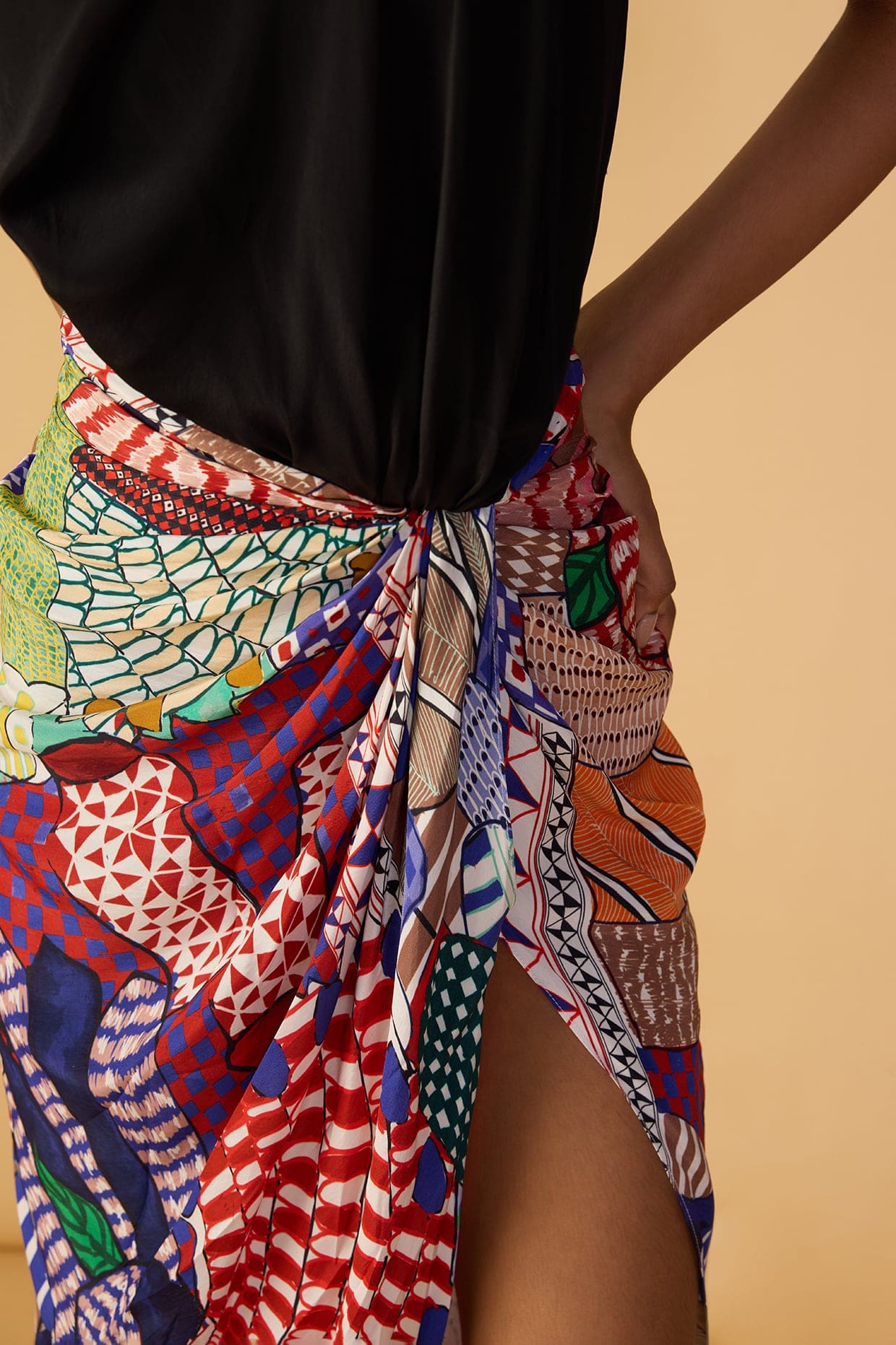 Abstract Bird Print Halter Neck Drape Style Dress With Customizable Side Slit.