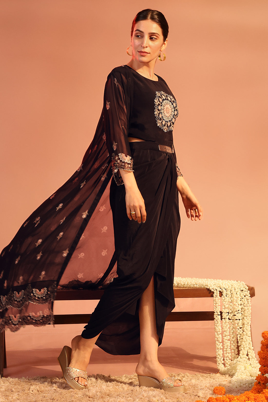 Black Eraya Embellished Drape Dress With A Metal Belt, Paired With An Organza Jacket Featuring A Cutwork Hem.