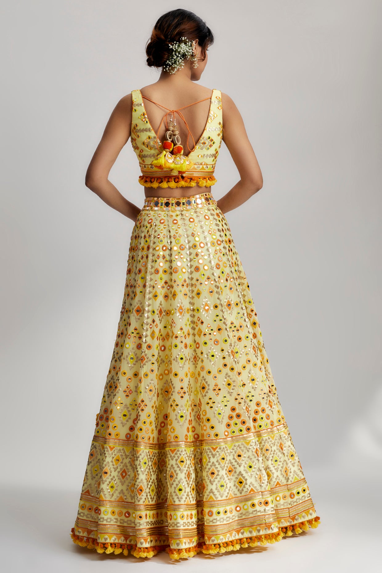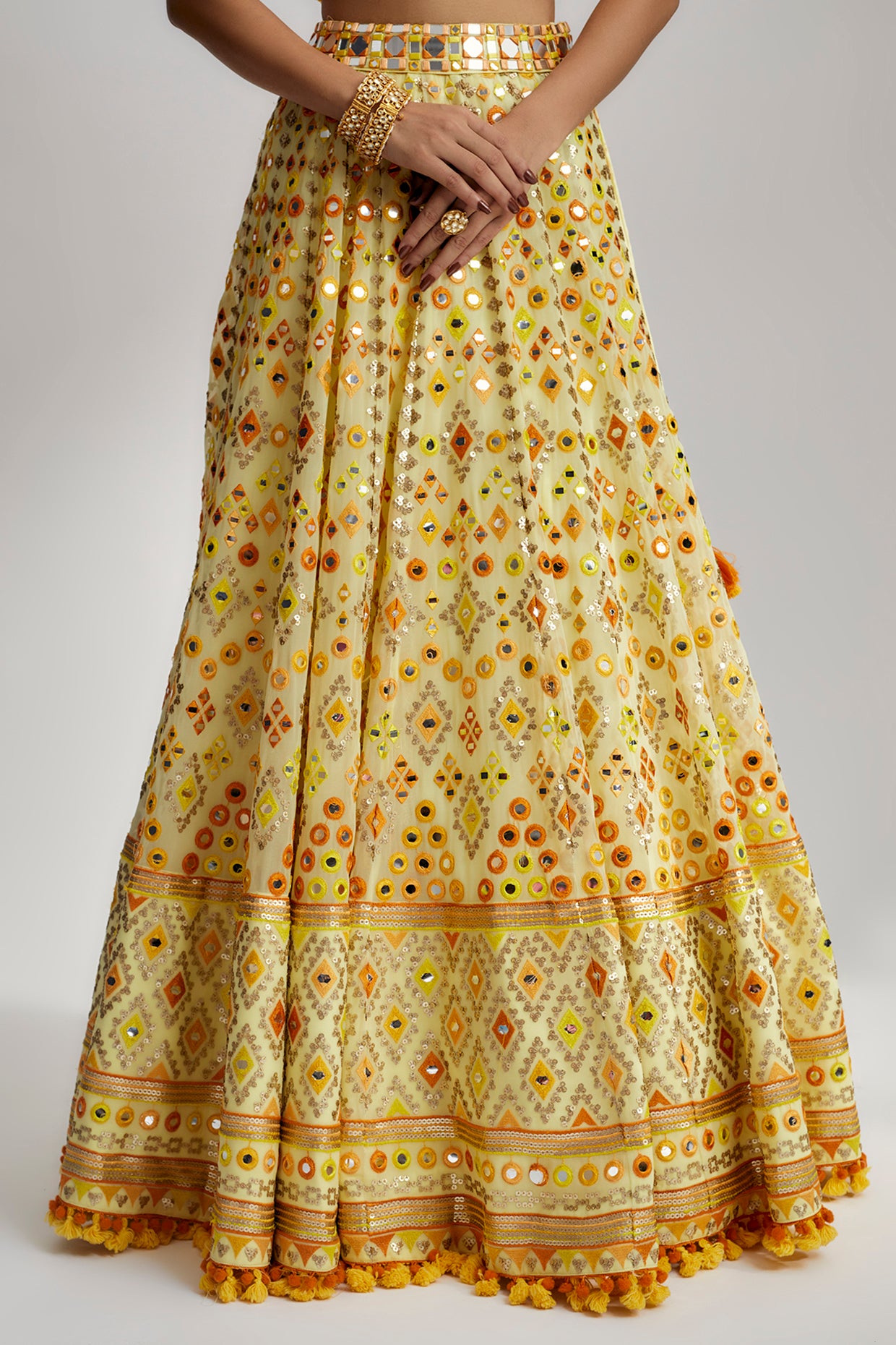 The Esha Lehenga Is A True Testament To Exquisite Craftsmanship, Boasting Detailed Hand And Machine Embroidery That Elevates It To A Work Of Art. Skilled Artisans Have Painstakingly Adorned The Fabric With Intricate Patterns And Motifs Using Fine Threads, Sequins, And Beads, Showcasing Their Dedication And Skill. The Combination Of Hand And Machine Embroidery In The Esha Lehenga Adds Depth And Dimension, Creating A Visual Masterpiece That Captivates The Eye. With Its Vibrant Yellow Hue And Intricate Detailing, This Ensemble Is Sure To Make A Statement on any Special Occasion.