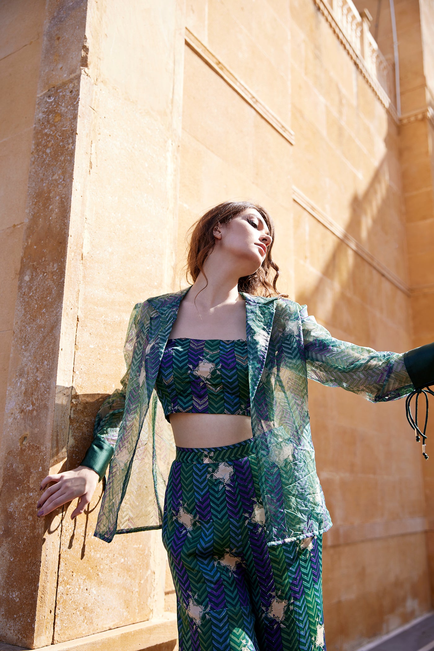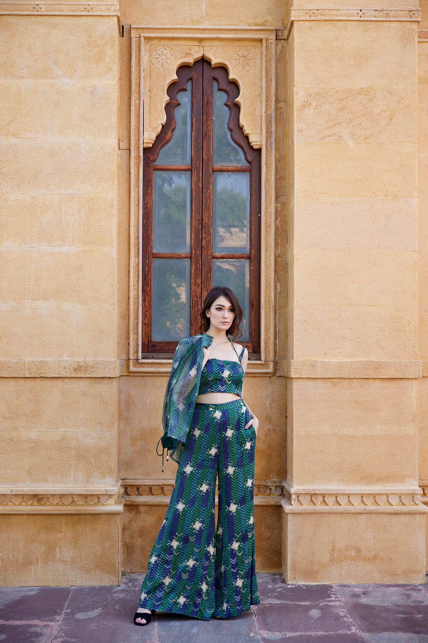 Full Flared Hand-Block Palazzo Pants Along With Hand Embroidered Blouse With Highlighting Paired With Hand-Block Organza Jacket.