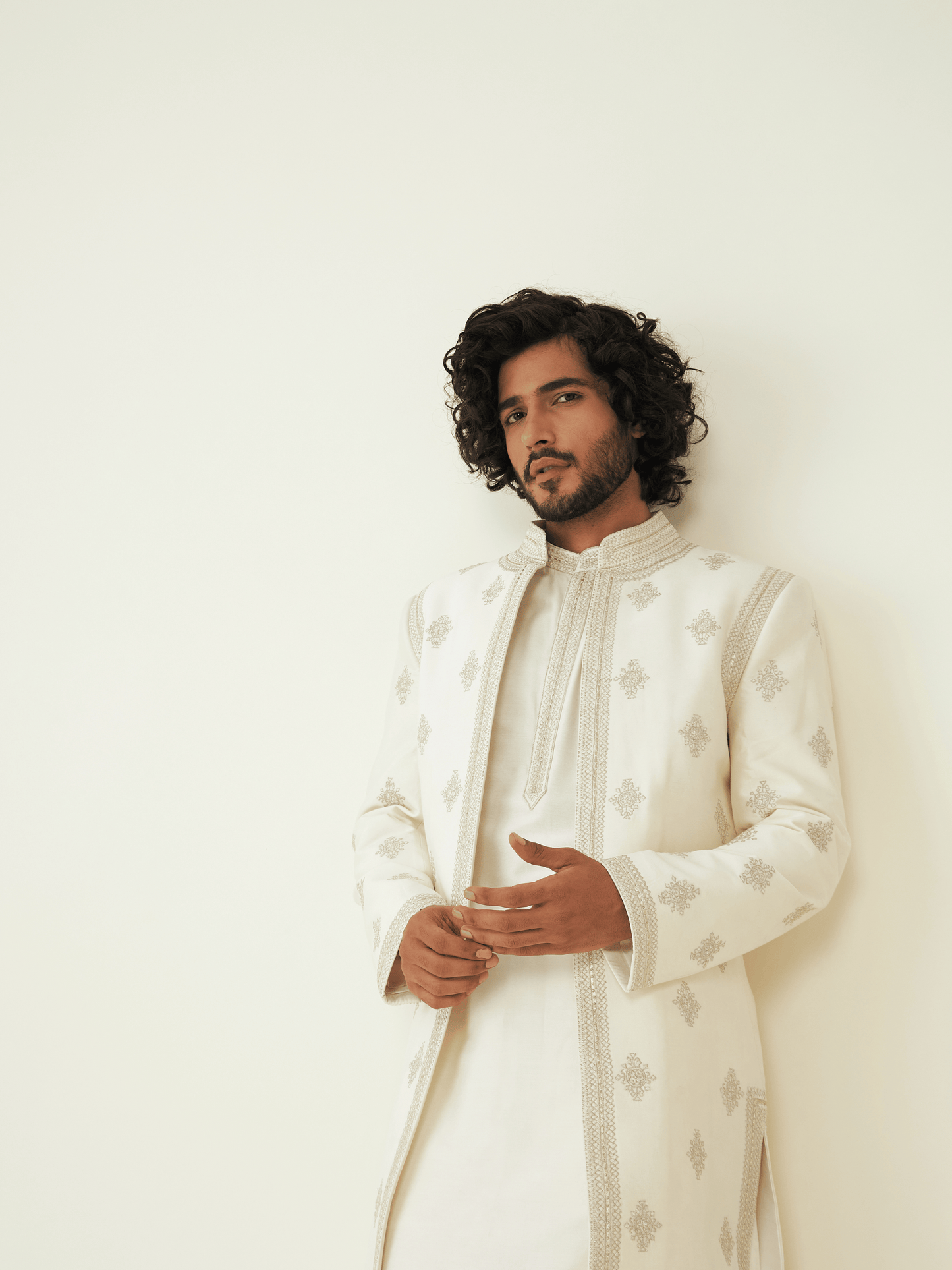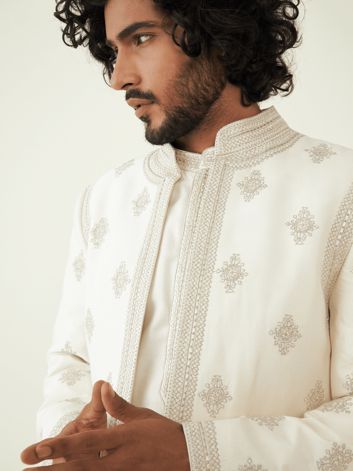 At the heart of this ensemble lies the resplendent off-white sherwani, a true embodiment of refinement and grace. The off-white hue symbolizes purity and serenity, while the meticulous paneling accentuates the contours of your form, creating an aura of regal poise.