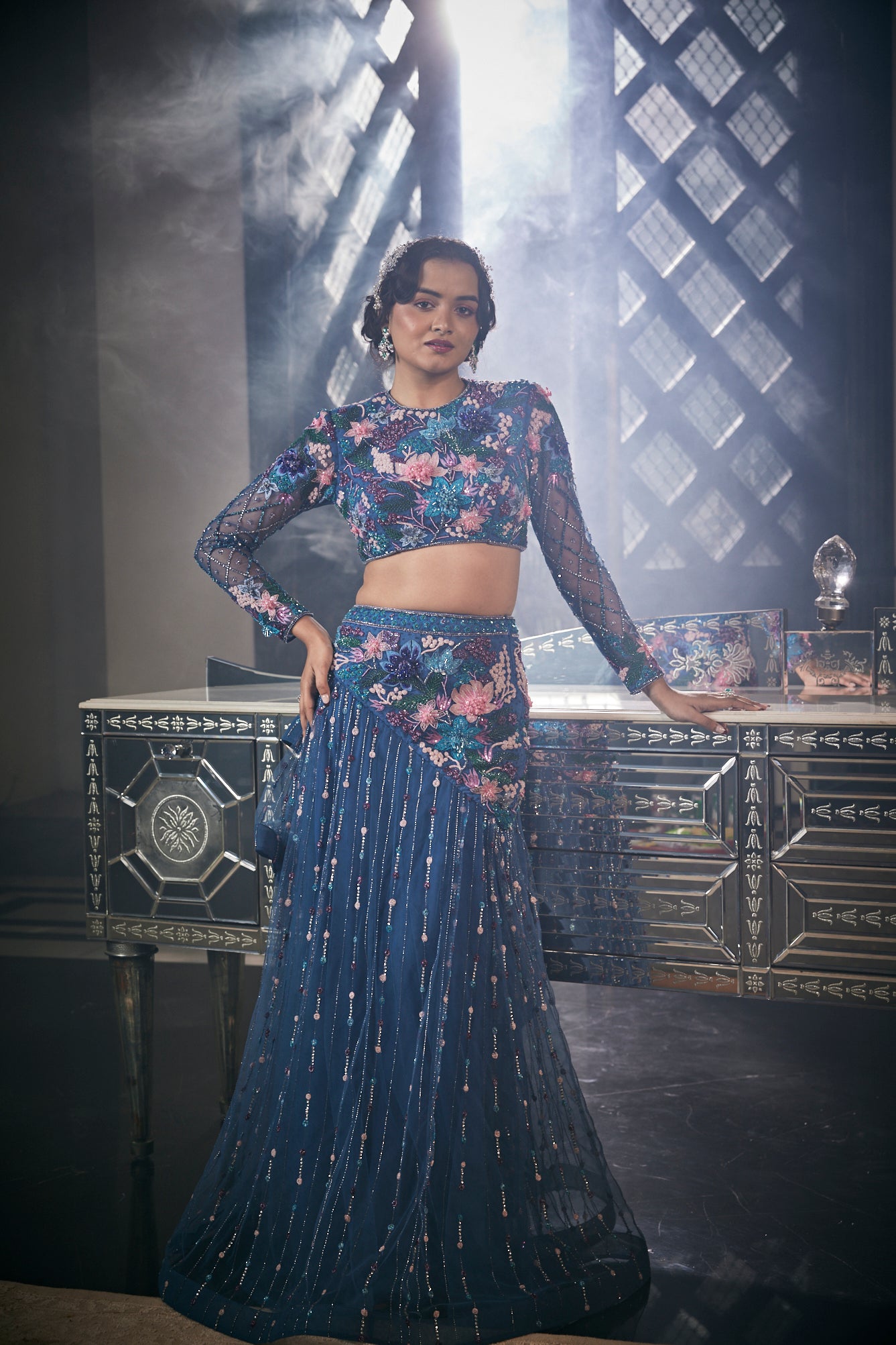 Floral Motif Embroidered On Blouse And Lehenga.