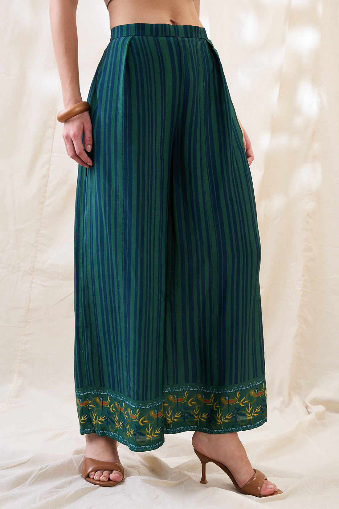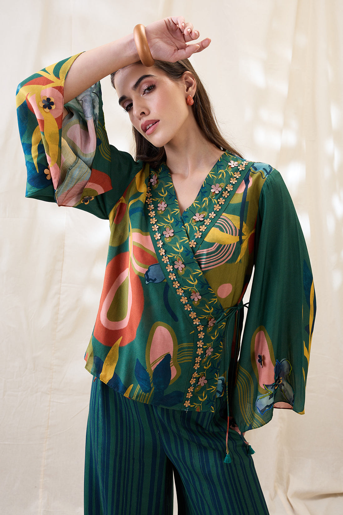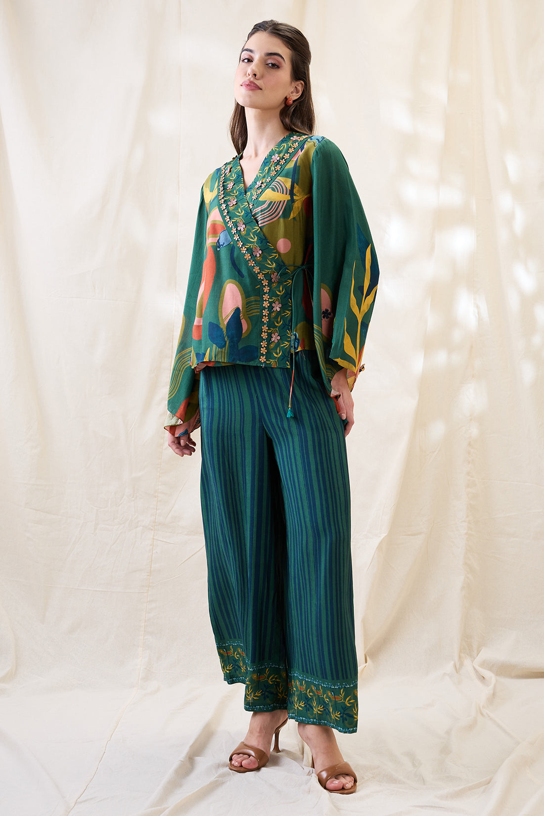 Green Flora Embellished Angarkha Top, Paired With Straight Pants In Chanderi.