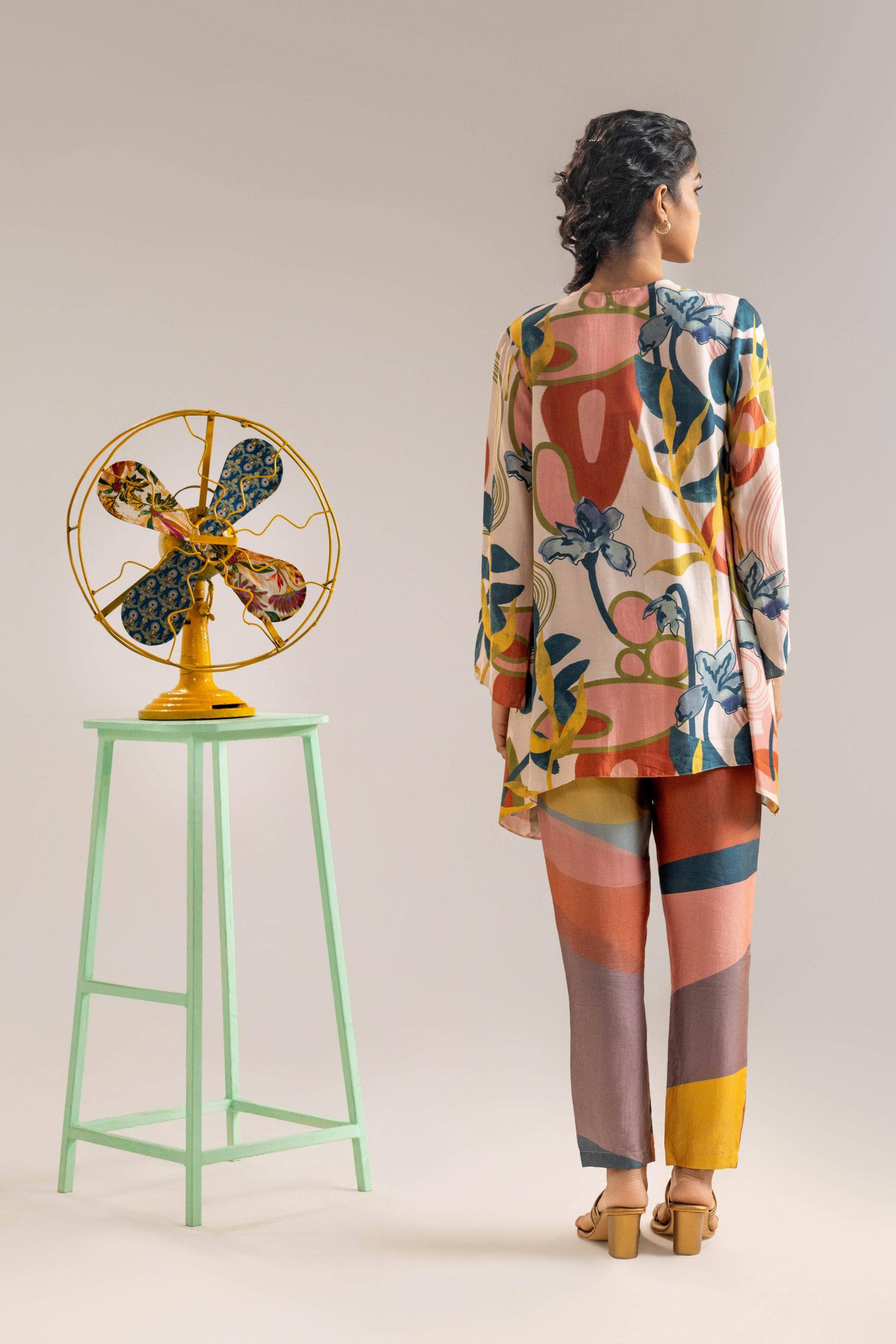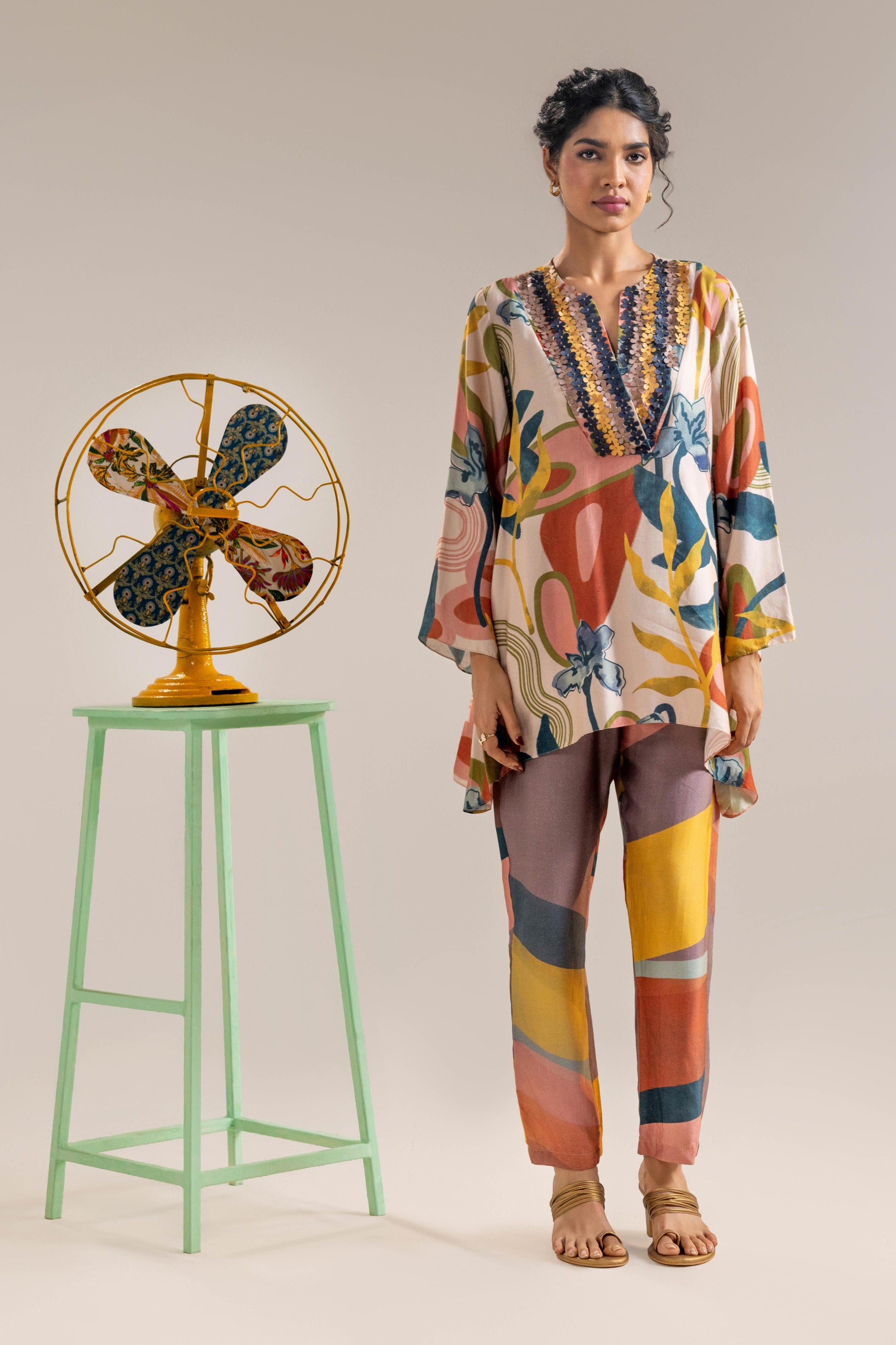 Beige Flora Embellished Shirt, Paired With Printed Chanderi Pants
