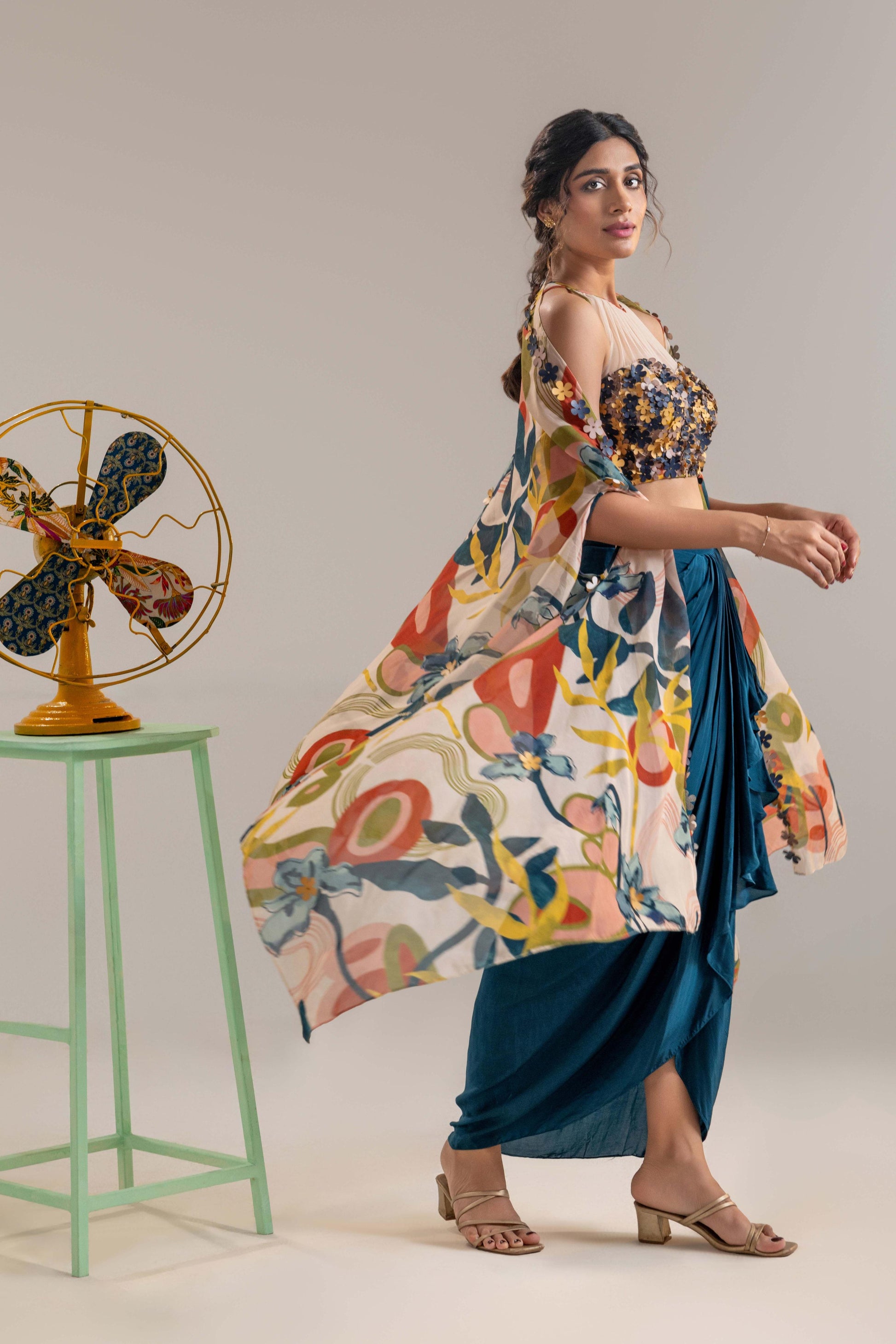 Multicolor Flora Embroidered Bustier And Drape Dress In Crepe, Paired With A Cape In Organza.