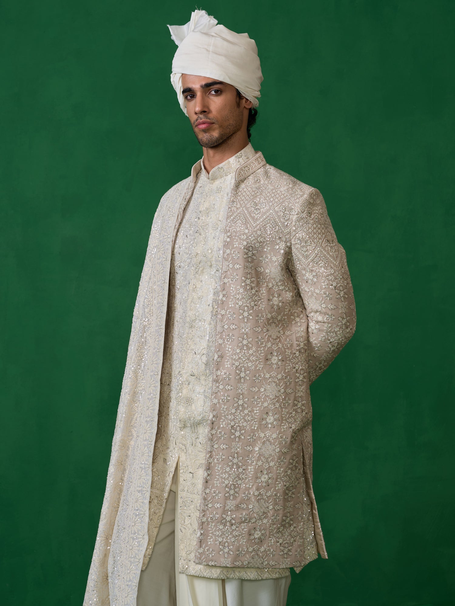 This Sophisticated Sherwani Outfit Is A Three-Piece Ensemble, Perfect For Groom Wear. The Set Includes A Long, Open Jacket Worn Over A Kurta, Paired With Traditional Dhoti Bottoms. A Matching Dupatta Is Draped Gracefully Over One Shoulder, Complementing The Look. The Jacket And Kurta Are Both Richly Textured With Intricate, Self-Colored Embroidery And Embellishments That Create A Cohesive And Luxurious Look. The Draped Dhoti Pants Complete The Outfit, Providing A Graceful And Classic Indian Silhouette To Contrast With The More Structured Jacket. This Ensemble Is A Perfect Blend Of Modern And Traditional Styles, Making It An Ideal Choice For A Groom Seeking A Regal Yet Contemporary Look.