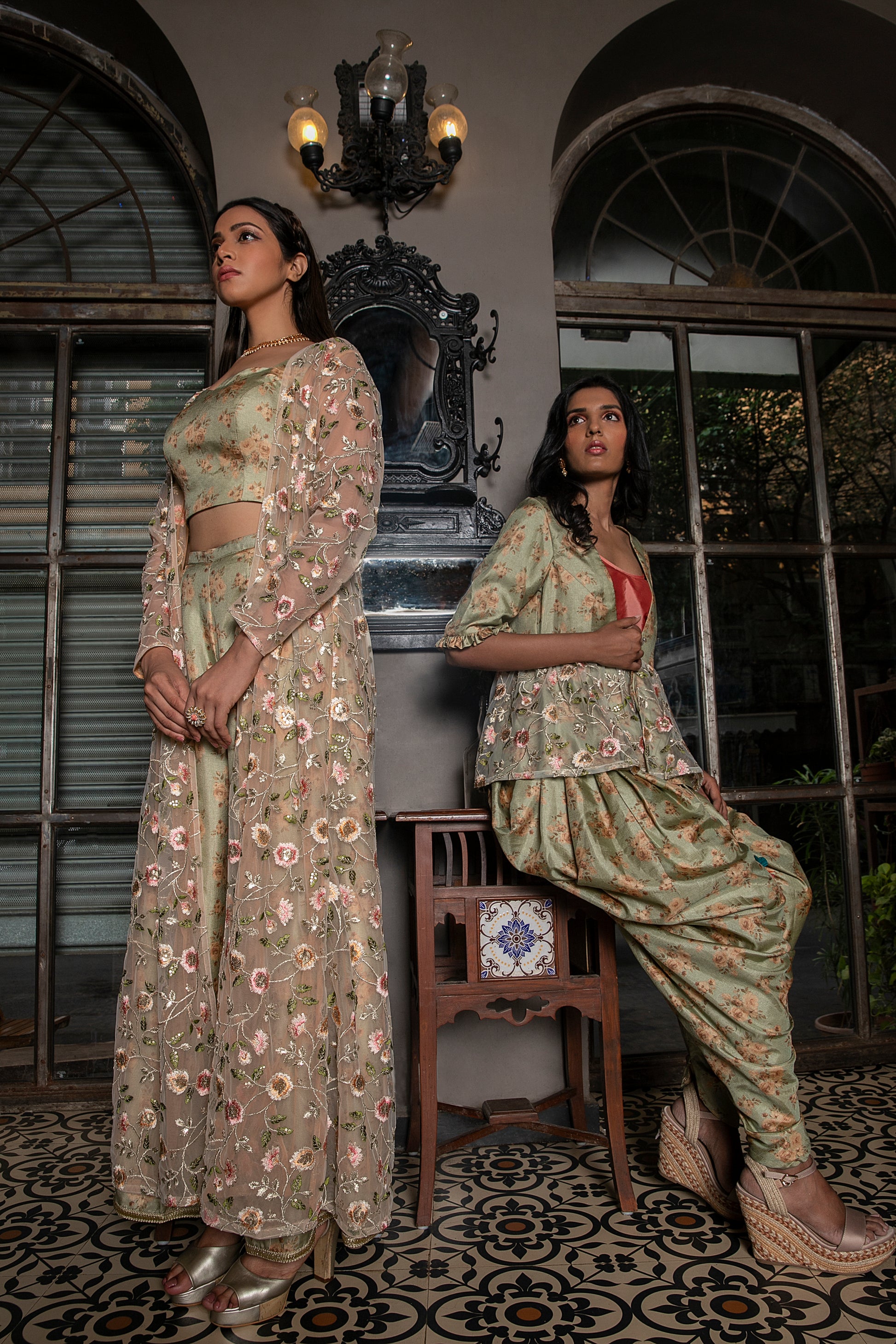 Beige Floral Embroidered Net Floor Length Jacket With Sage Green Floral Printed Khadi Silk Blouse And Palazzo Pants With Gold Border.