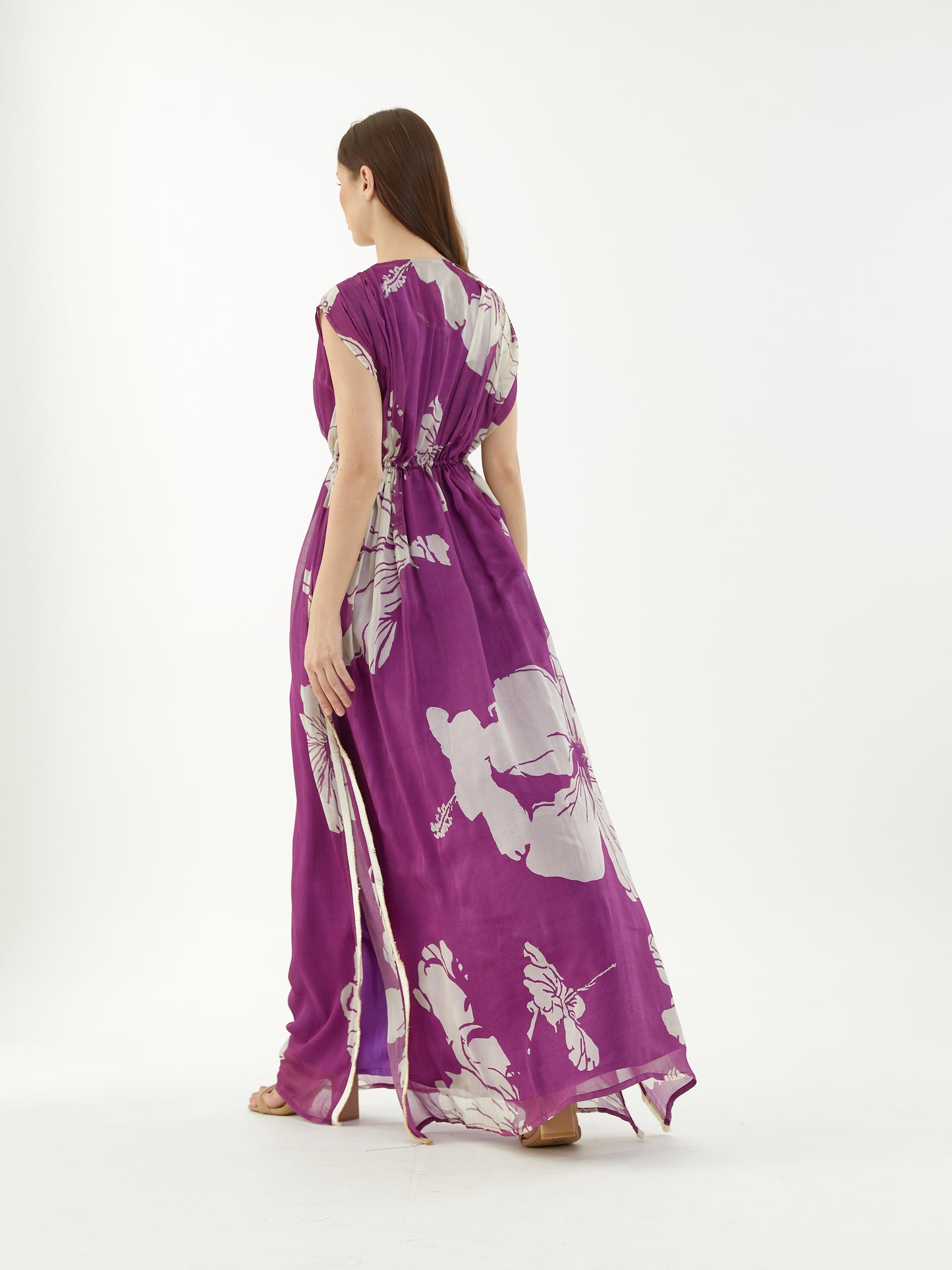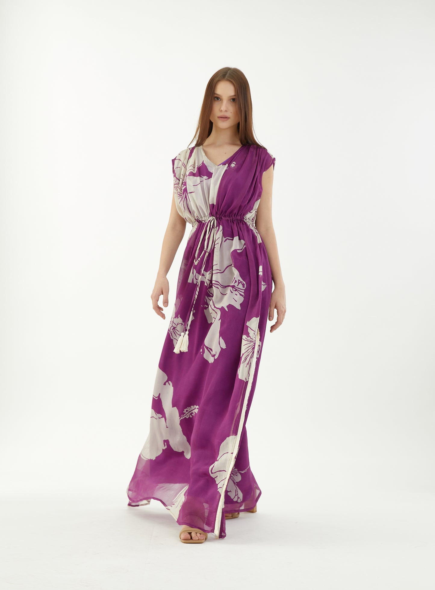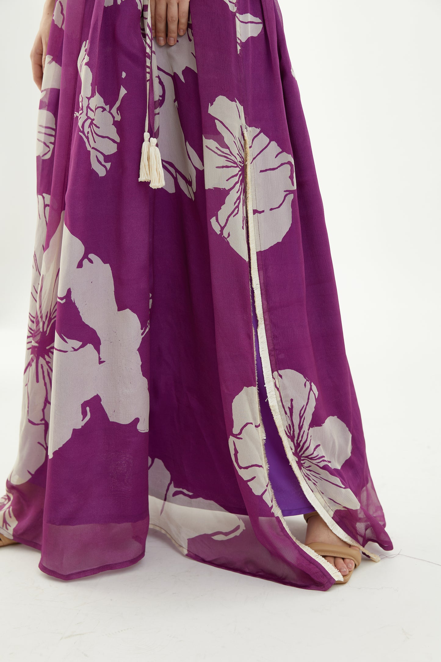Purple And White Floral Kaftan Cinched At Waist With A Side Slit Features Classic Floral Motifs And Tassels. It Is Based On Chiffon.