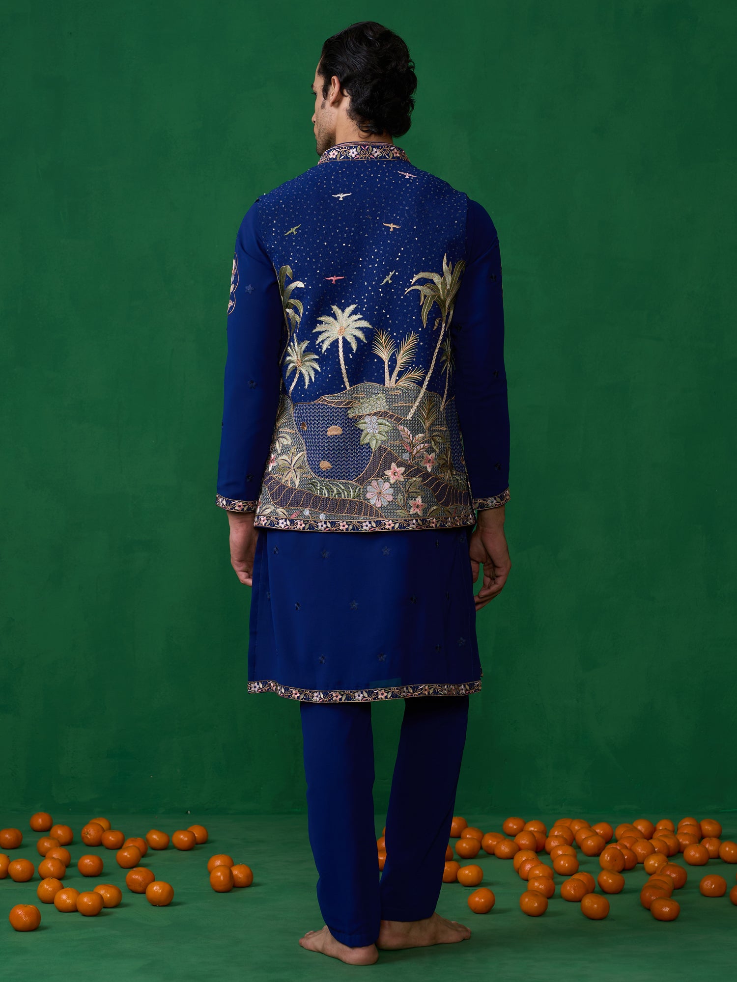 This Ensemble Consists Of A Straight Kurta Worn With Slim Trousers, Layered With An Intricately Embroidered Jacket. The Jacket Features Detailed Embroidery Along The Neckline, Front Panels, Sleeves, And Hem, Showcasing Nature-Inspired Motifs Such As Animals And Trees. The Kurta Underneath Is Kept Simpler, Allowing The Richly Adorned Jacket To Be The Highlight Of The Look. Perfect For Weddings, Festive Gatherings, And Cultural Occasions, This Outfit Blends Traditional Tailoring With Artistic Embroidery For A Refined Statement.