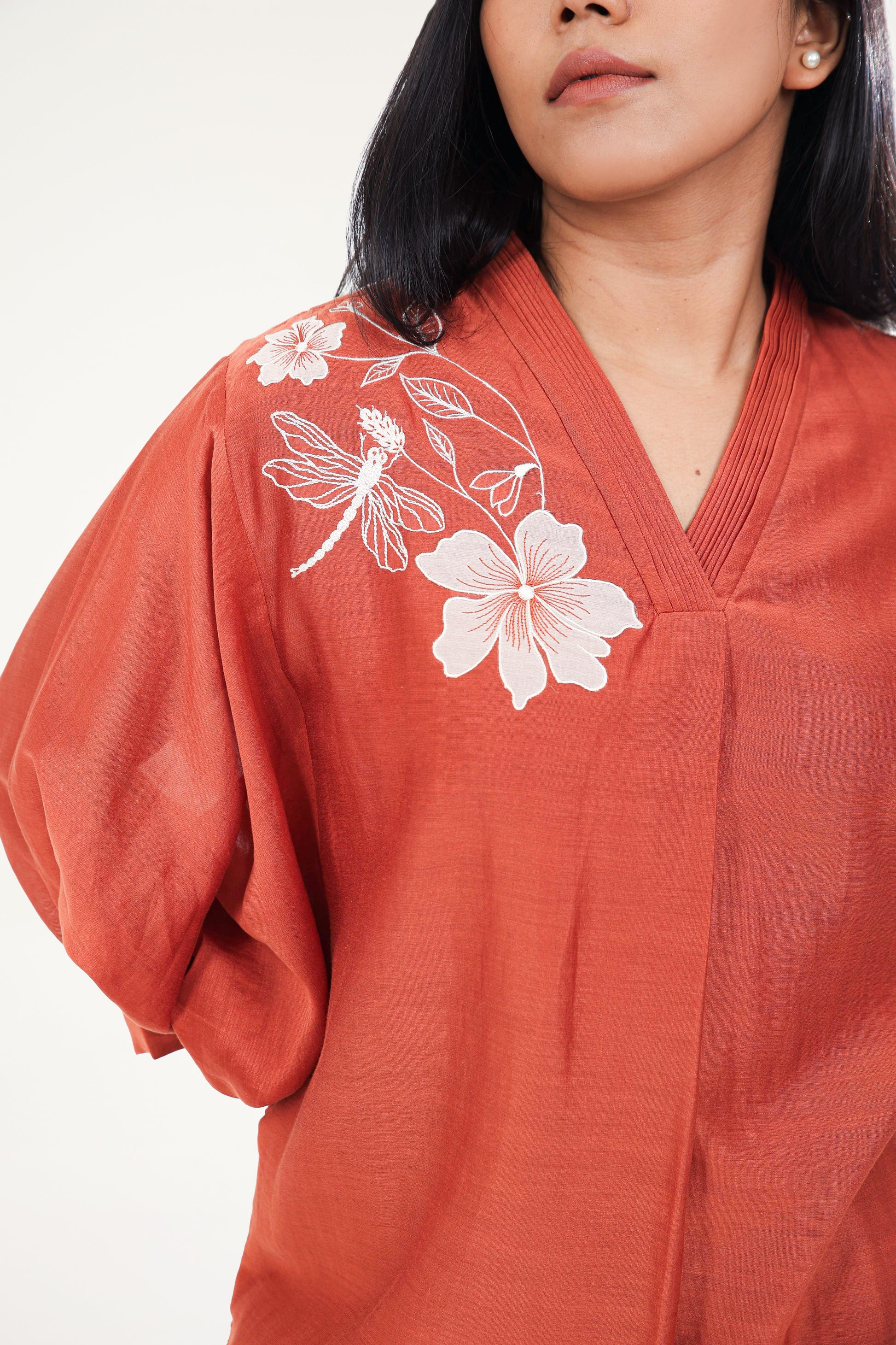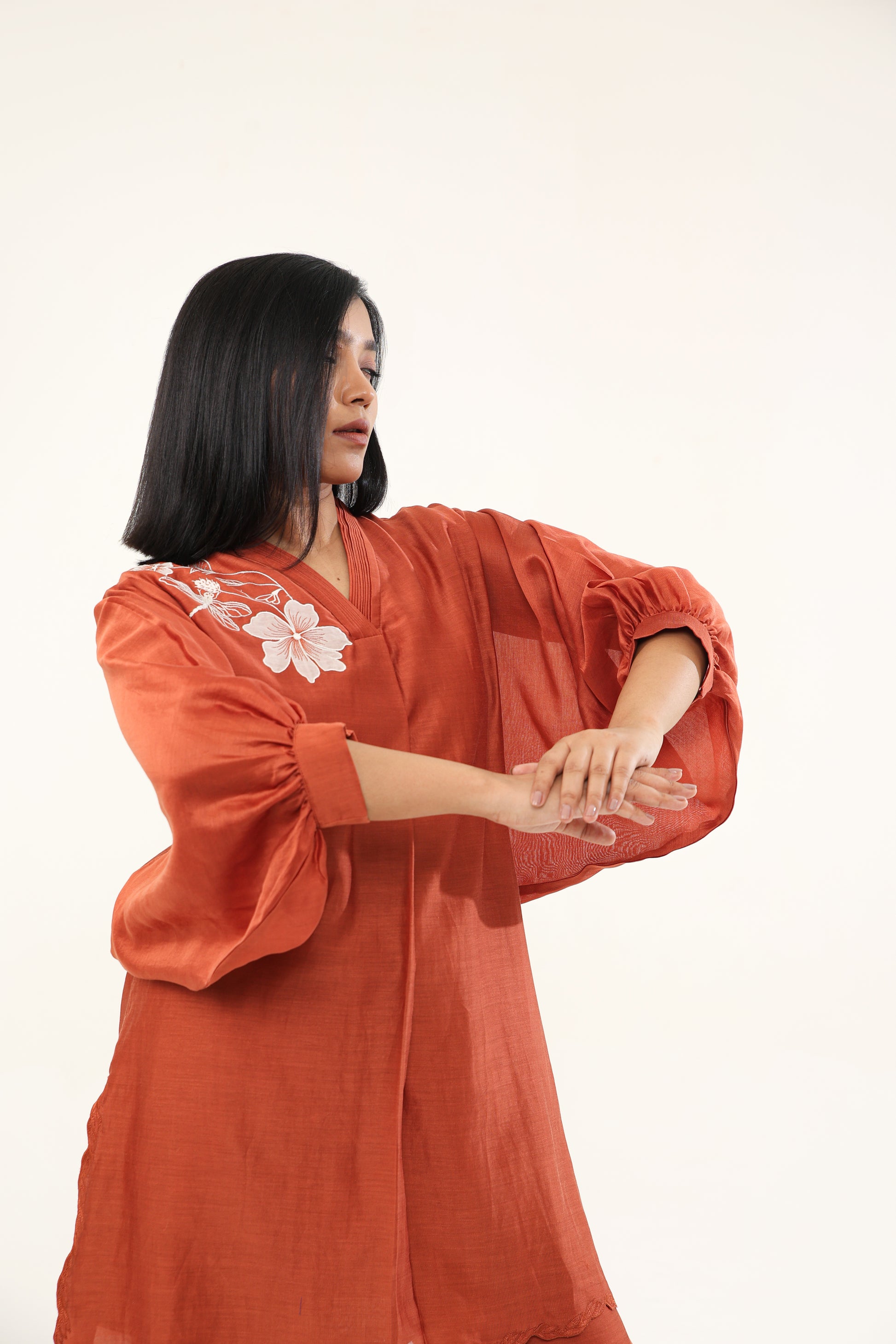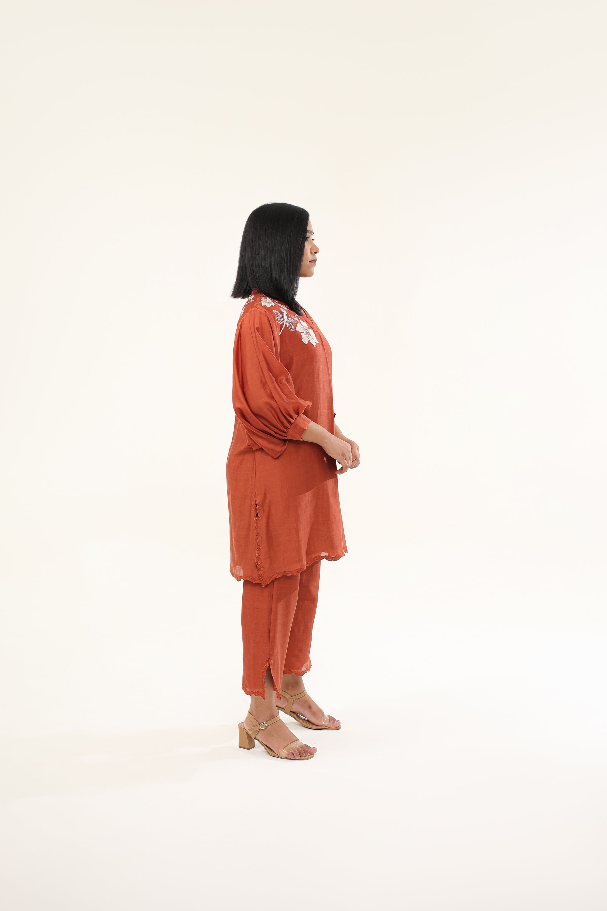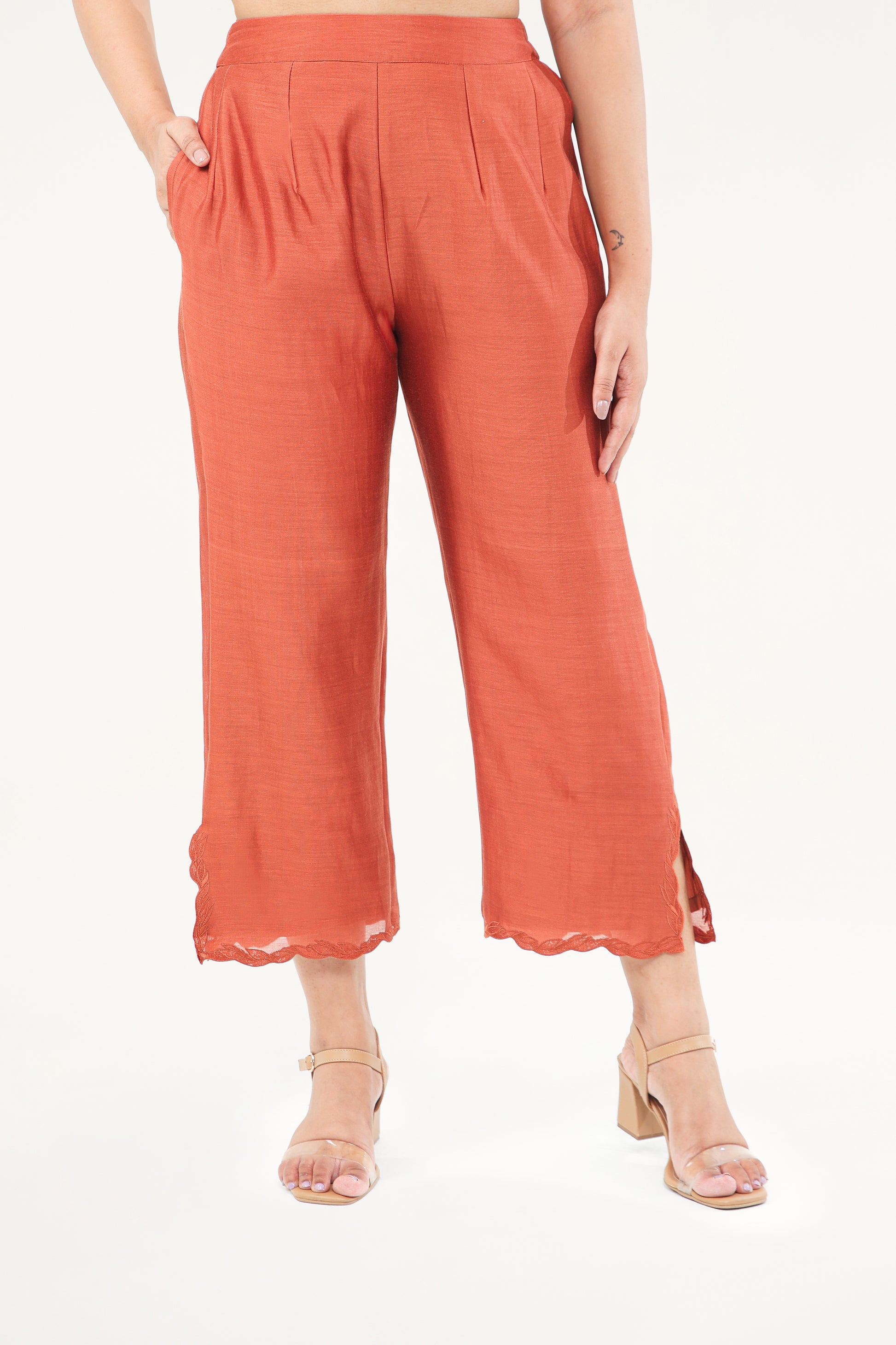 This Smart And Chic Suit Set Features Exquisite Threadwork And Appliqué Around The Neckline And Back Yoke, With Pintuck Detailing On The Neckline Border. The Comfortable Lantern Sleeves Are Beautifully Accented With Threadwork And Scalloping At The Hemline. Paired With Pants That Showcase Intricate Threadwork And Scalloping At The Hemline And Slit.