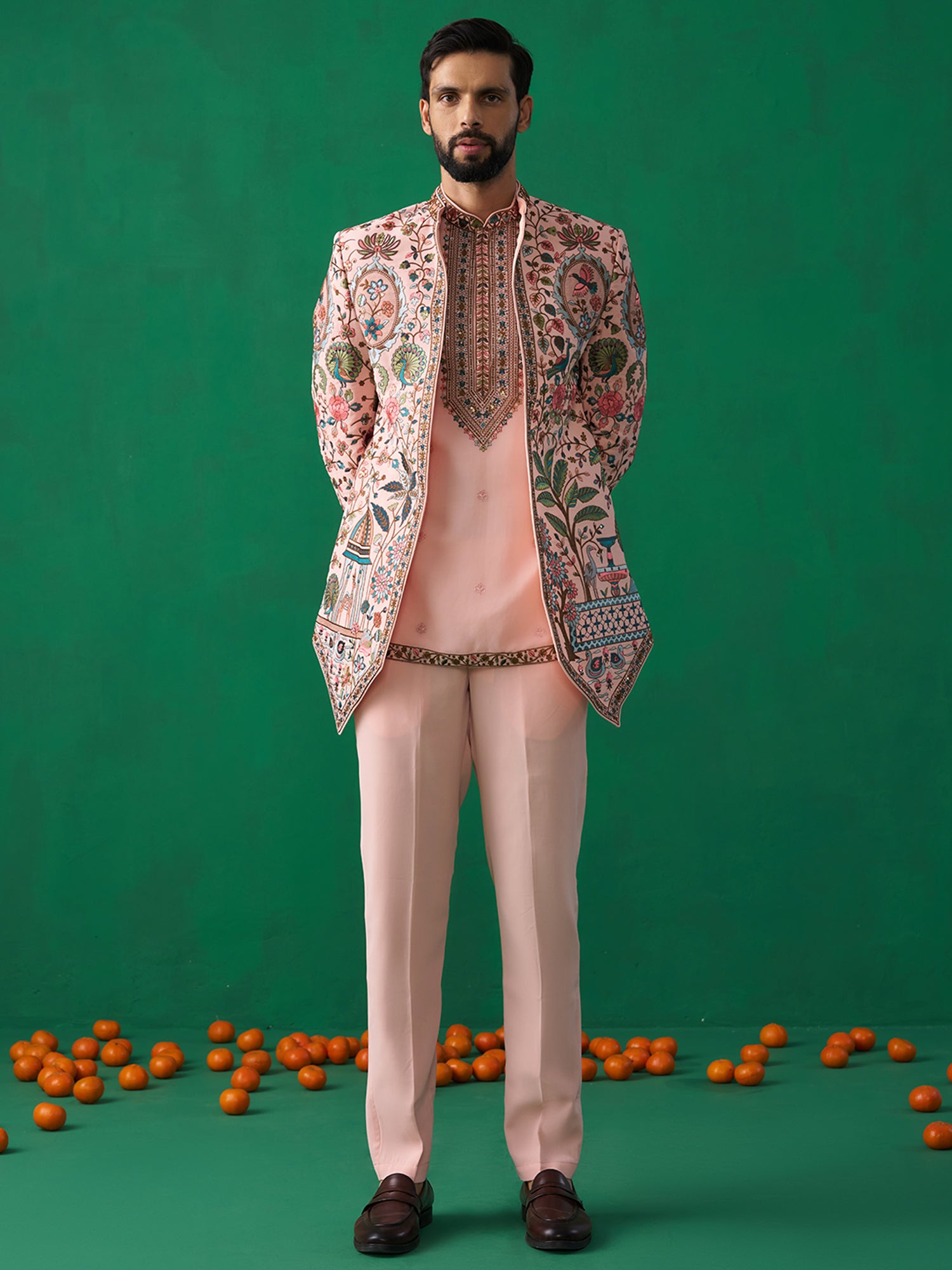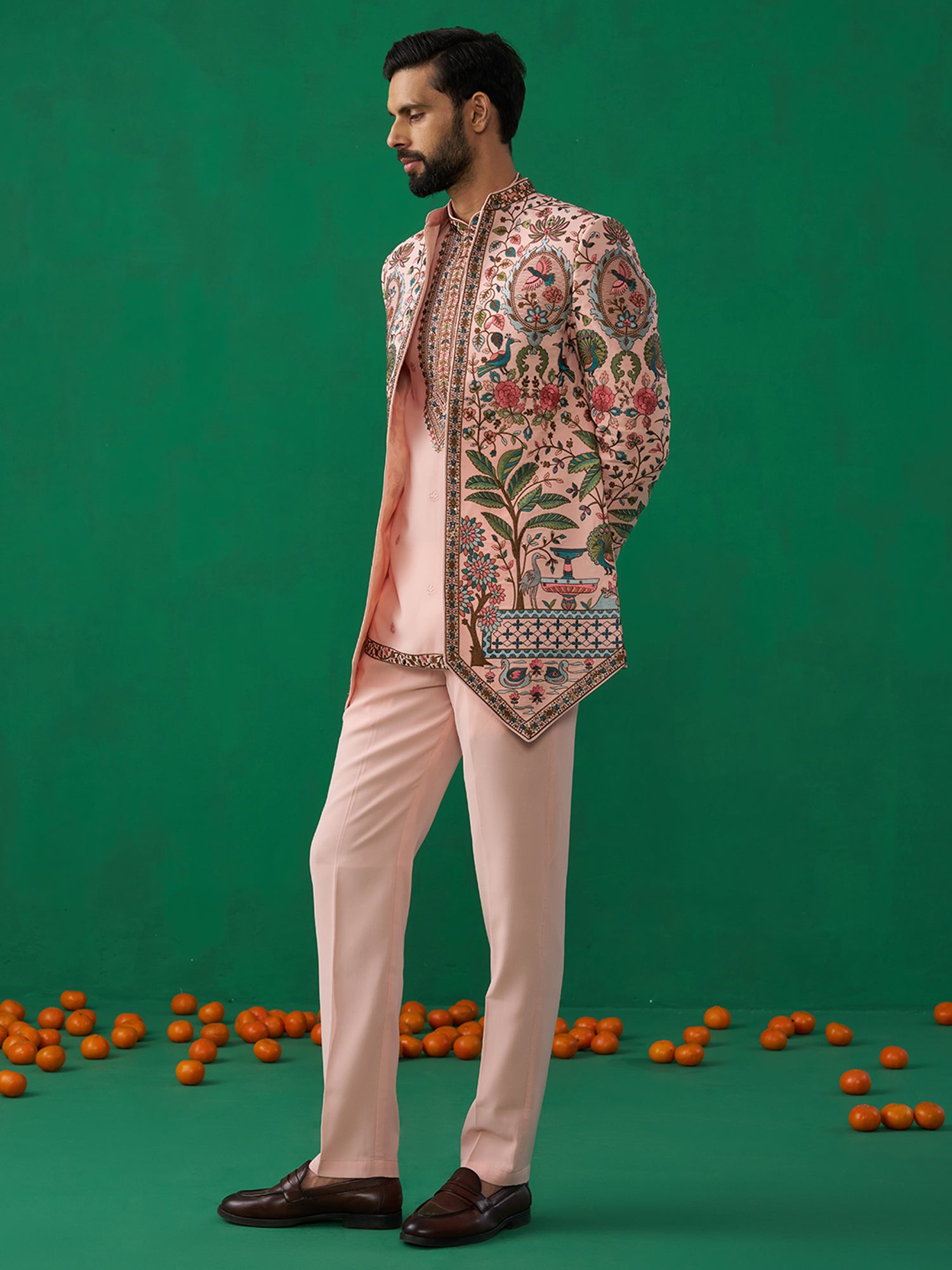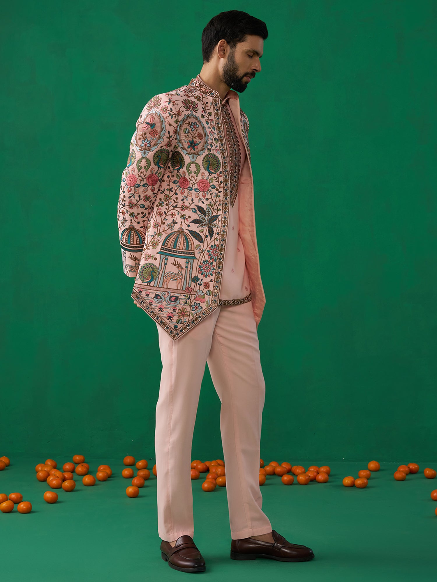 This Jodhpuri Set Features A Long, Structured Jacket With A Bandhgala Neckline, Richly Adorned With Intricate Embroidery And Ornate Motifs Inspired By Traditional Art Forms. The Detailed Work Extends Across The Front And Sleeves, Framed With Embroidered Borders. It Is Paired With A Shirt Showcasing Elaborate Embroidery Along The Placket And Hemline, Completed With Tailored Trousers. The Ensemble Exudes Regal Elegance, Blending Classic Craftsmanship With A Contemporary Silhouette.