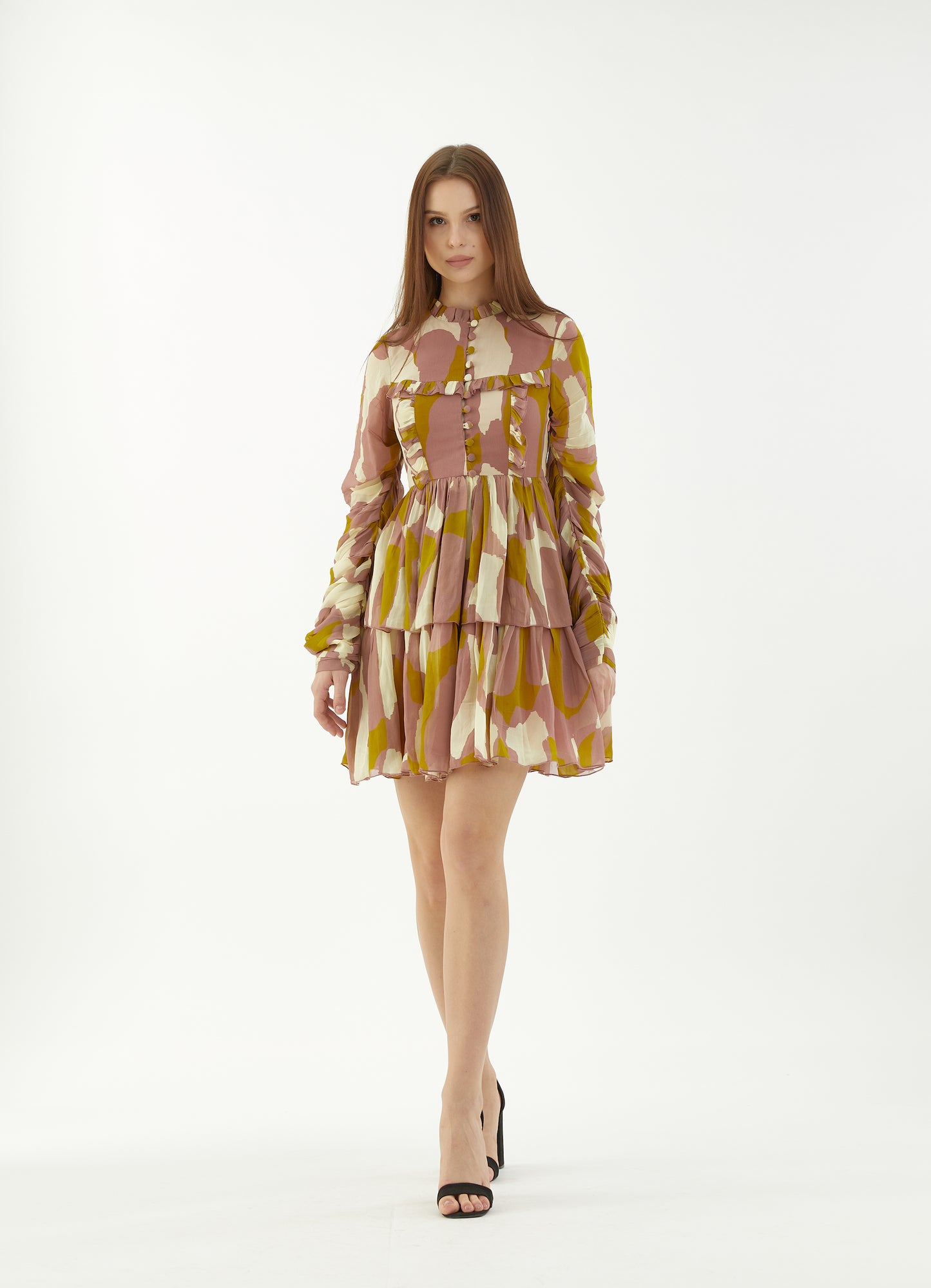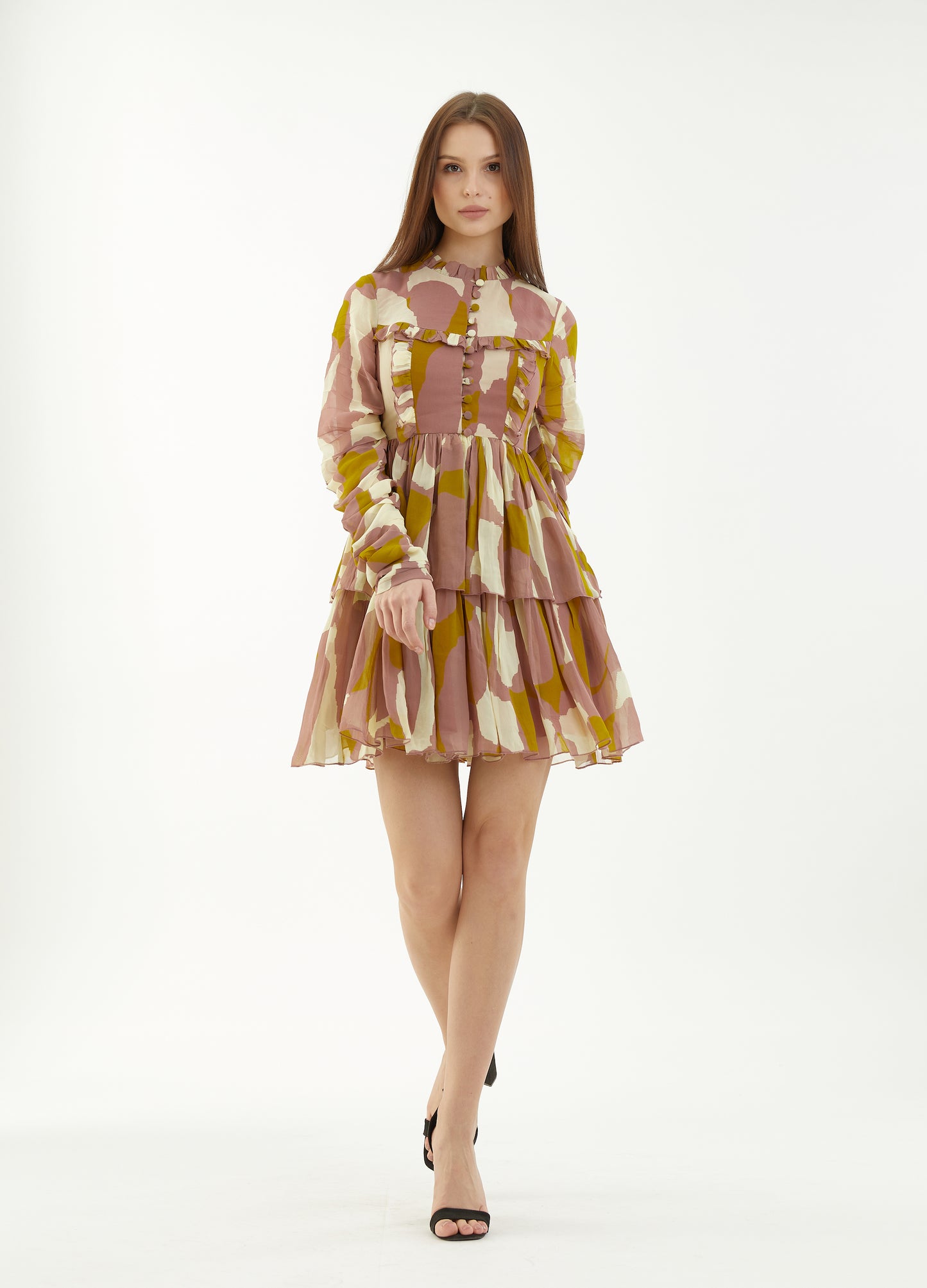 Peach, Mustard And Cream Frill Short Dress Based On Georgette Features Abstract Print With Ruffle Detailing And Churidar Sleeves.