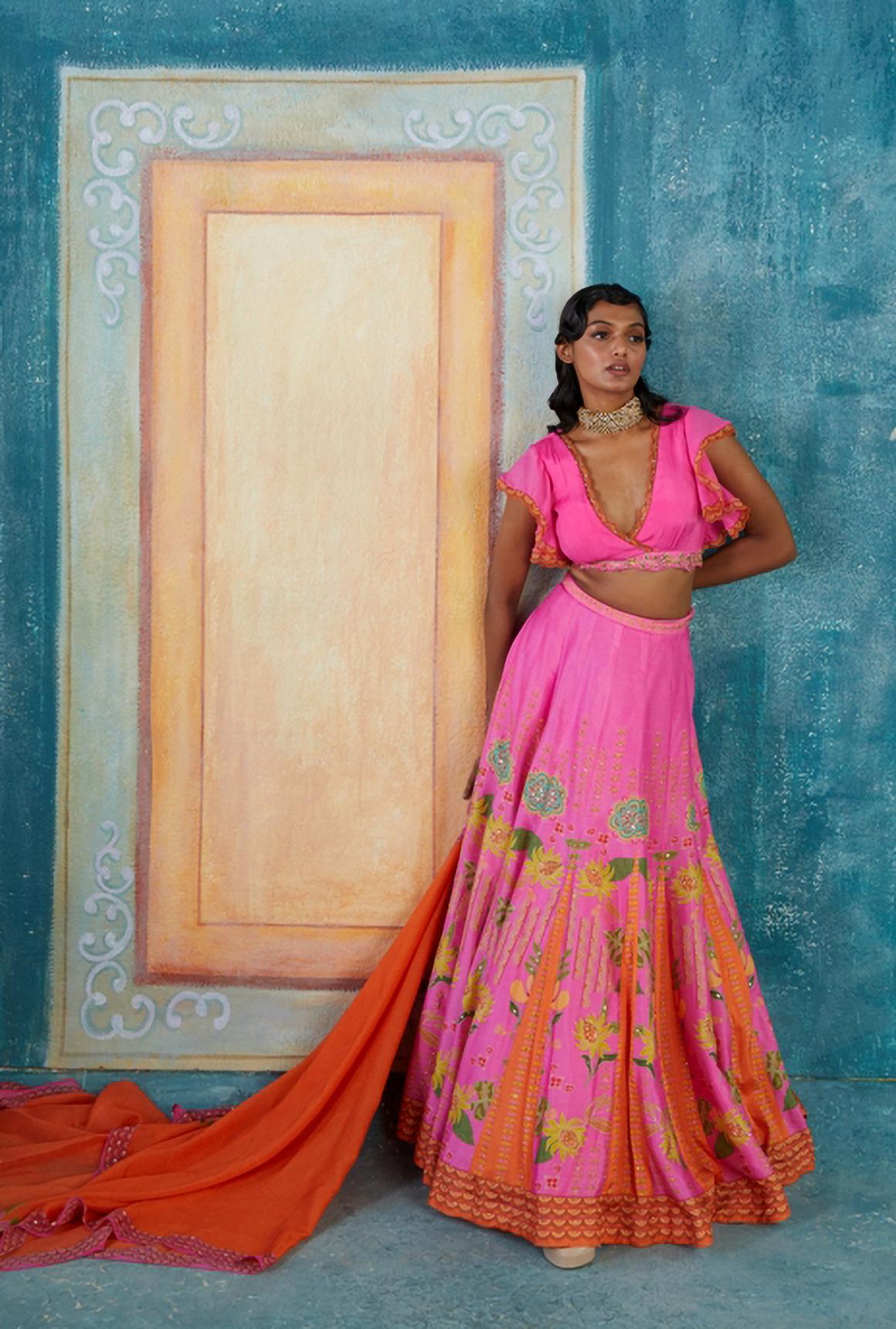 Fuschia Pink Printed Lehenga Set Embellished With Hand Embroidery V- Neckline ,Frill Sleeve And Printed Organza Dupatta.