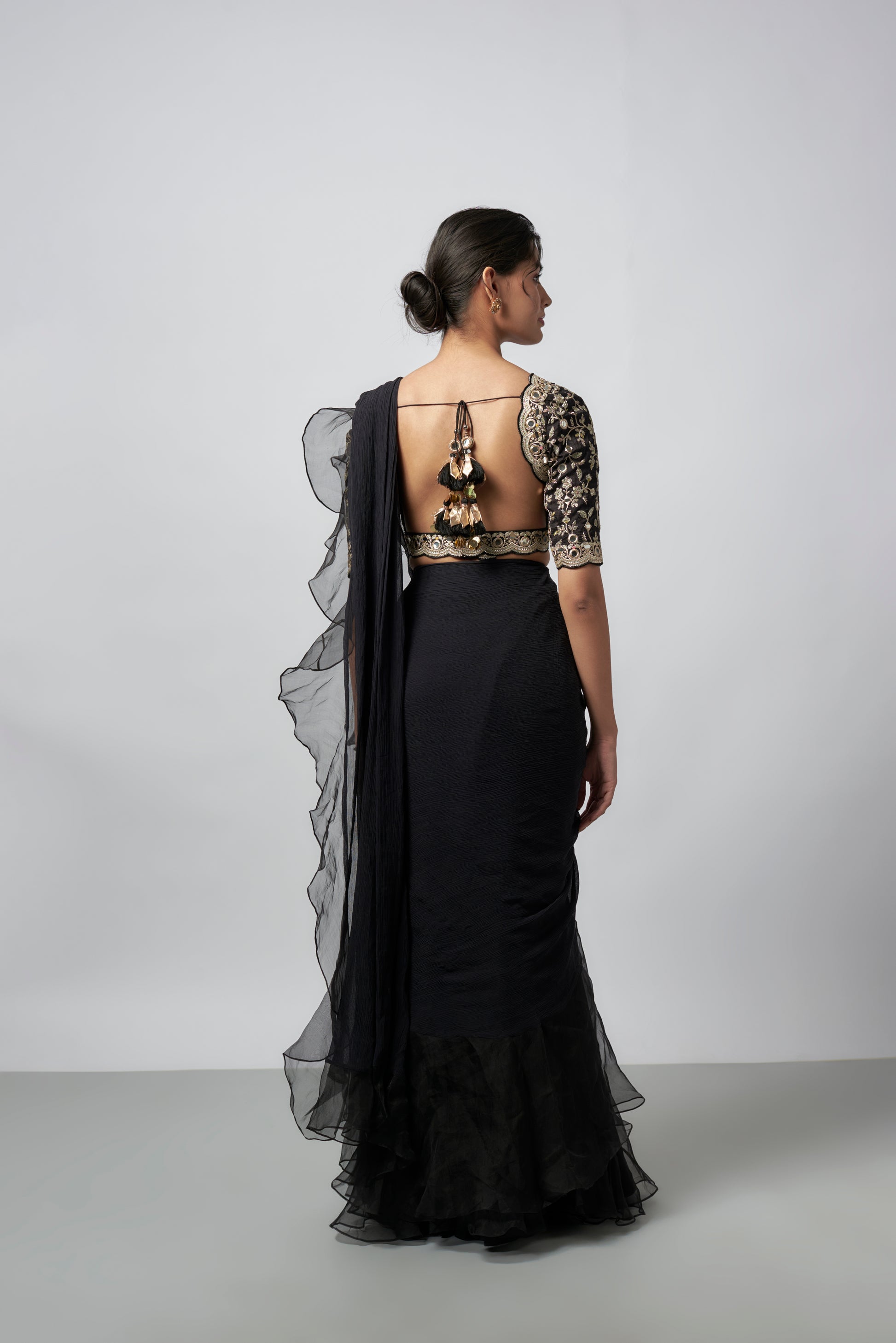 This Saree Features Cascading Layers Of Soft Ruffles, Creating A Dramatic And Fluid Silhouette. Paired With A Stunning Hand Embroidered, Mirror-Embellished Blouse The Outfit Blends Traditional Craftsmanship With Contemporary Design.