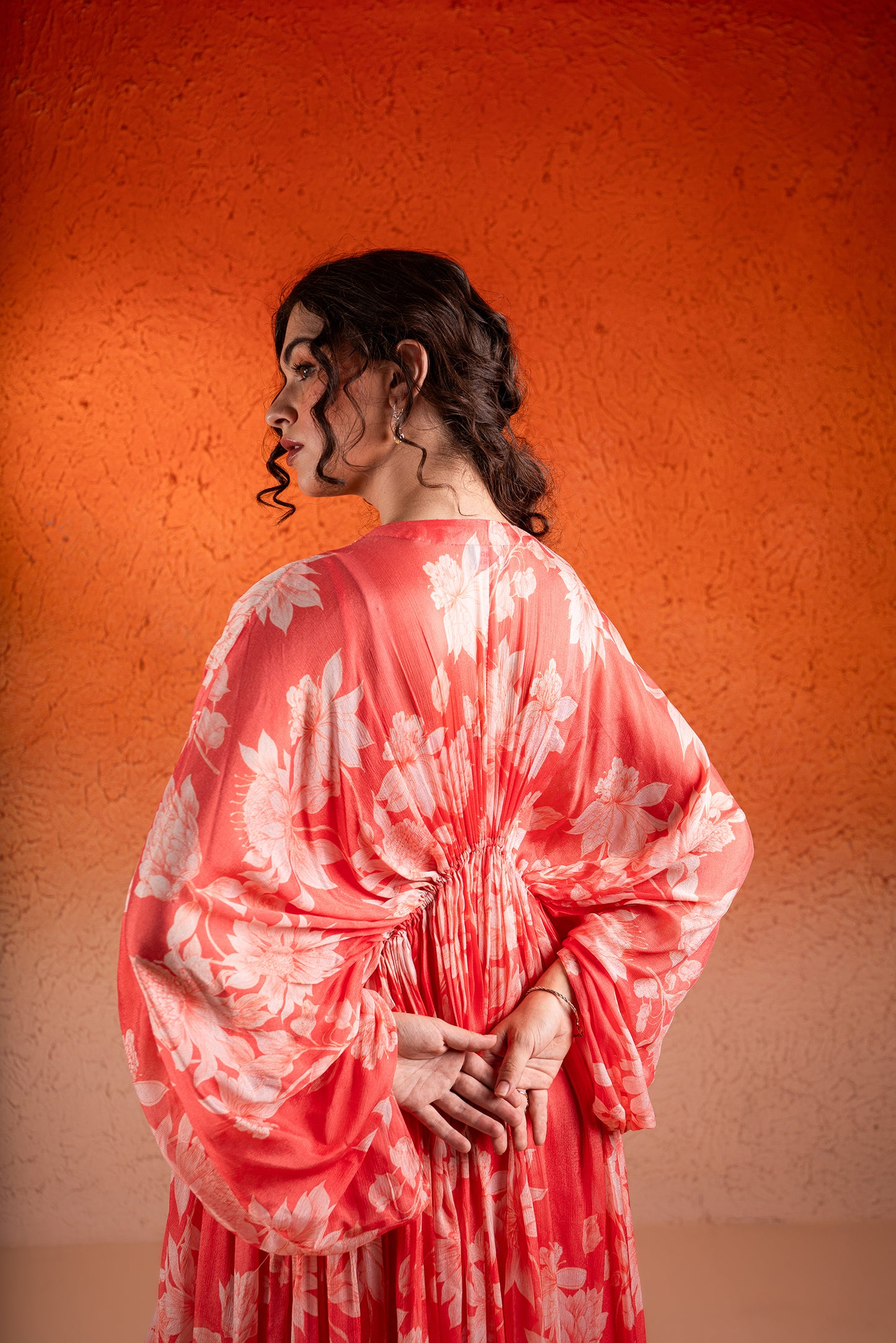Georgia Peach Printed Tie-Up Kaftan Set With Draw String And Tassel. It Comes With Inner.