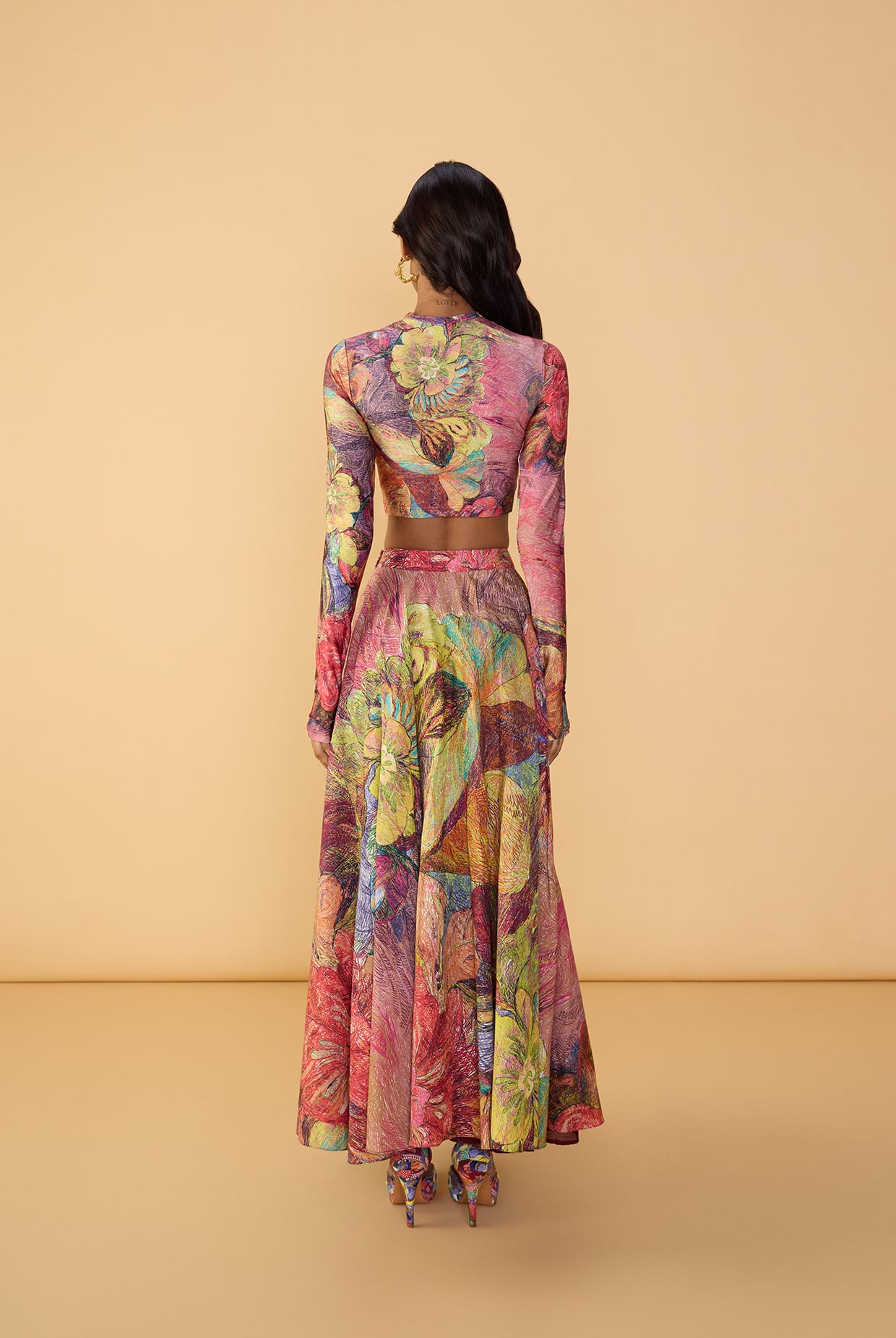 Skirt : Abstract Floral Placement Print, High Waist, Flared Maxi Skirt.