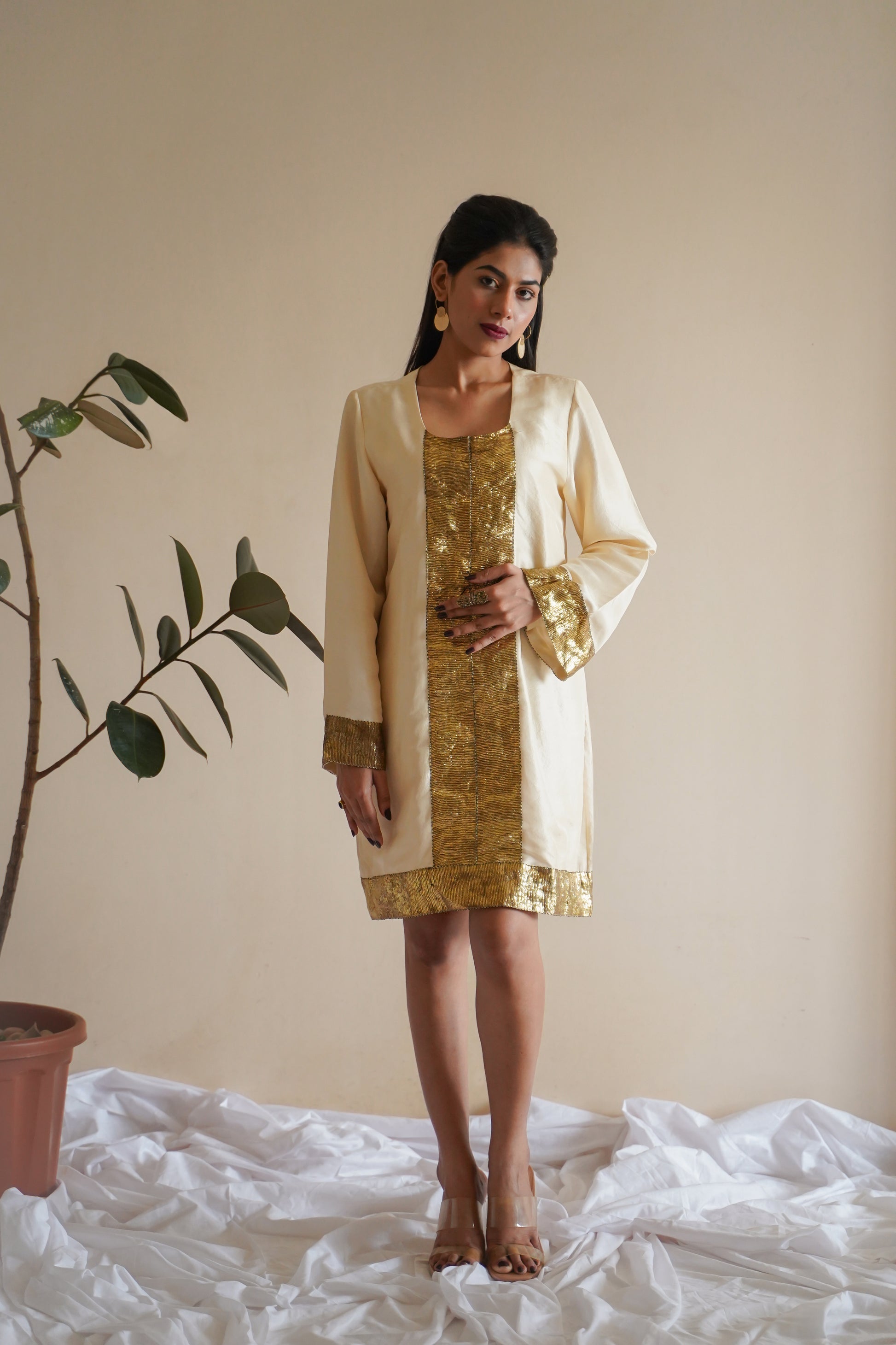 Cream Silk Knee Length Dress With Gold Foil Detailing.