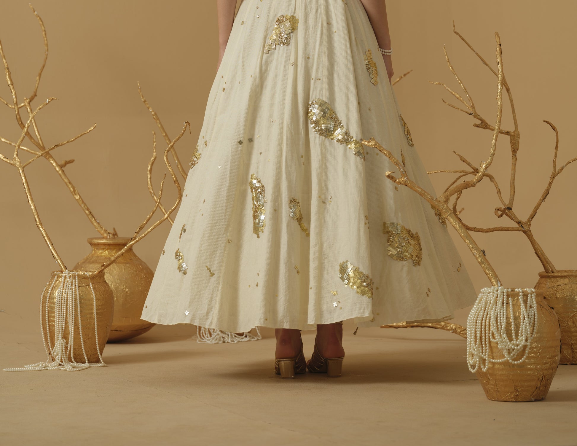 Featuring A Ruched Tube Top With Front Cross Strap Paired With Flared Skirt Having Scattered Geometrical Embellishment And Frill Dupatta.