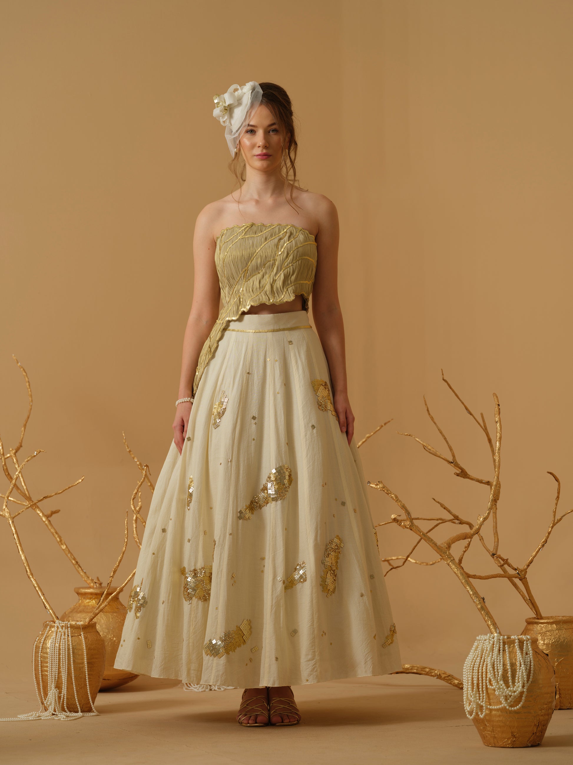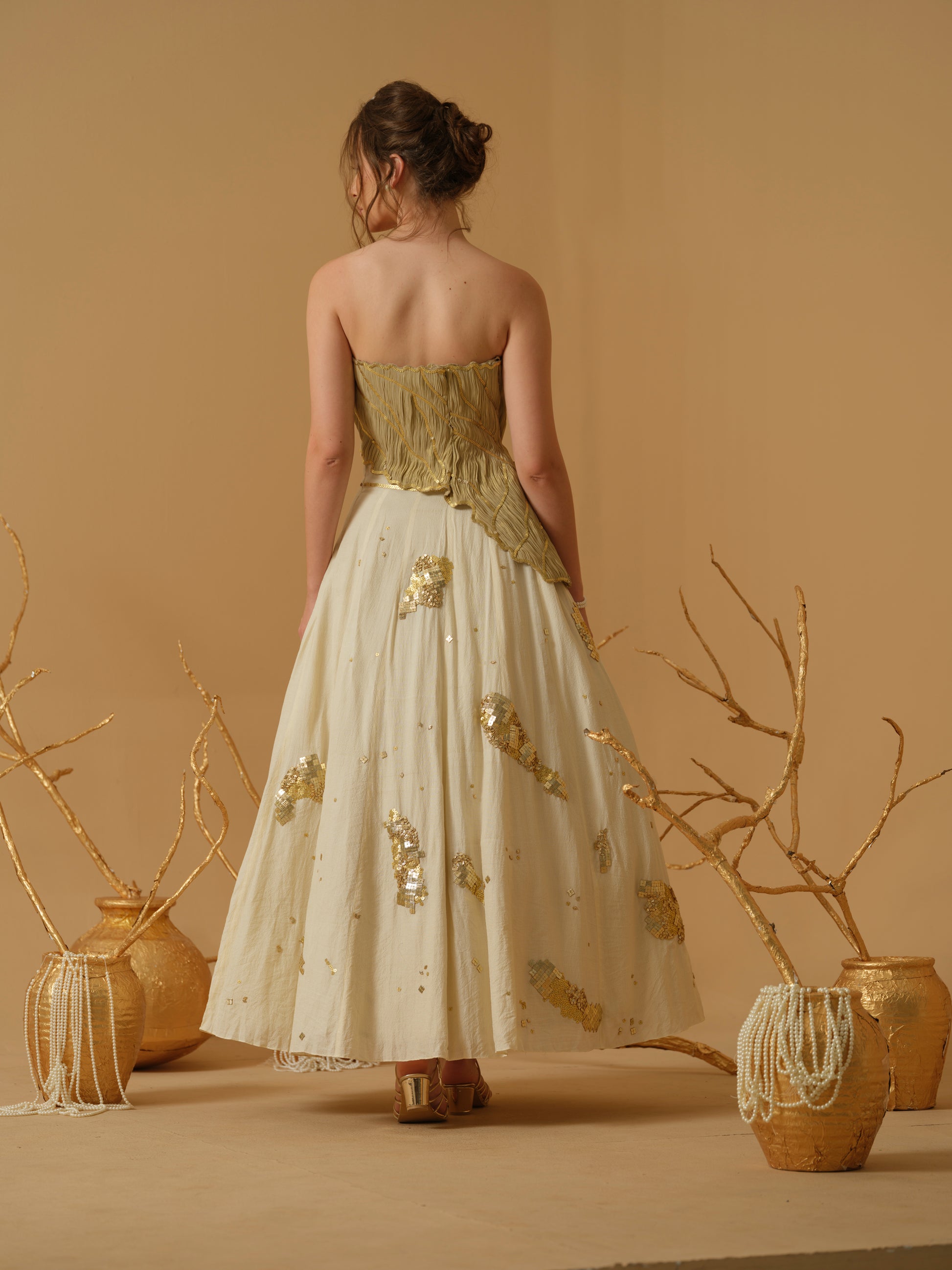 Featuring A Flared Skirt Having Scattered Geometrical Embellishment Paired Up With Asymmetrical Ruched Tube Top Embellished With Gold Sequins Lines.