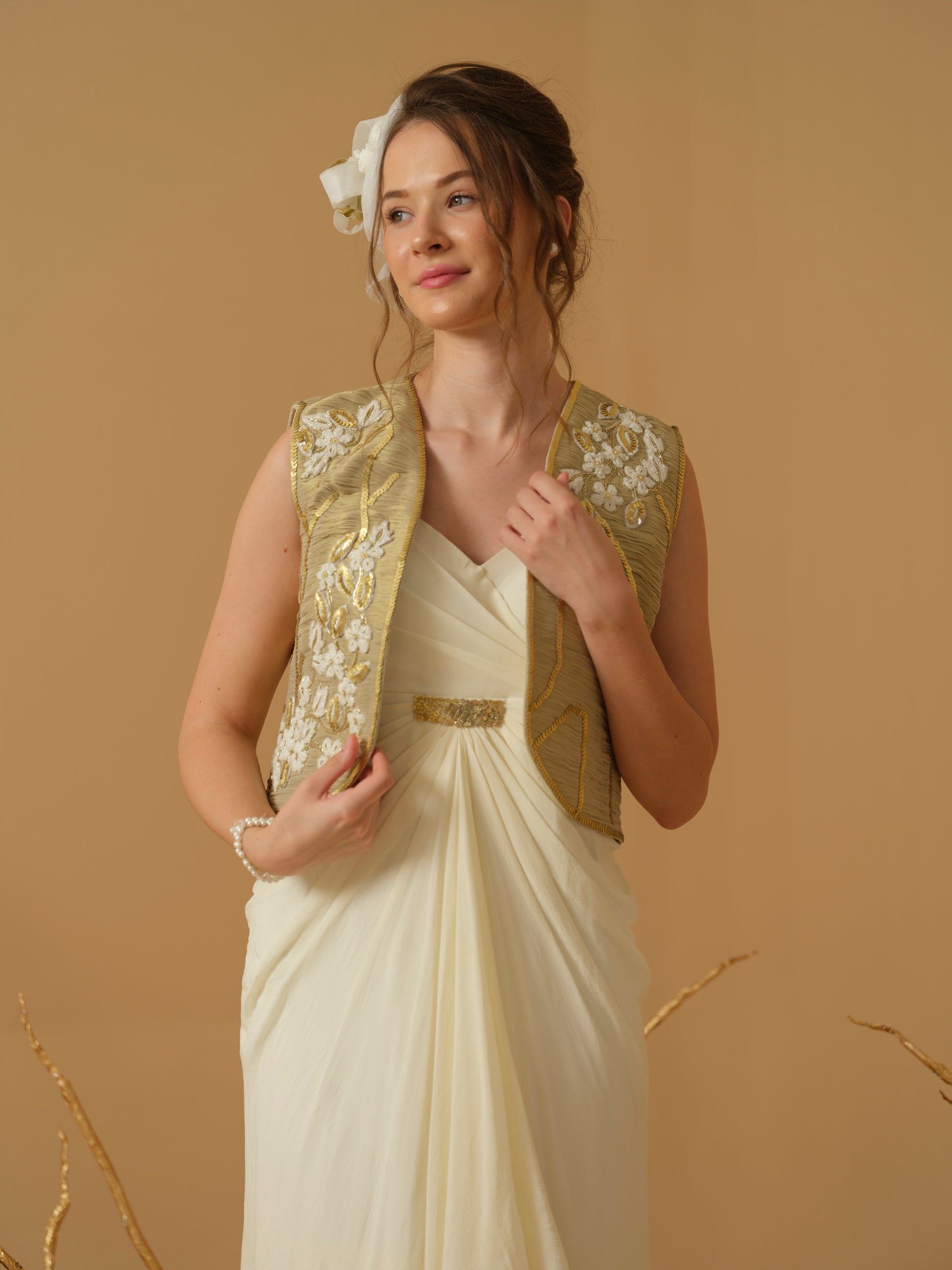 Ruched Open Jacket (Only) Having Floral Placement Embroidery.